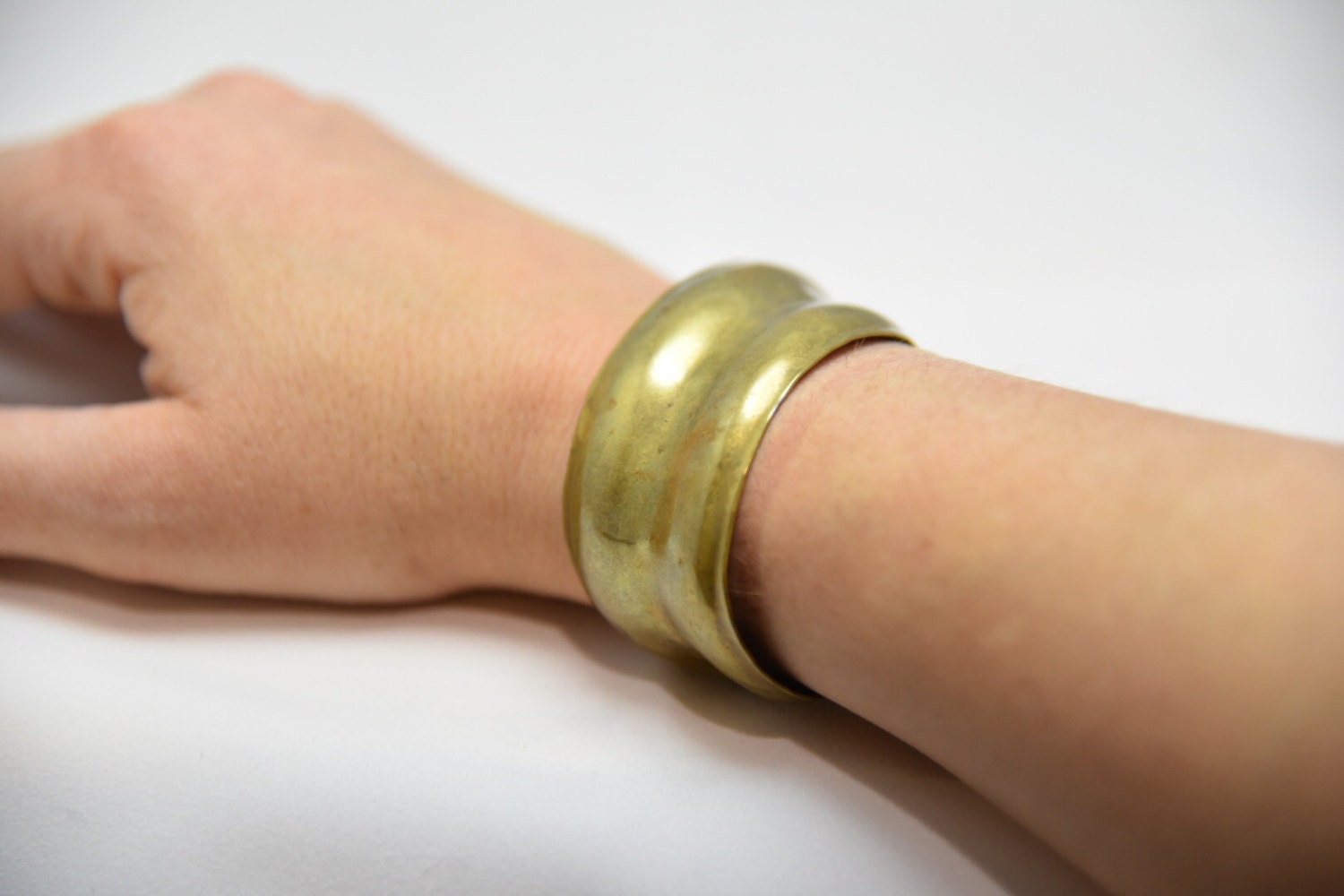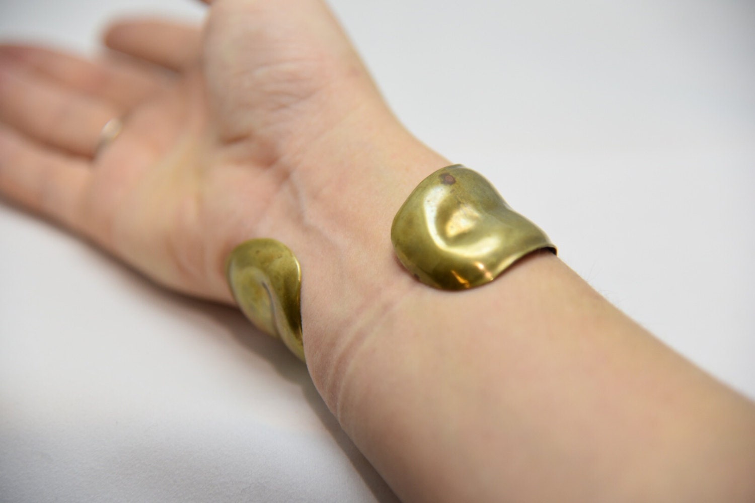 This is an awesome barbaric, hand hammered and formed brass asymmetrical cuff bracelet. It swirls around the arm in such a unique and beautiful way. I love it. Excellent condition, no issues.