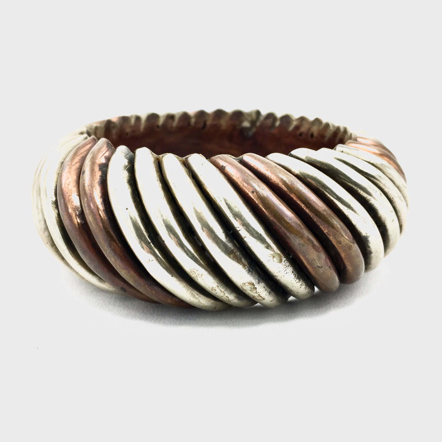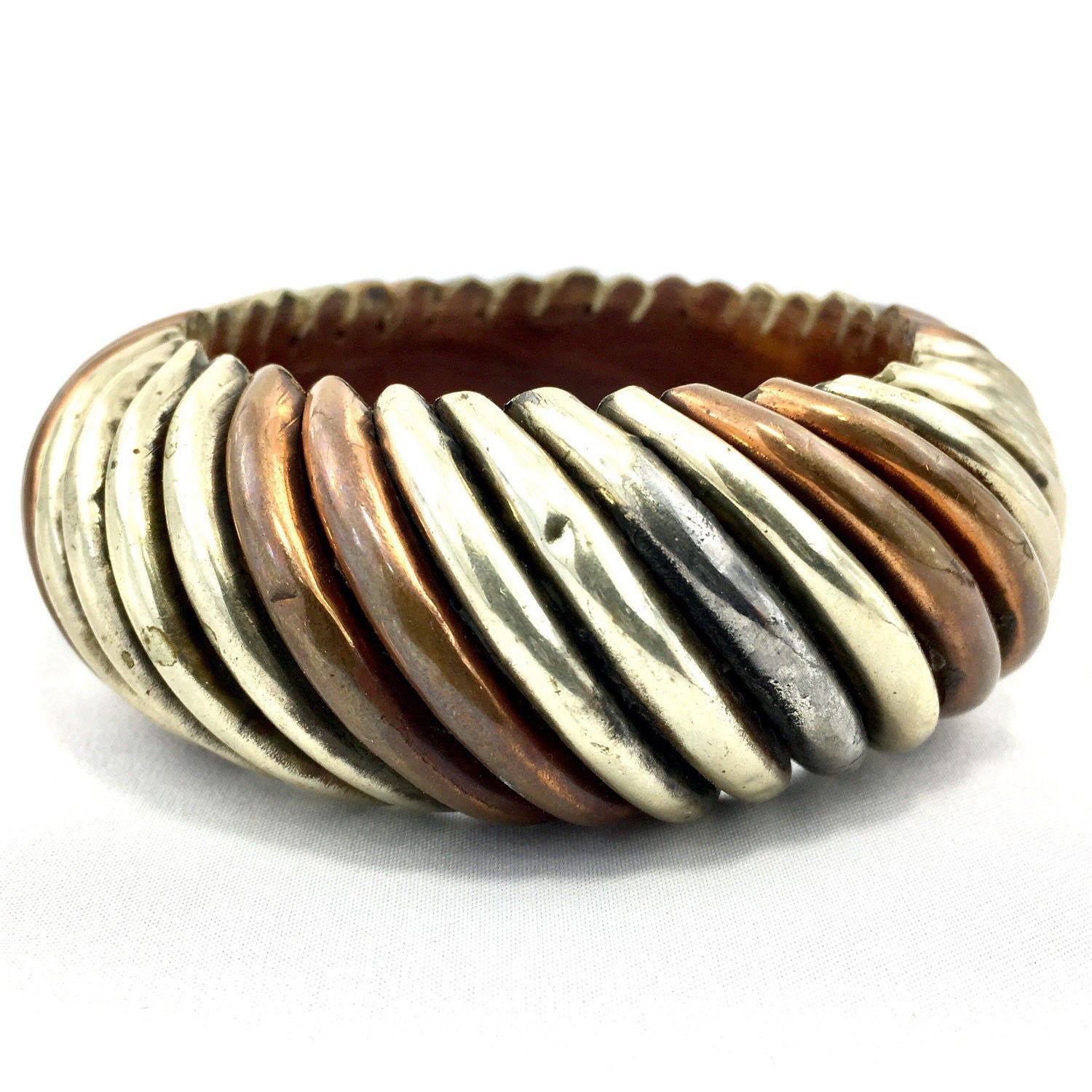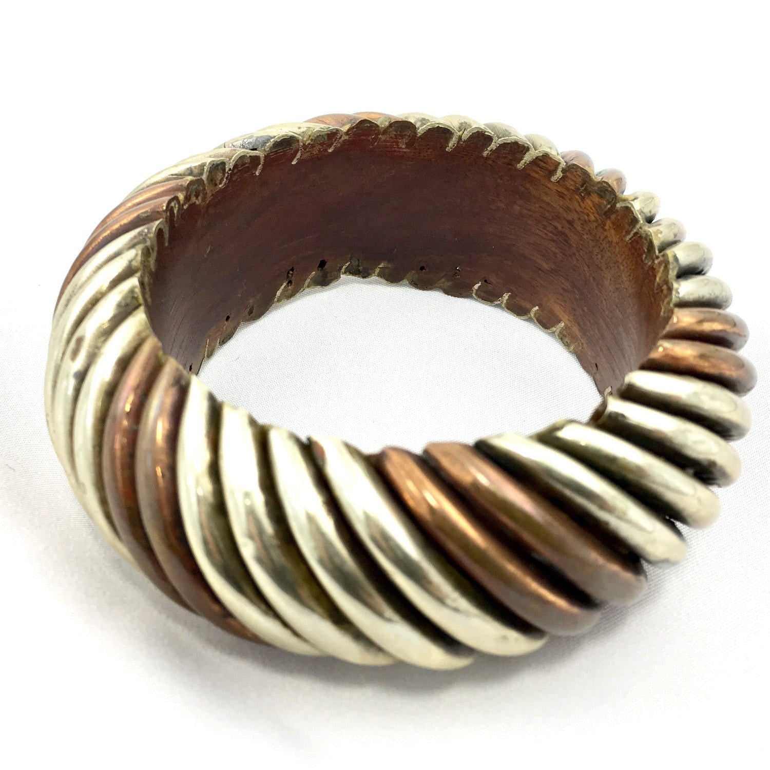 1970 Mixed Metal Bangle Bracelet Chunky Wooden Copper Silver Brass