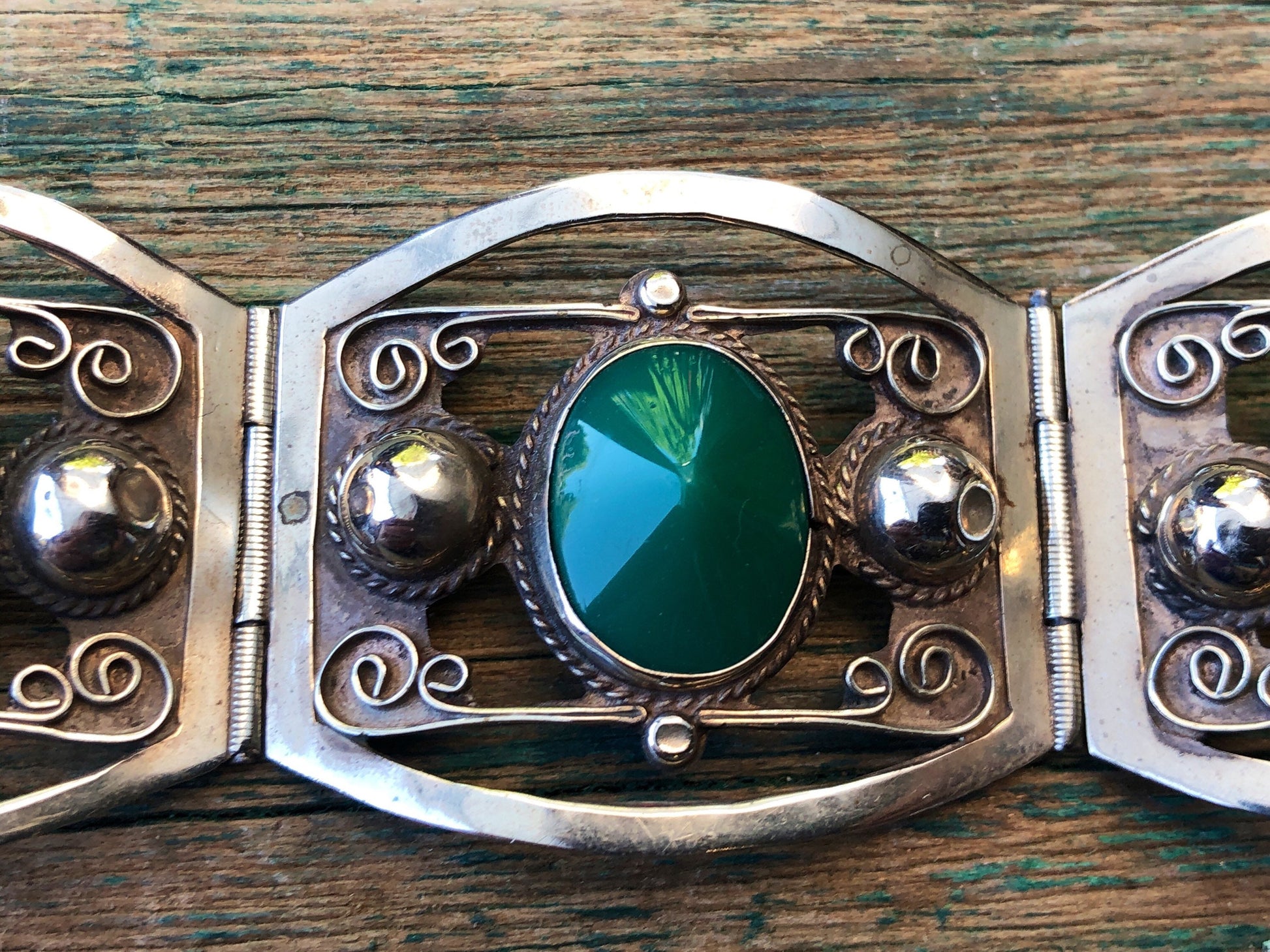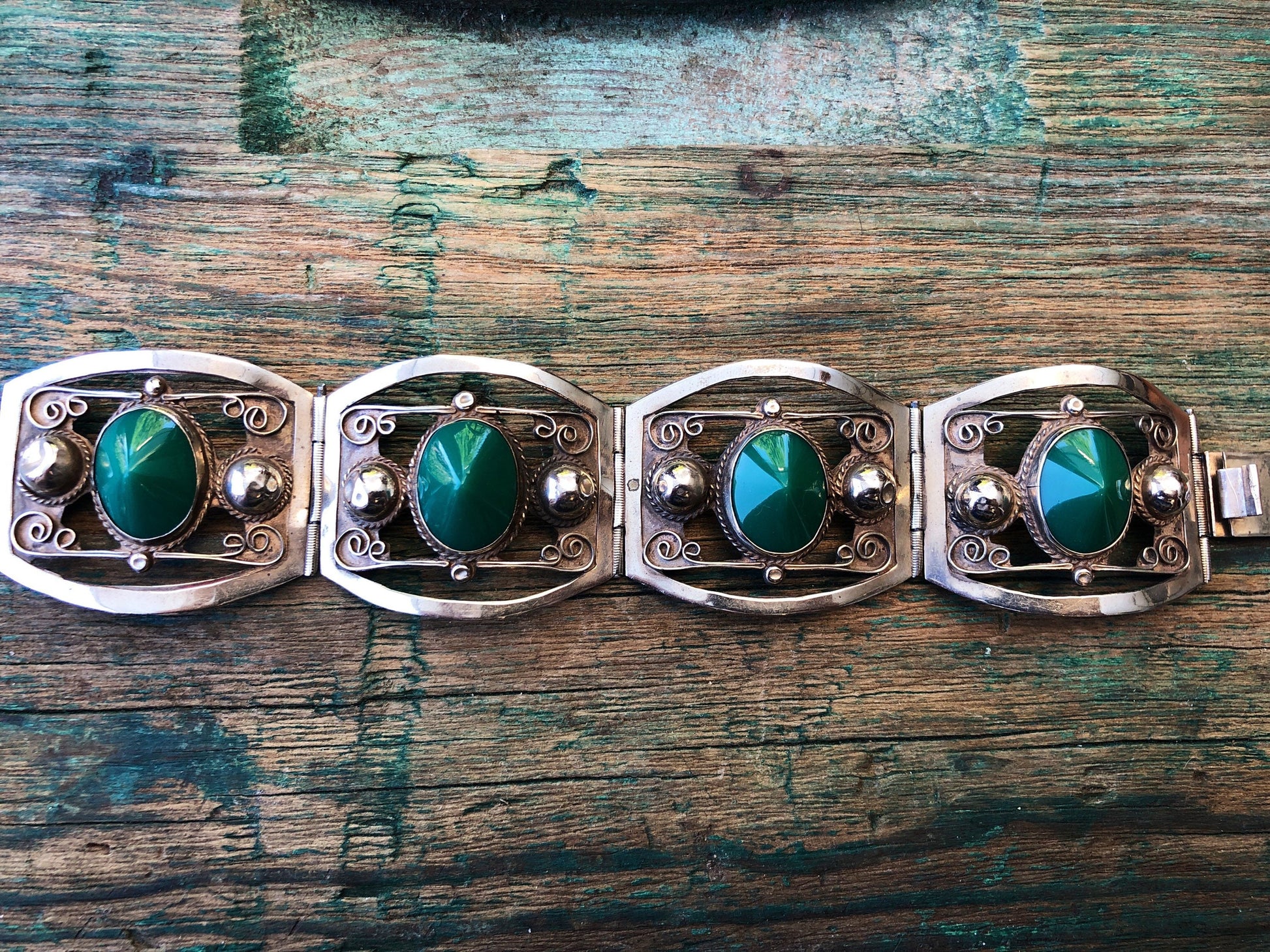 Sterling Silver Mexican Taxco Green Chrysoprase Art & Craft Panel Link Bracelet