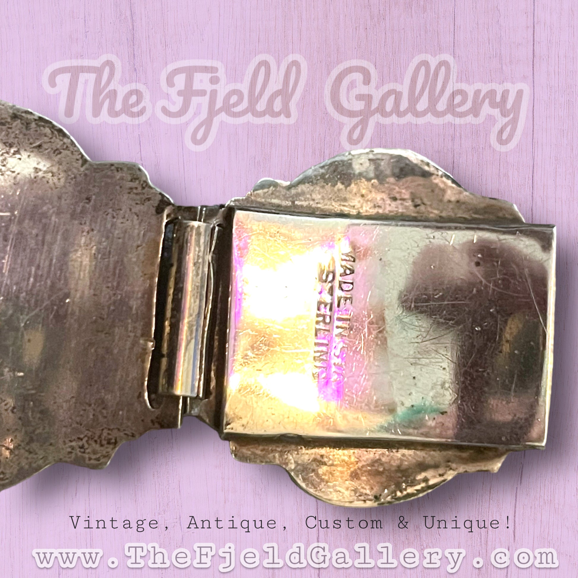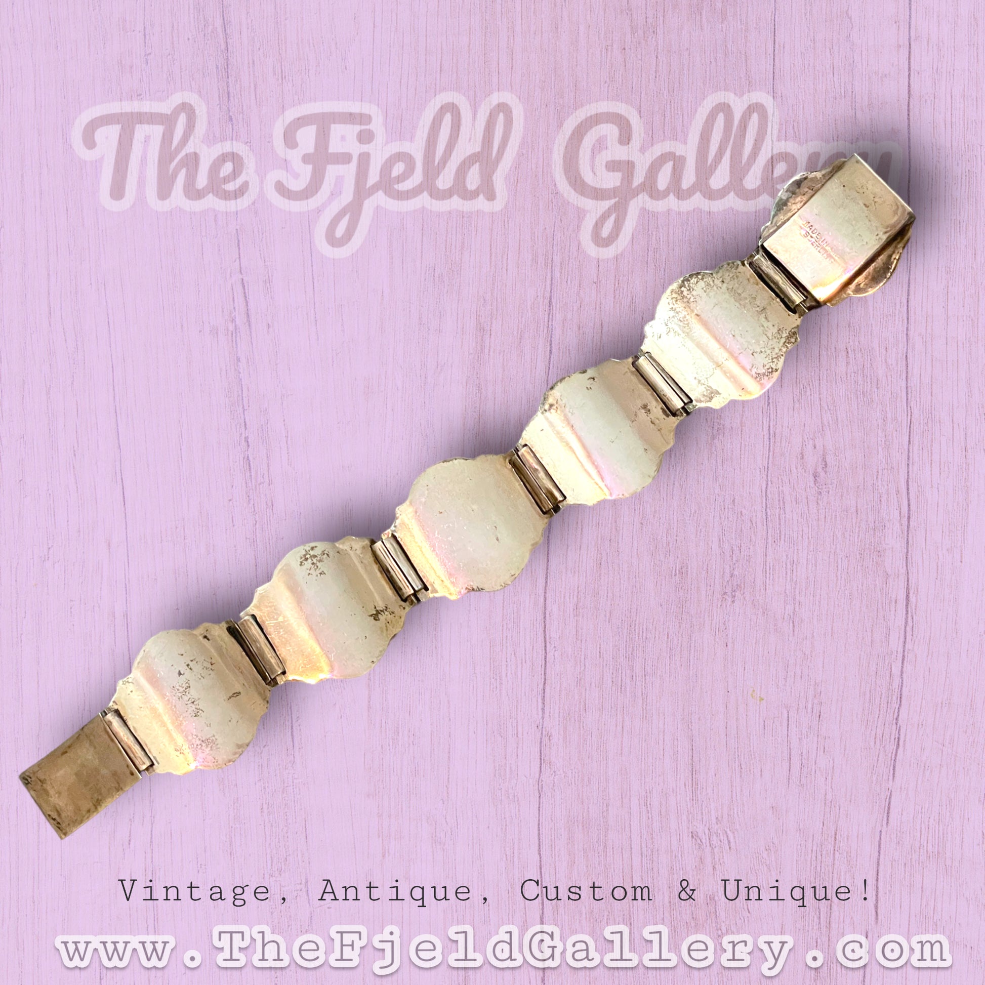 Vintage 1940’s Siam sterling silver nielloware link bracelet. Each link features a god or goddess of Siamese lore. Each panel has Mekkelah the lightning goddess, Ramasoon the Thunder god and the Dancing Angel alternating. Hallmarked: Made in Siam Sterling. Has a box clasp and is secure. No damage or condition issues.