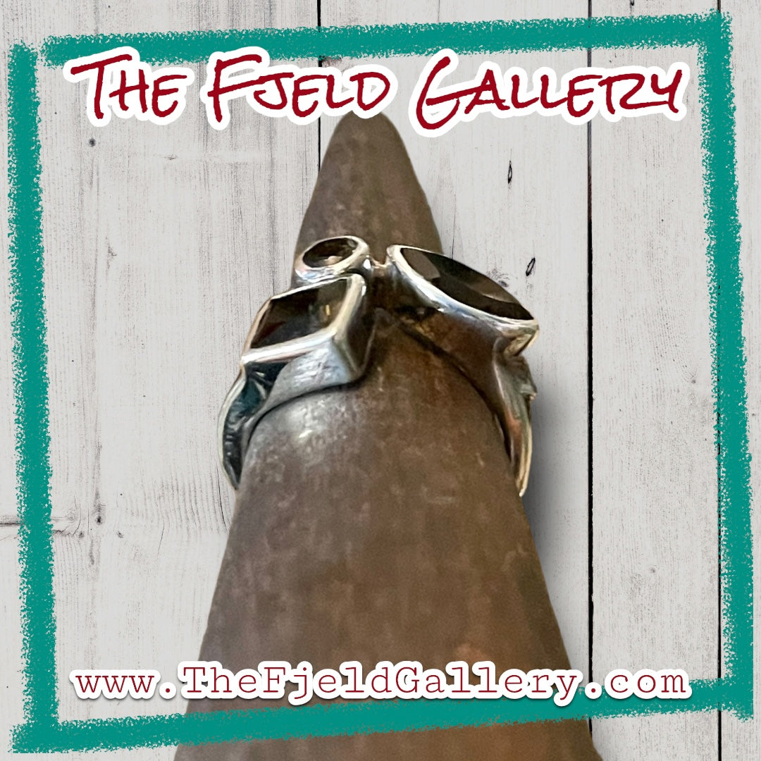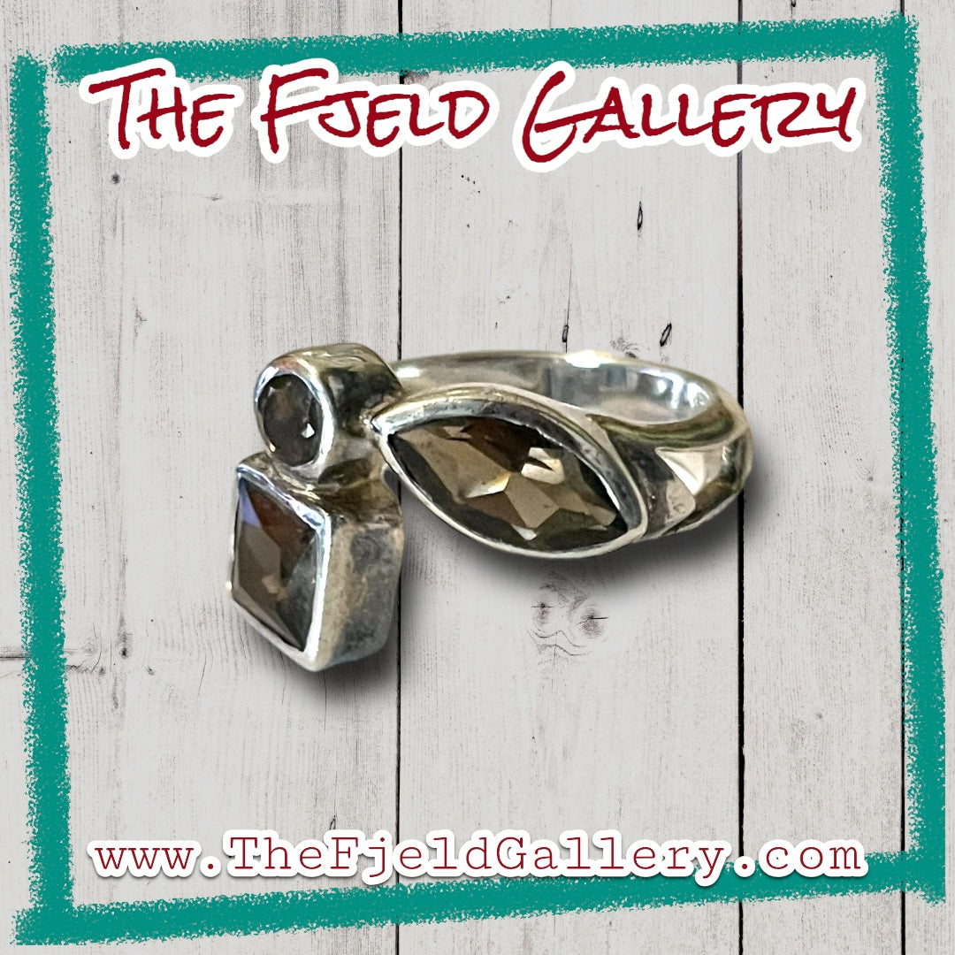 Unique 3 stone bezel set geometric smokey topaz gemstone ring.