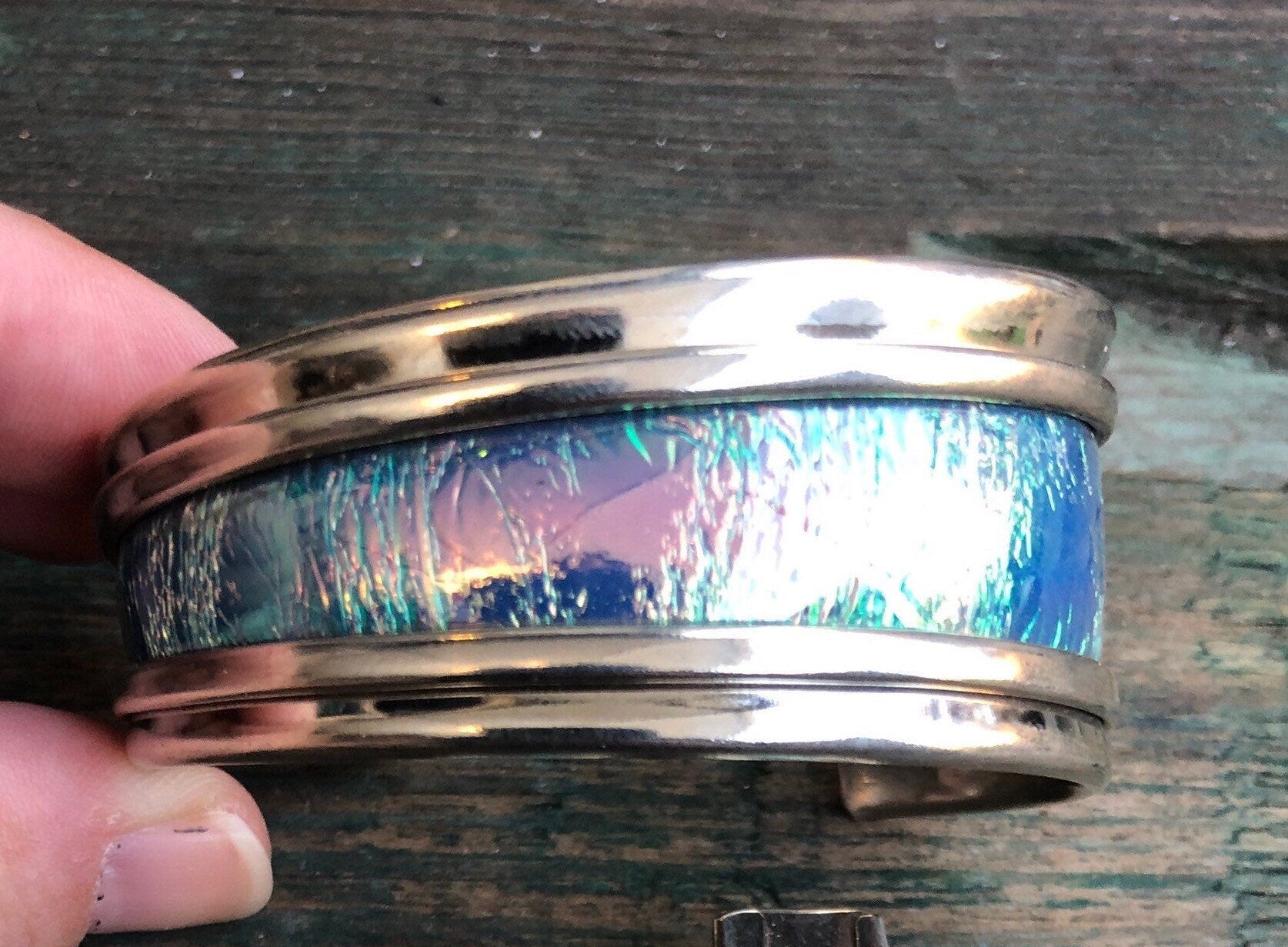 Sterling Silver & Abalone Mother of Pearl Color Inlay Abstract Modernist Cuff Fits comfortably up to 6.5 inch wrist. Dose not have much give, very sturdy. wide end 32mm / 1.25 inches skinny end 15mm / 5/8 inch 5 1/2 inches (14cm) with 1 1/2 inch (35mm) gap
