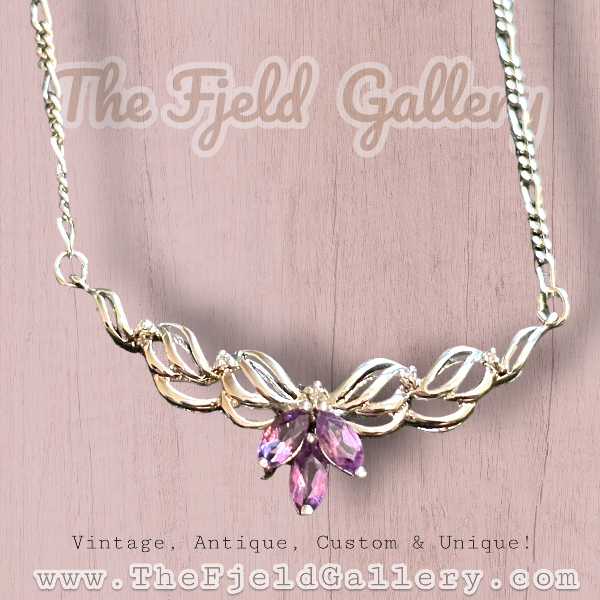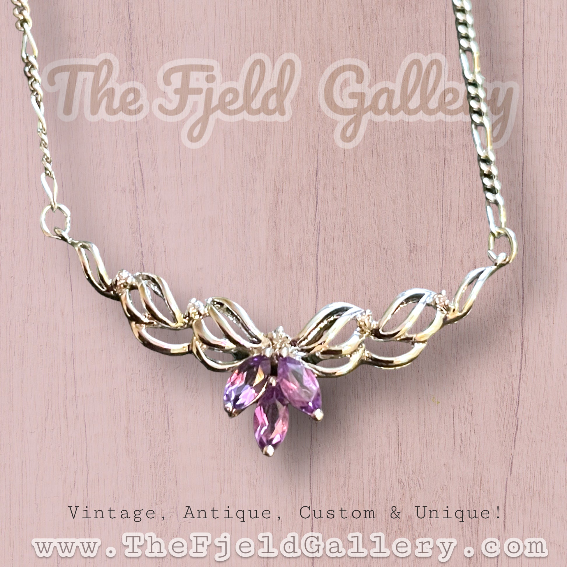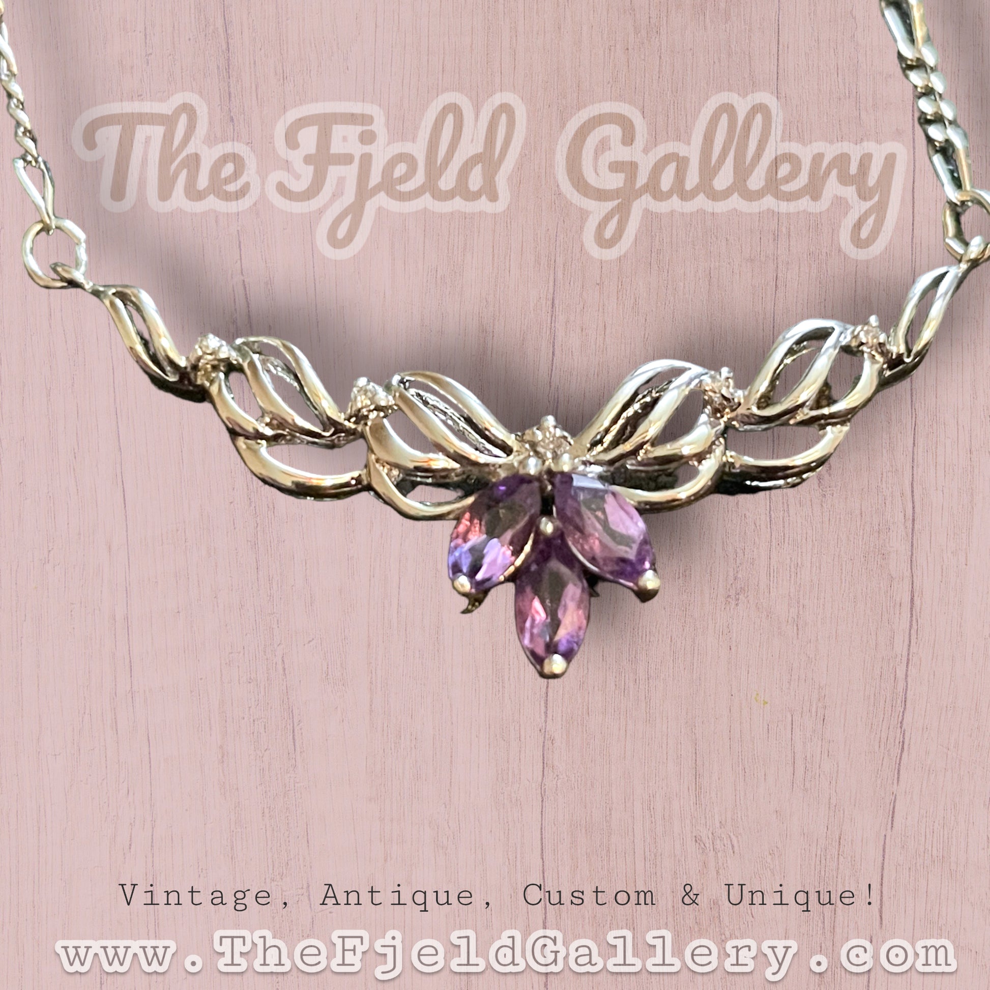 Beautiful vintage sterling silver necklace with genuine amethyst gemstones and diamond chips.