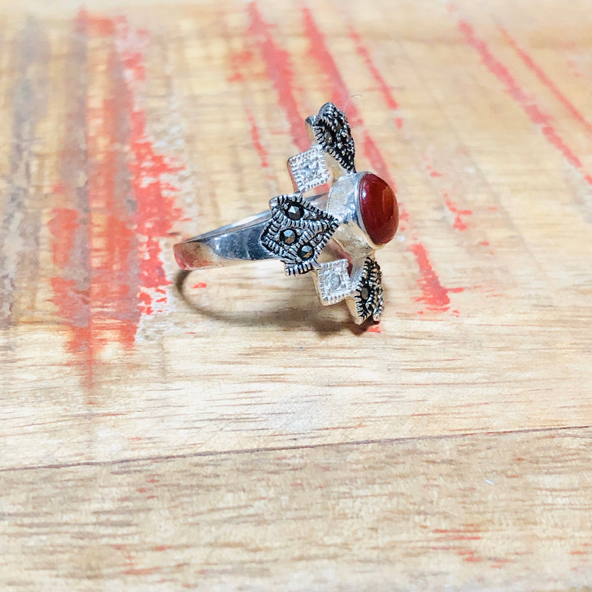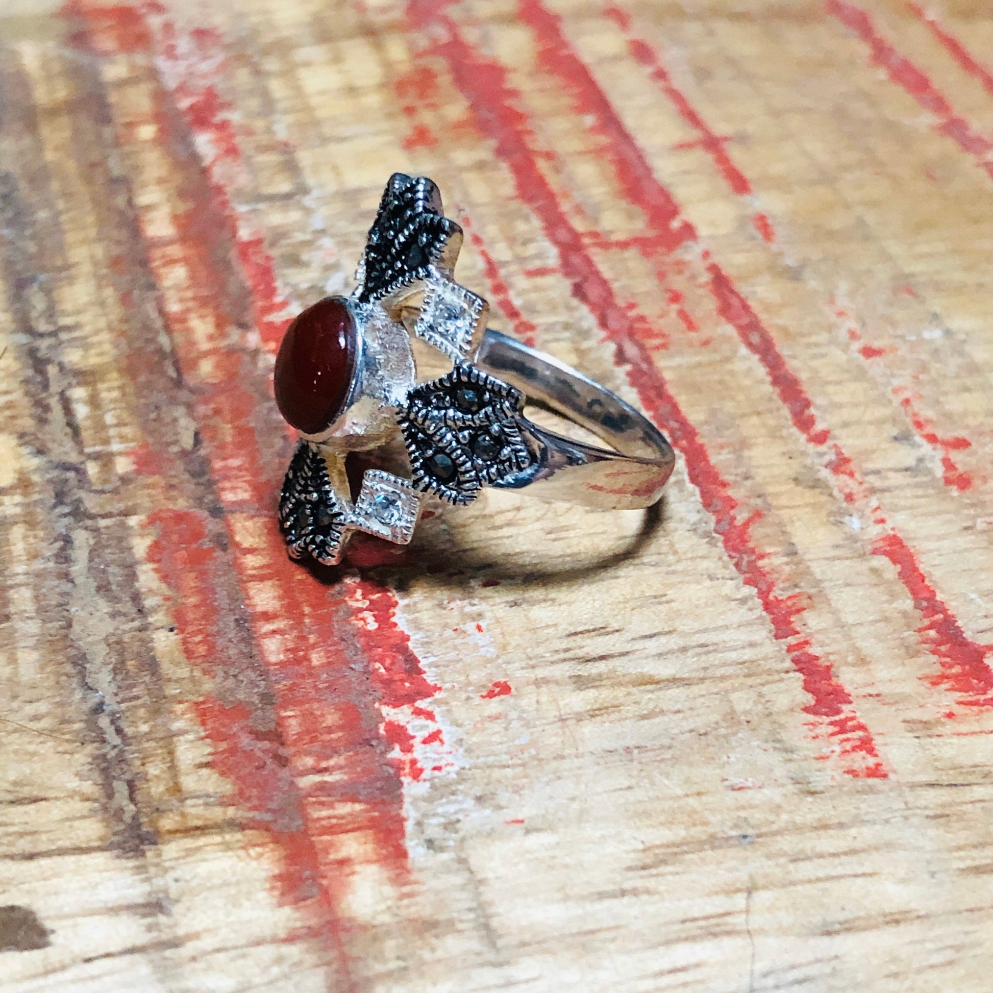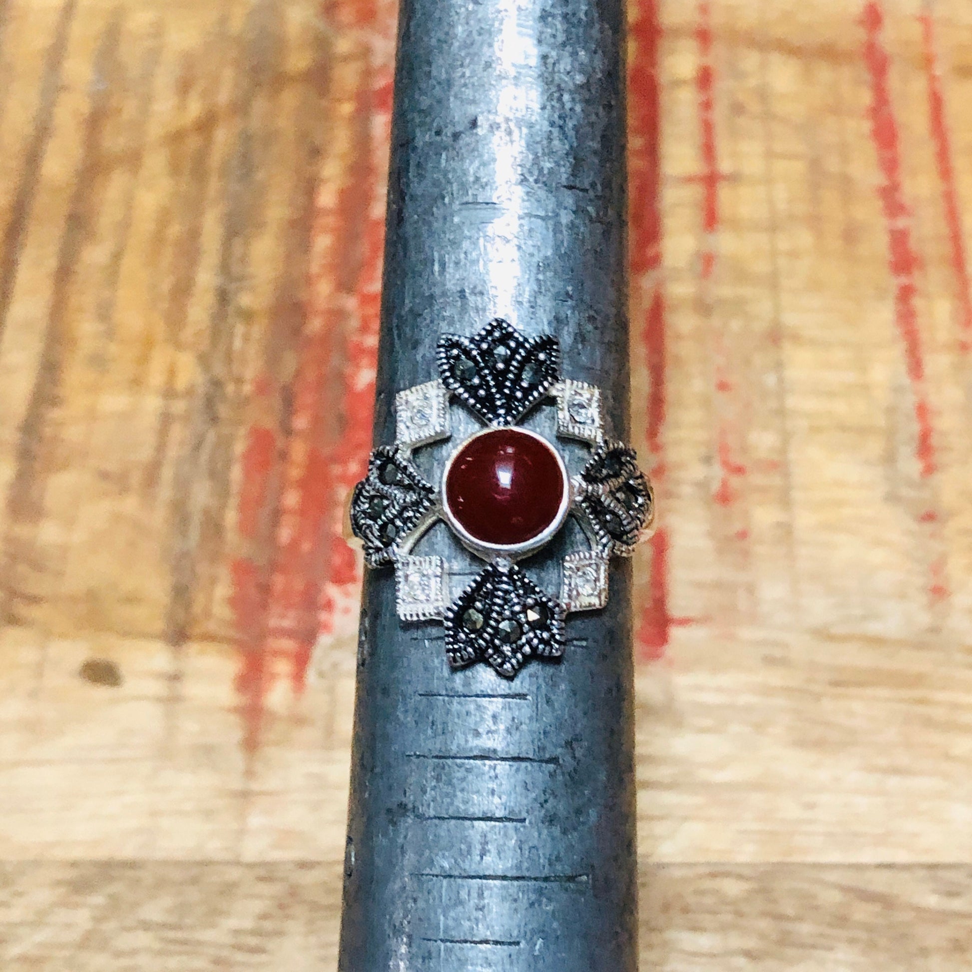Sterling Silver Art Deco Ruby & Topaz Marcasite Ring