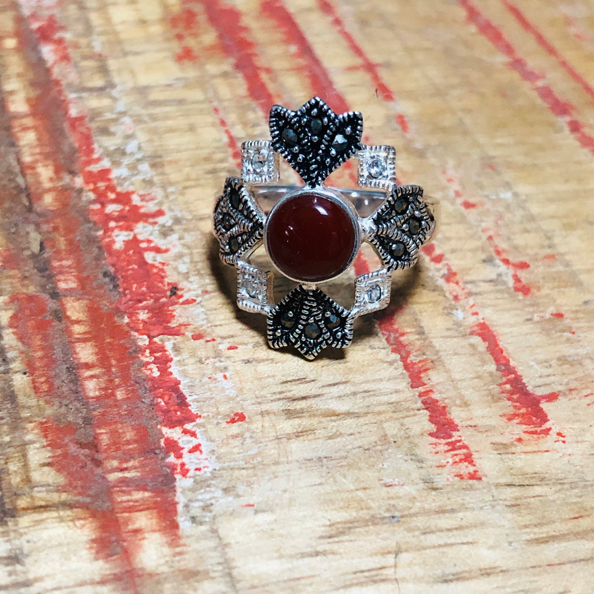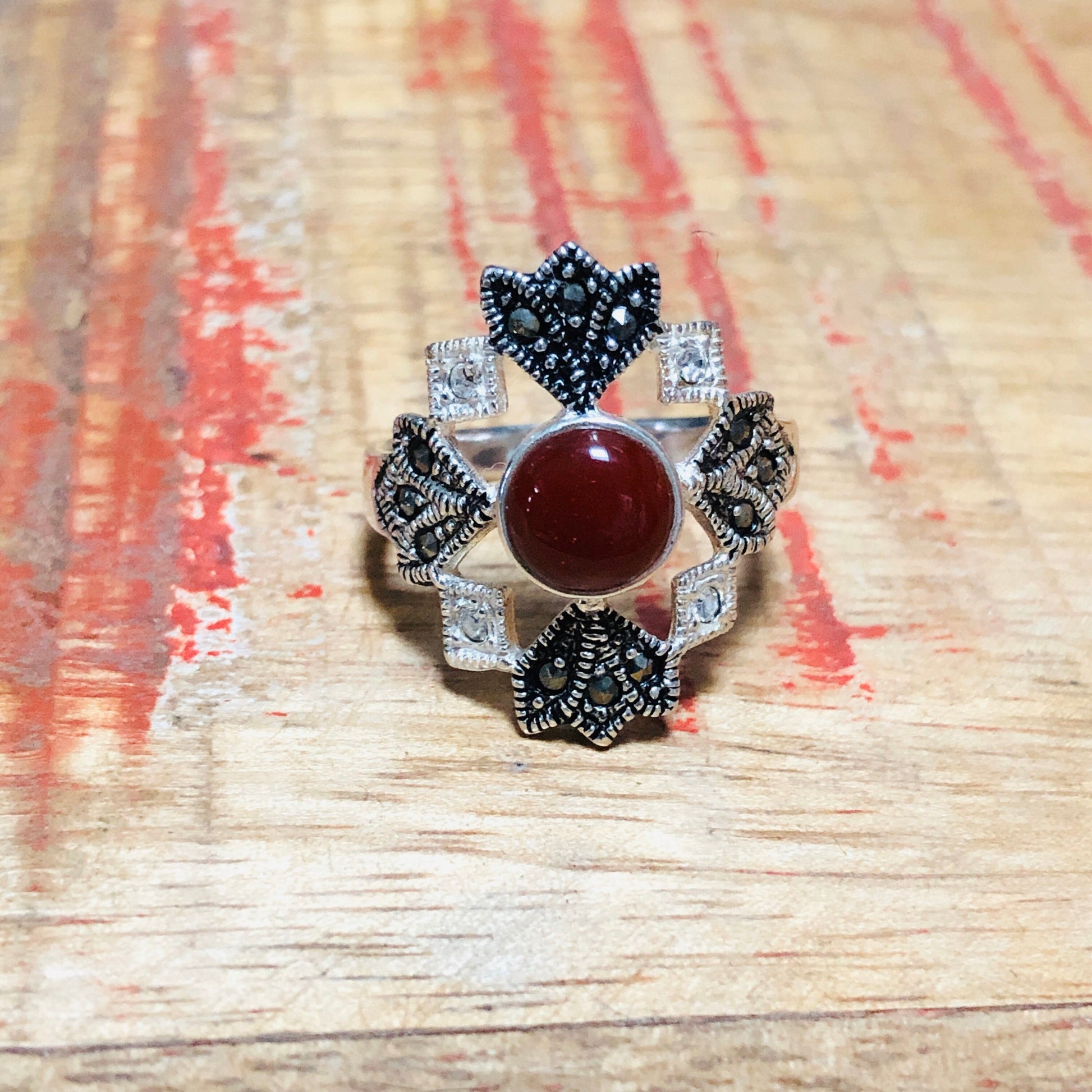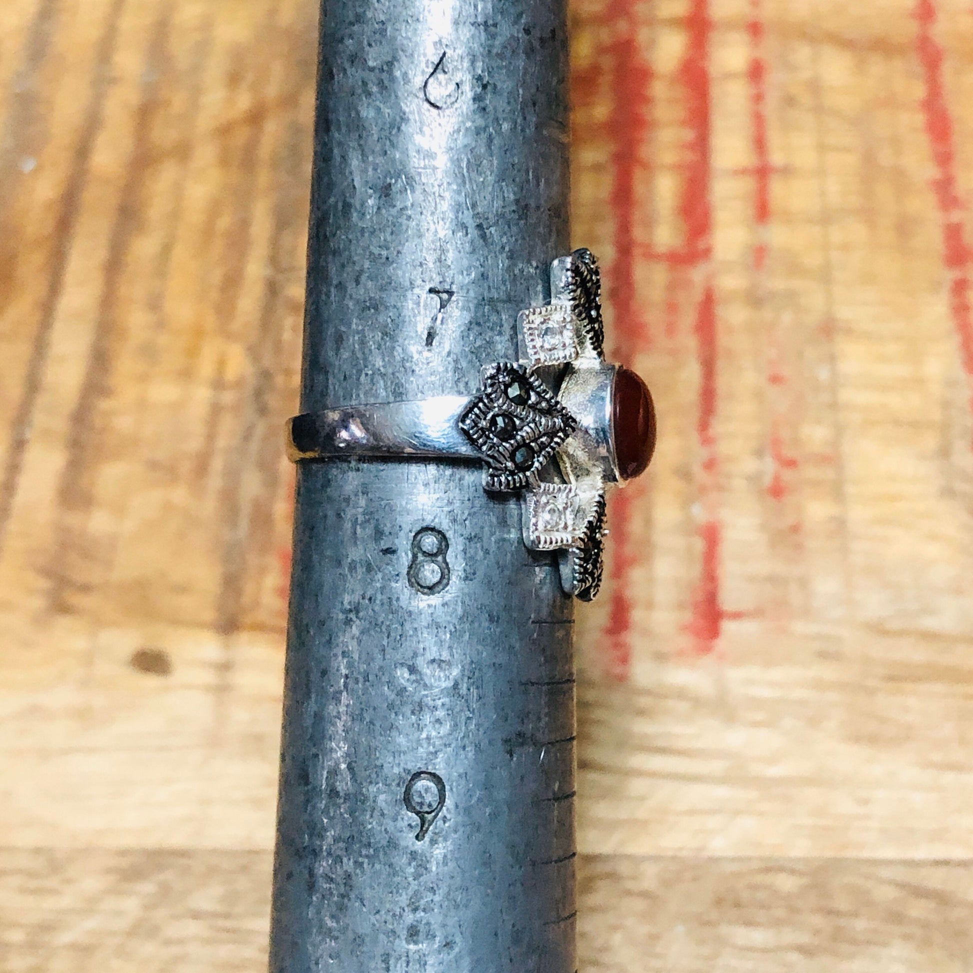 Sterling Silver Art Deco Ruby & Topaz Marcasite Ring