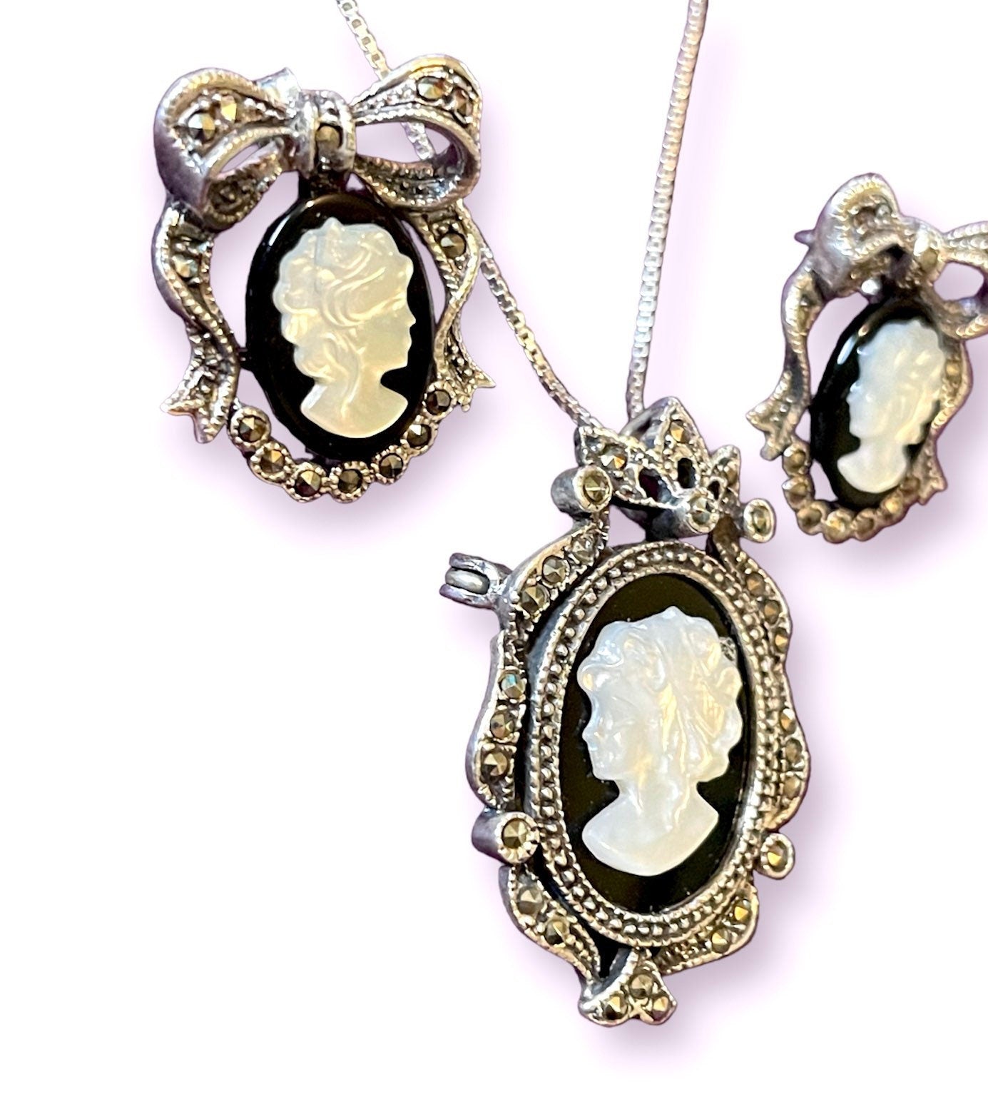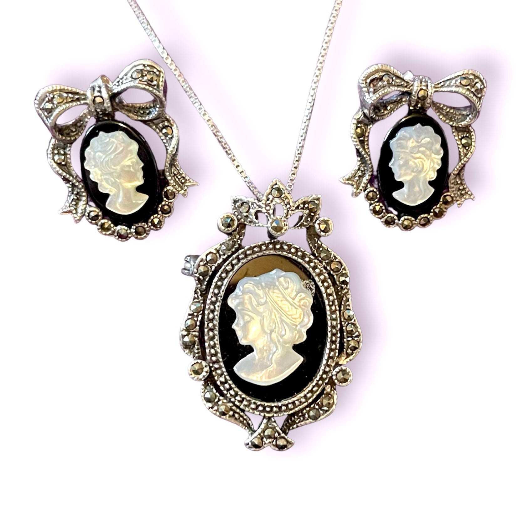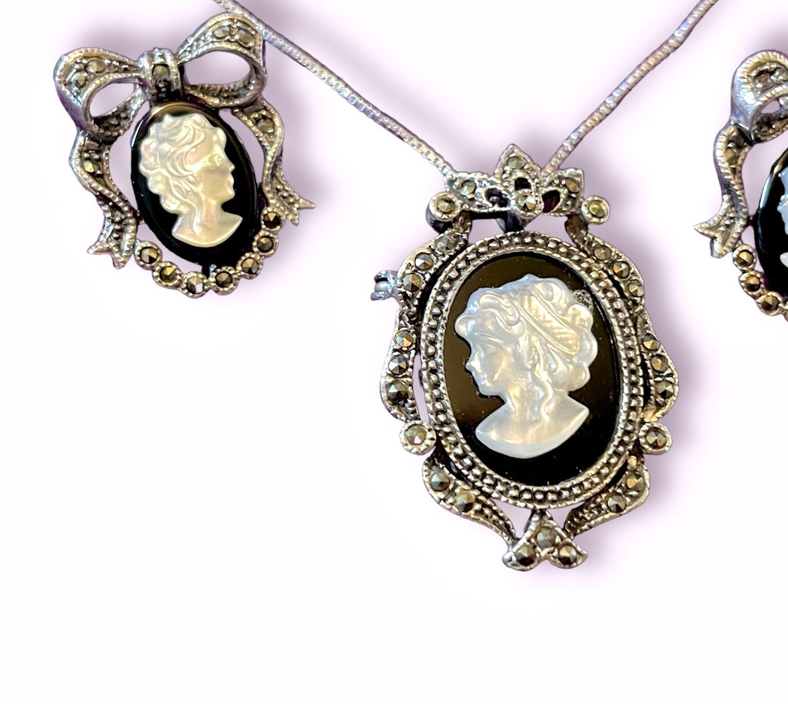 Sterling Silver, Marcasite, Onyx & Mother of Pearl Cameo Necklace, Brooch and Earring Set