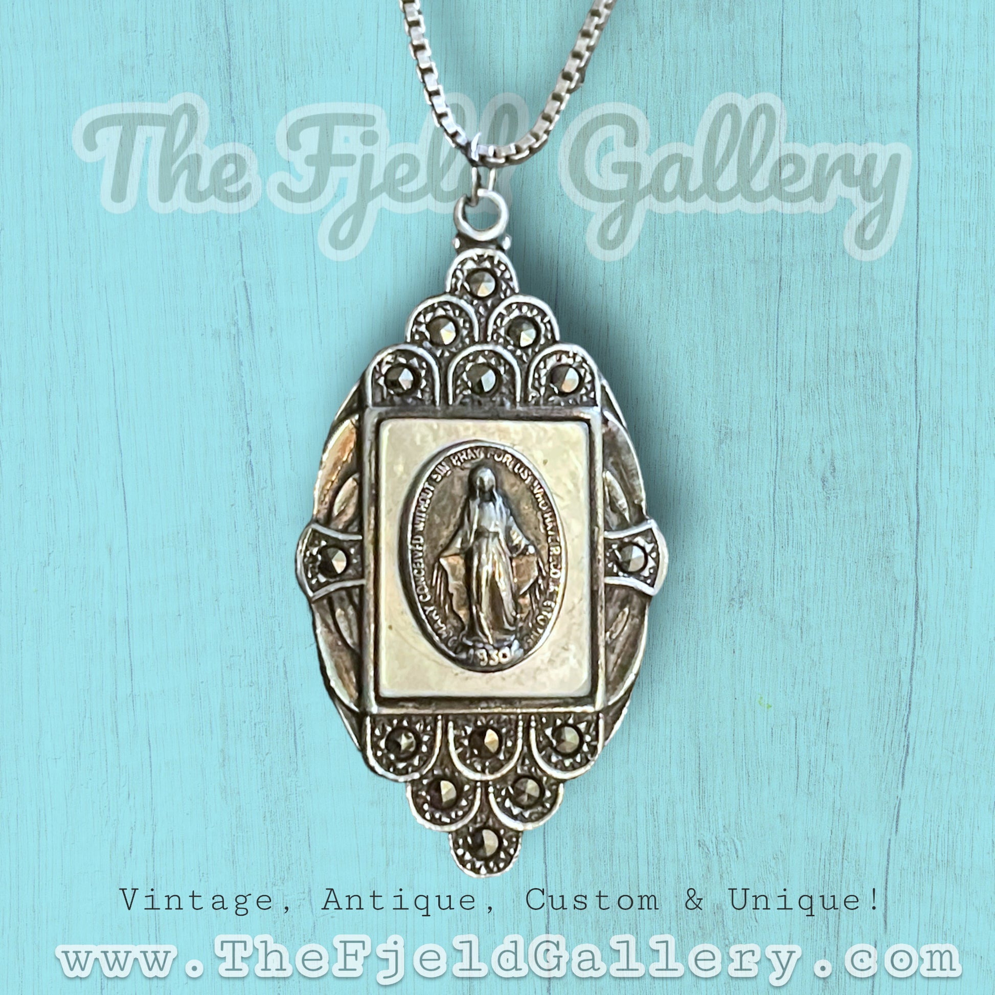 Gorgeous vintage sterling silver Mother Mary religious necklace pendant set with sparkling marcasites and beautiful mother of pearl. Double sided, on a sterling box chain.