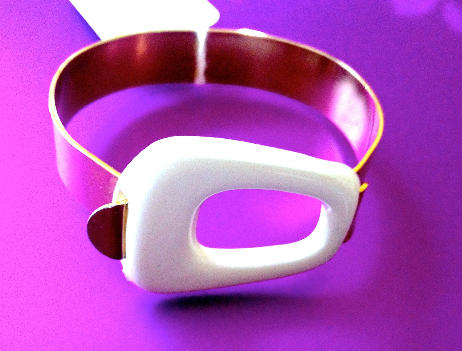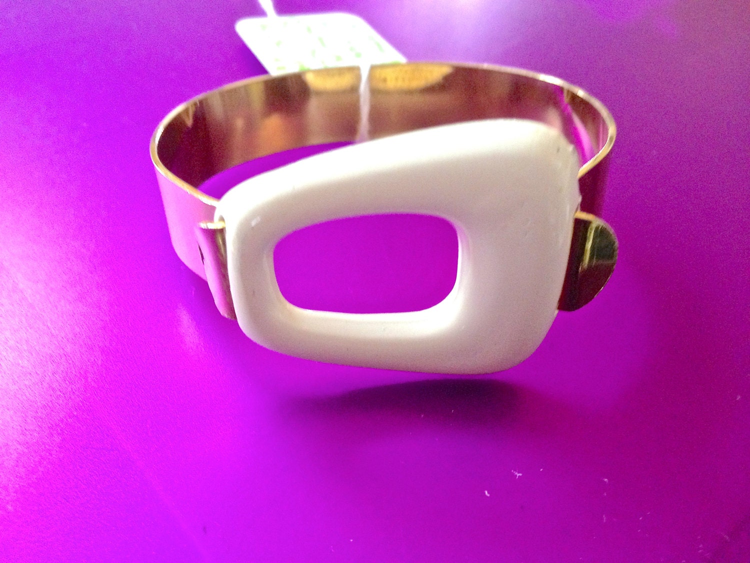 This is an awesome retro geometric gold and white baked enamel funky bangle bracelet. With a ultra mod pressure hinge the closure on this is sleek and secure. Bold and classy this is a really on trend addition to any vintage jewelry collection!