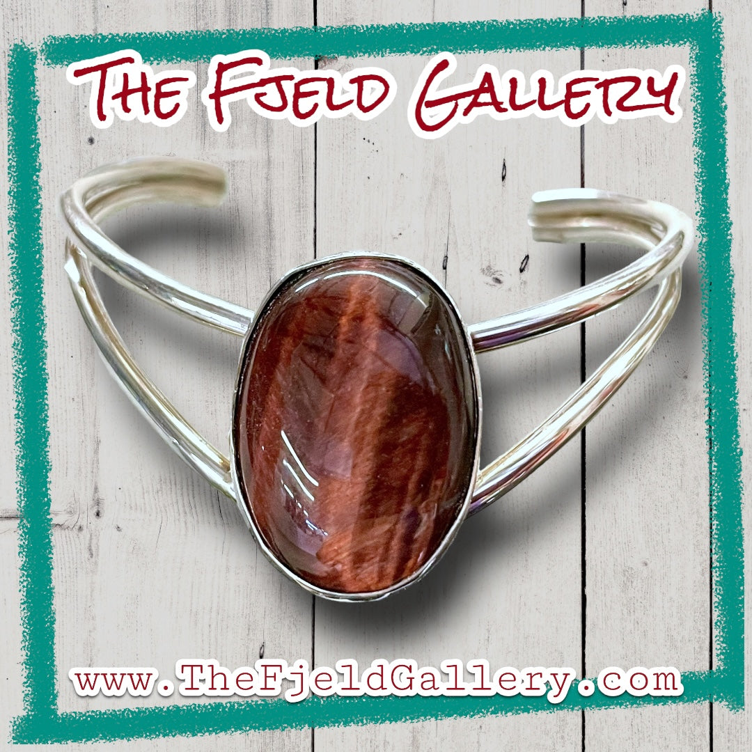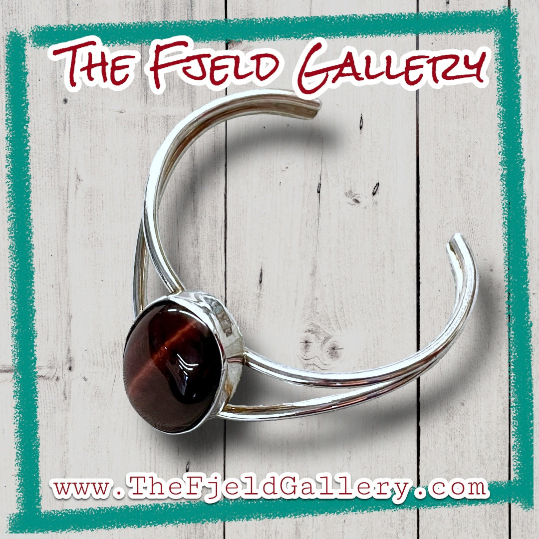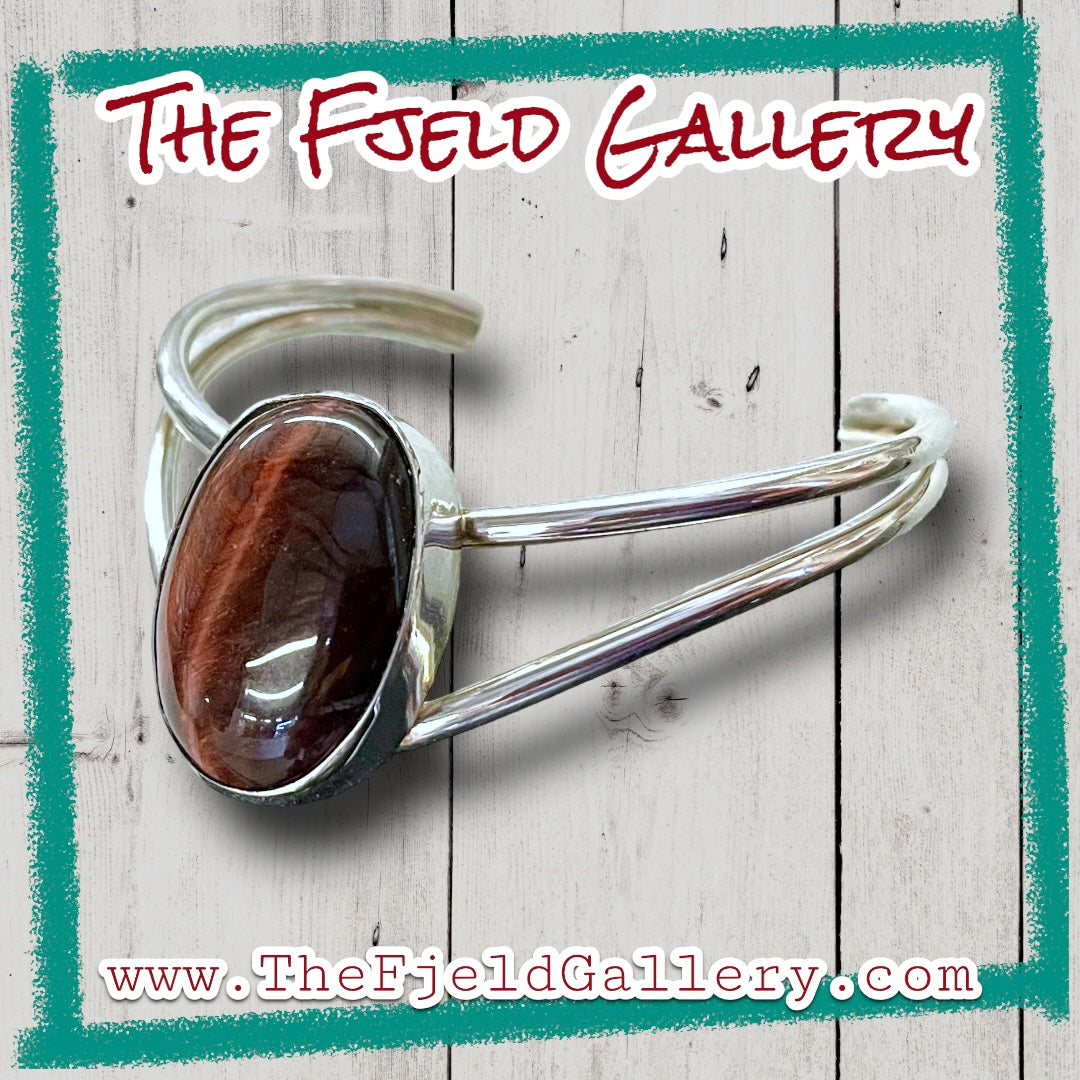 Beautiful opalescent reddish brown tigers eye cabochon bezel set in sterling silver with a chevron style cuff bracelet.