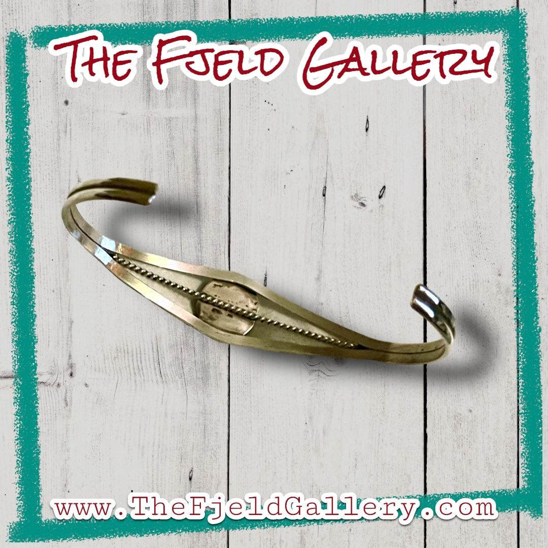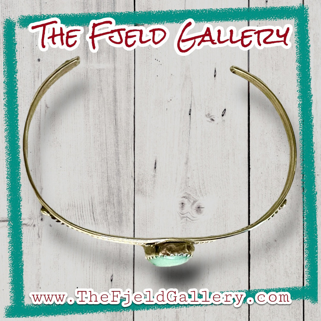 Beautiful dainty light greenish blue turquoise gemstone serrated bezel set in sterling silver with a 3 wire band cuff bracelet with center wire twisted. 7” long comfortable for +/- 1/2”. Turquoise cabochon is 14 mm by 9 mm.