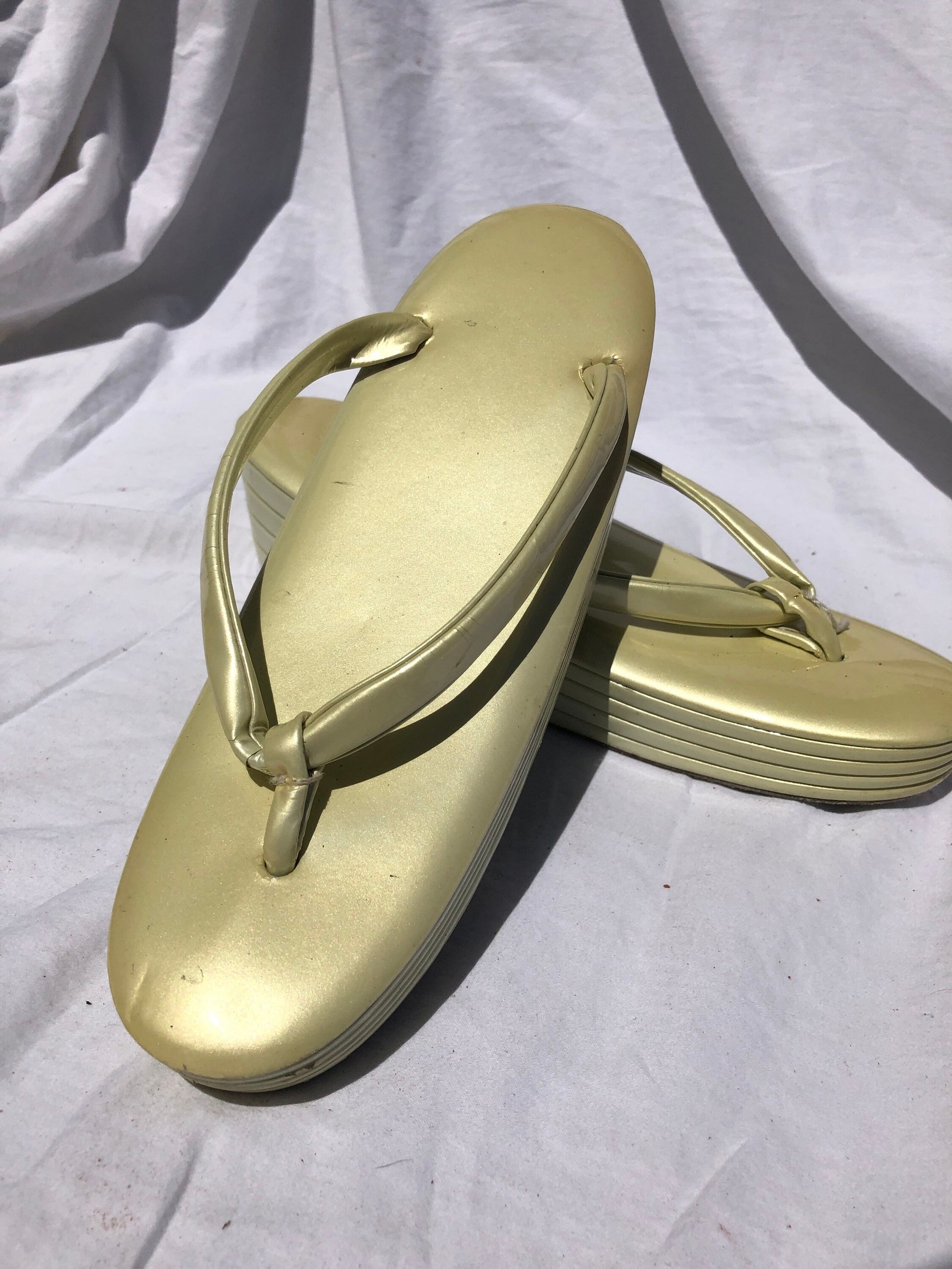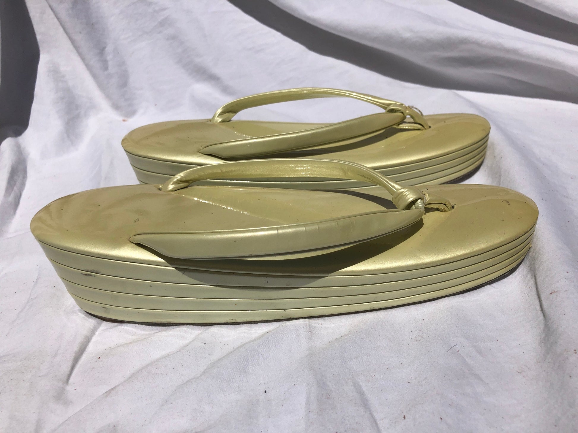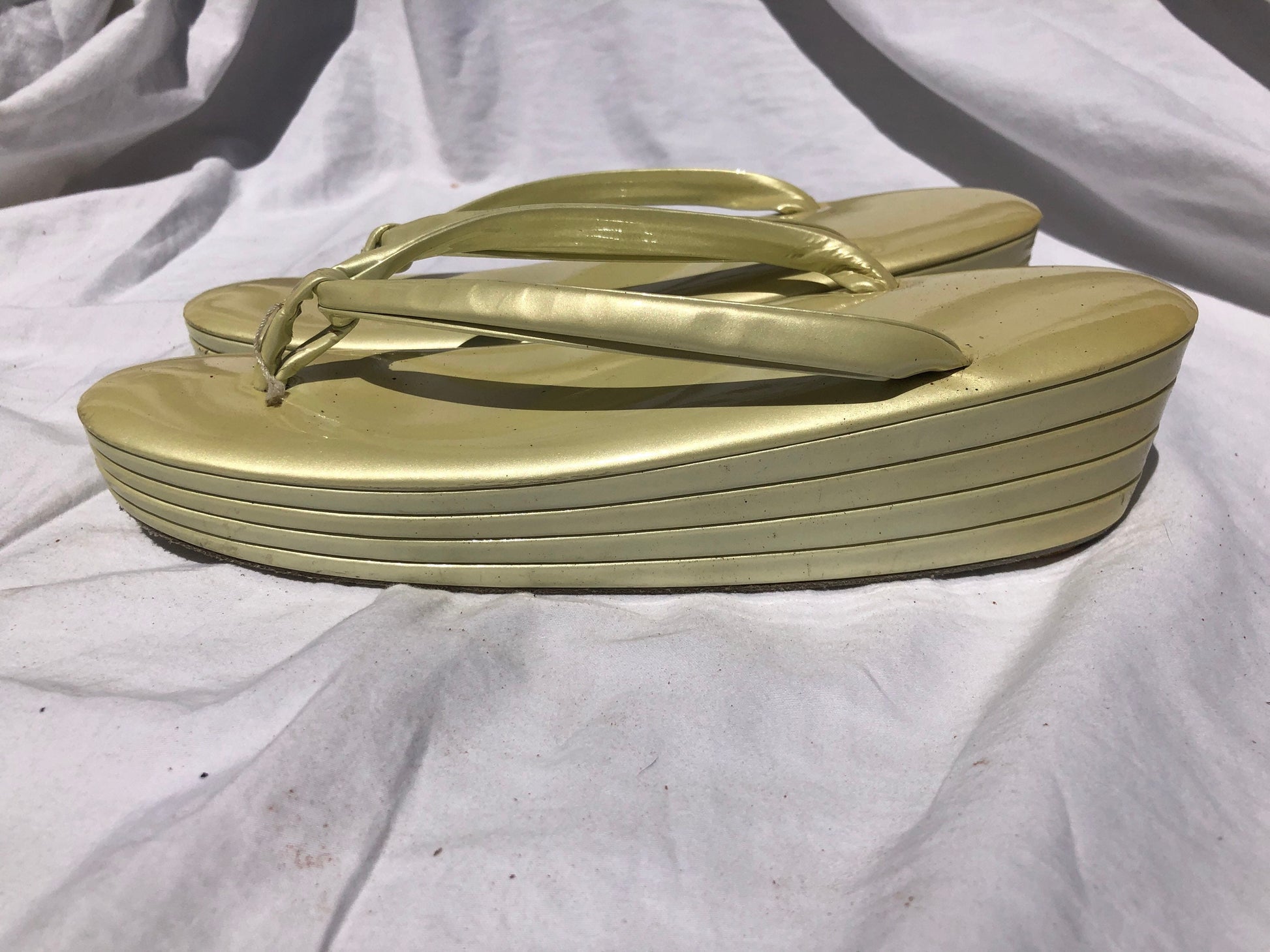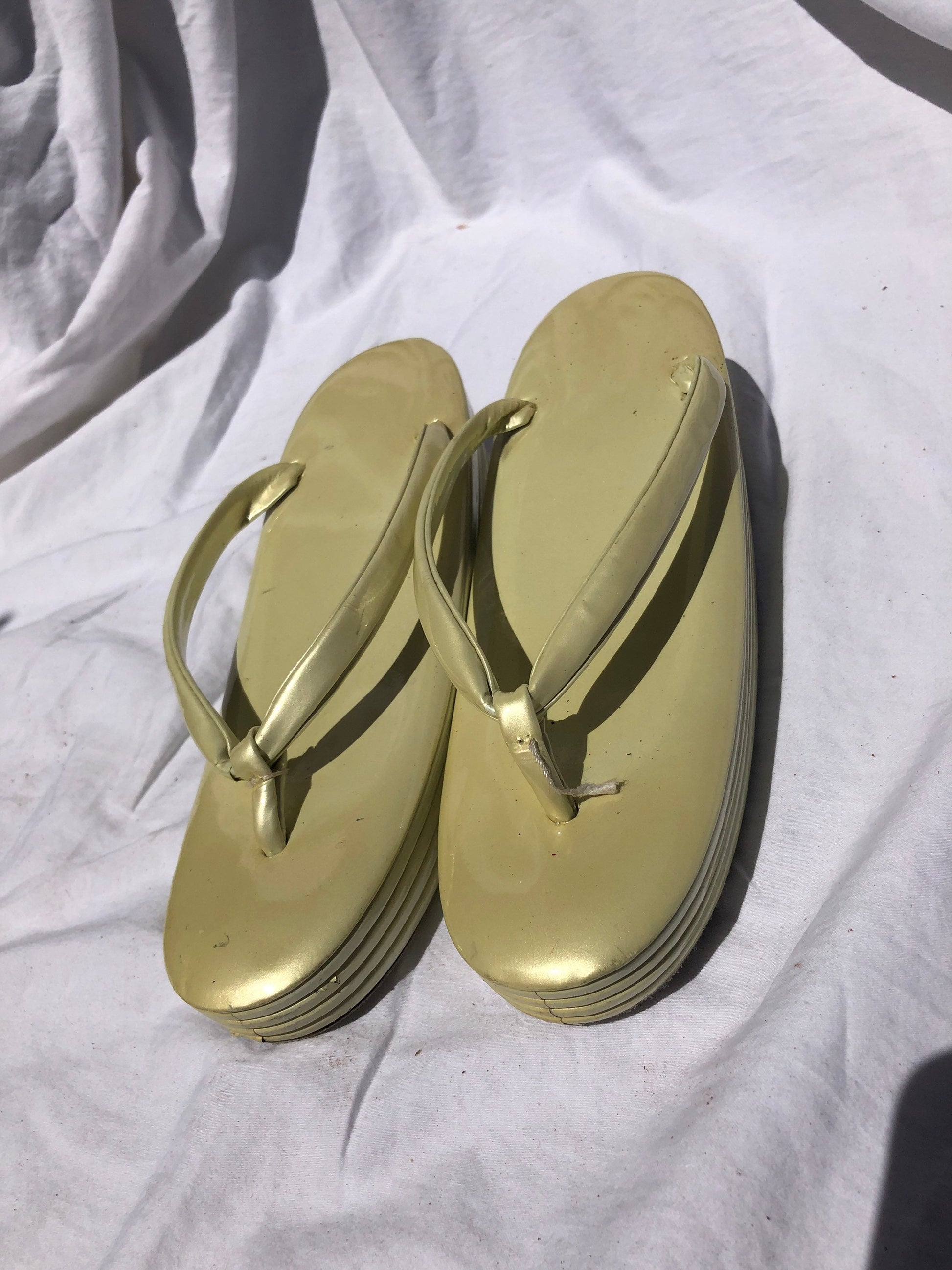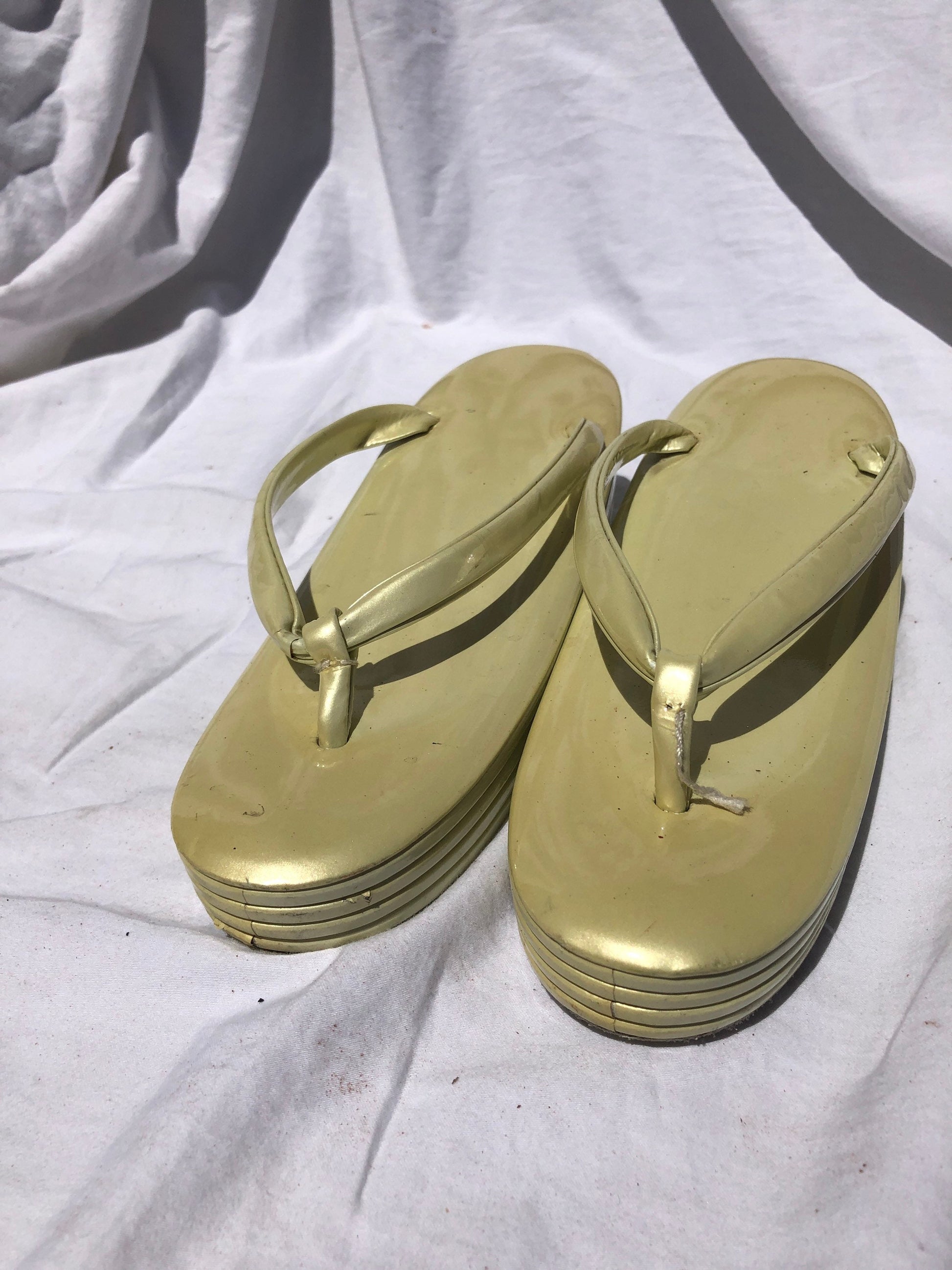Unique Vintage Asian Metallic Chartreuse Green Yellow Thing Sandals c.1960 Size 6