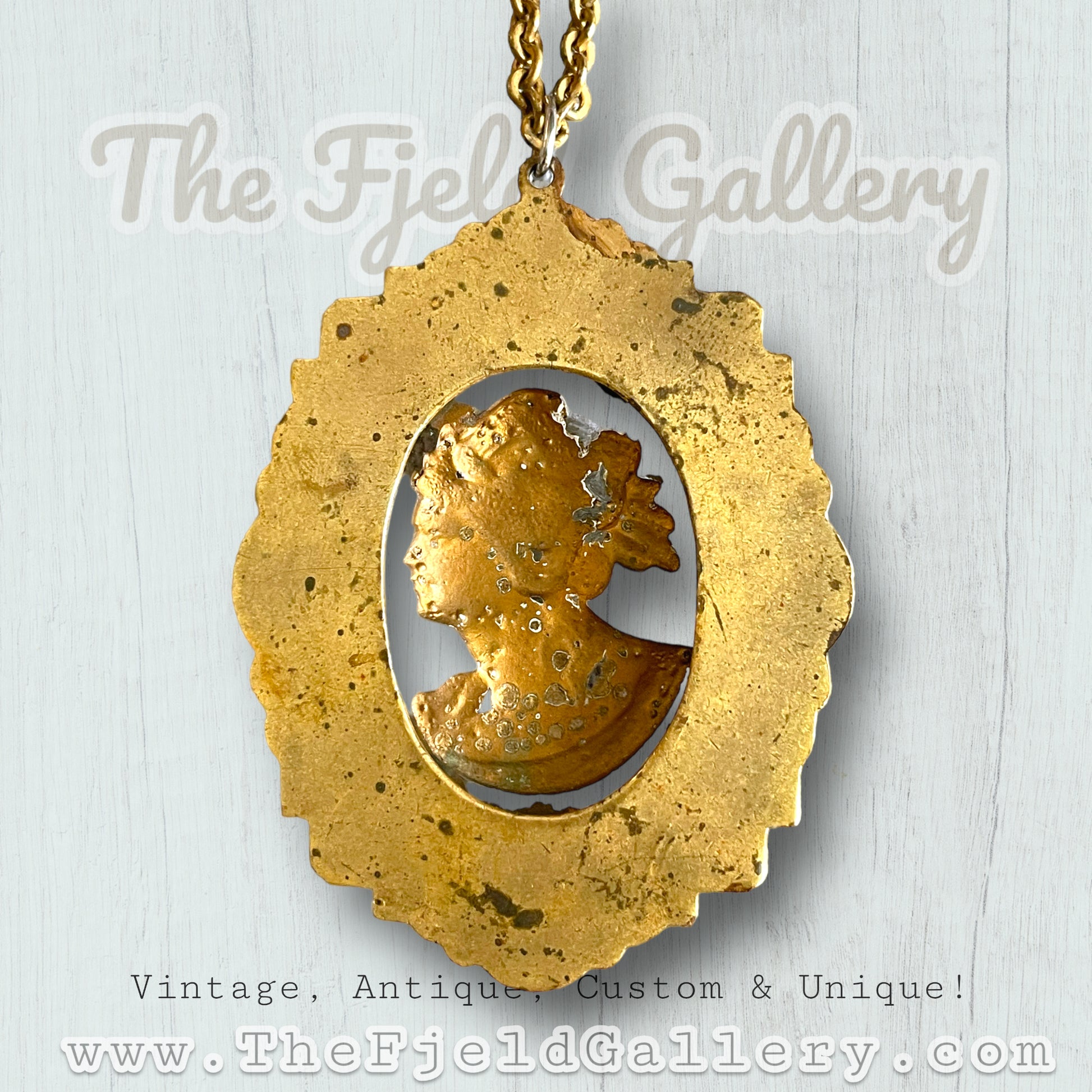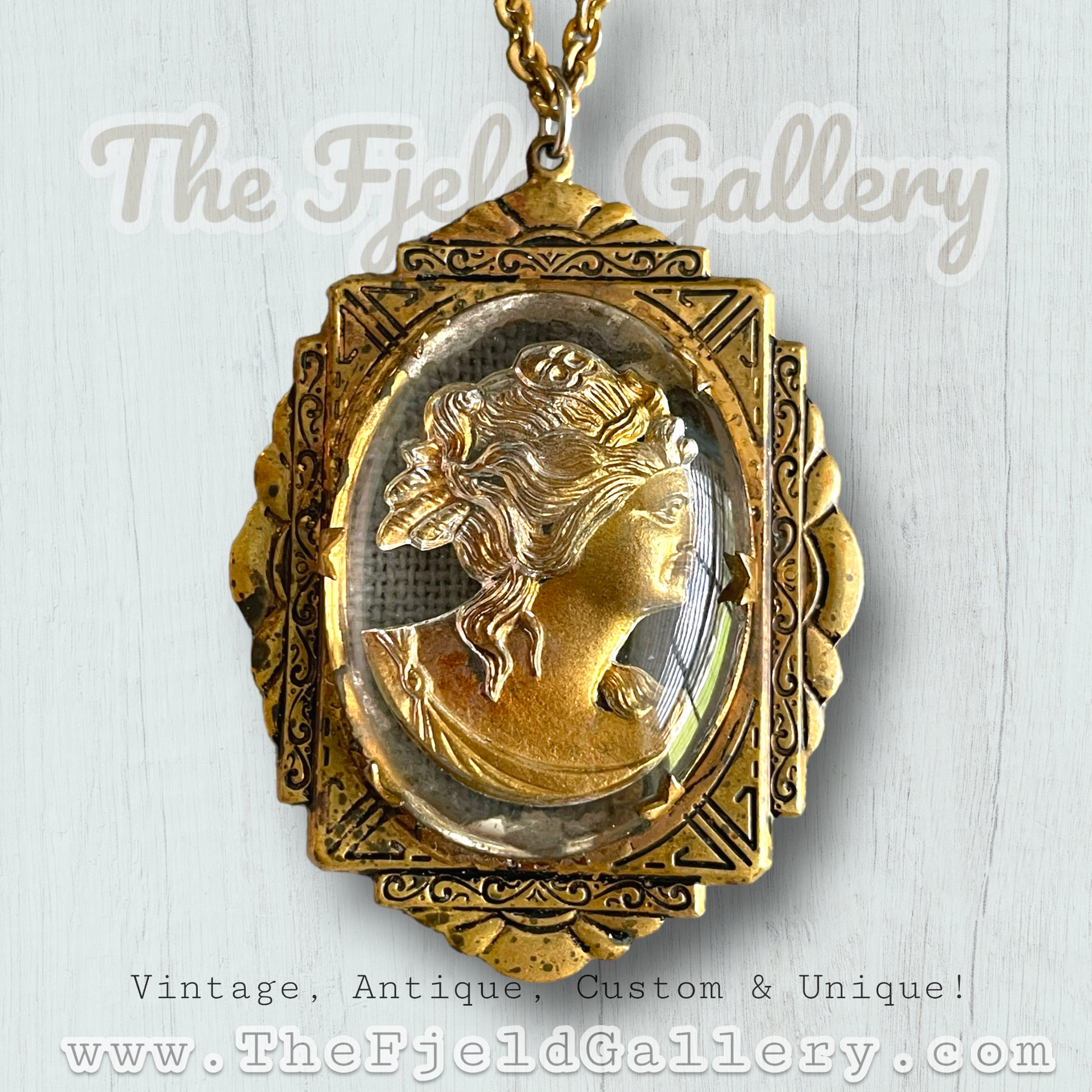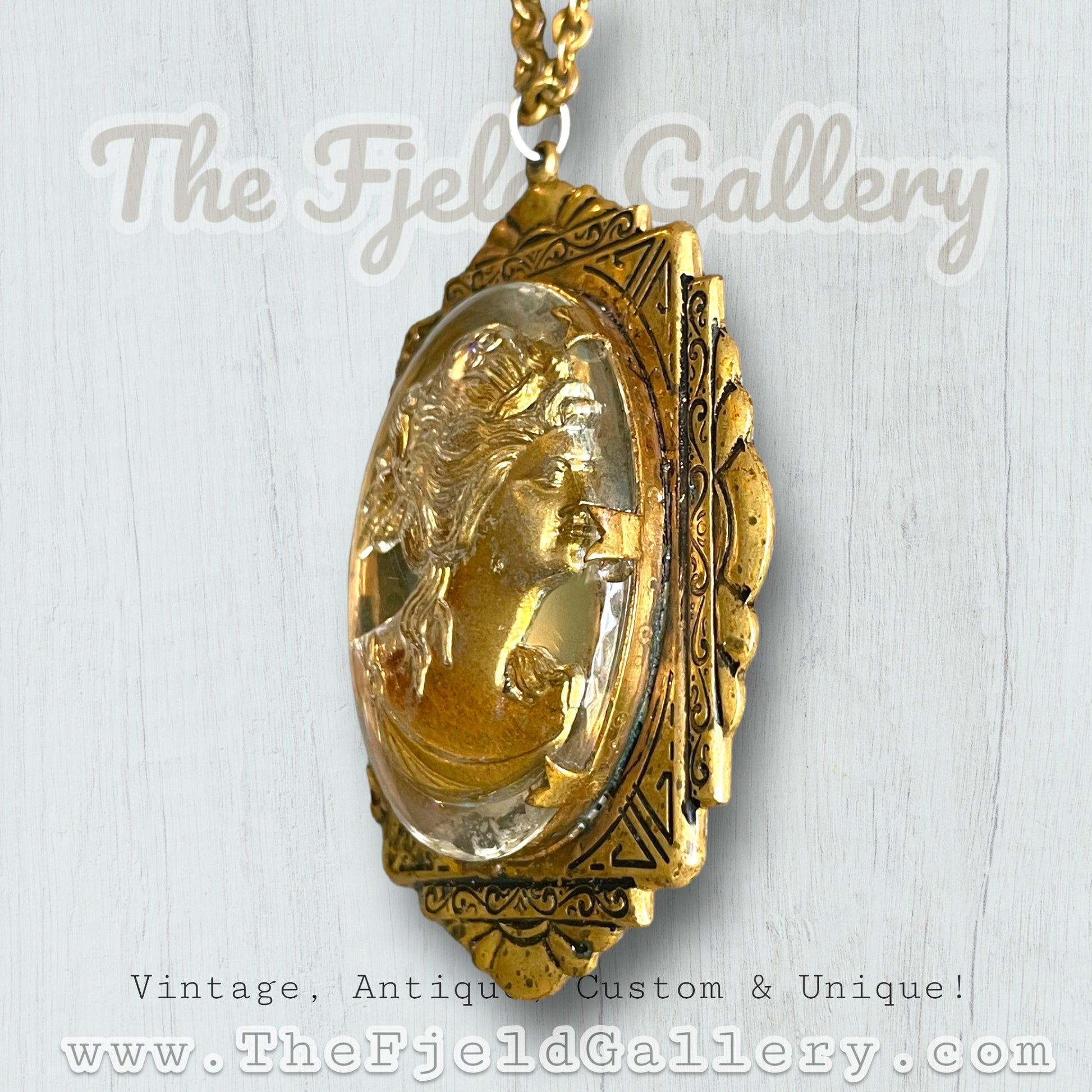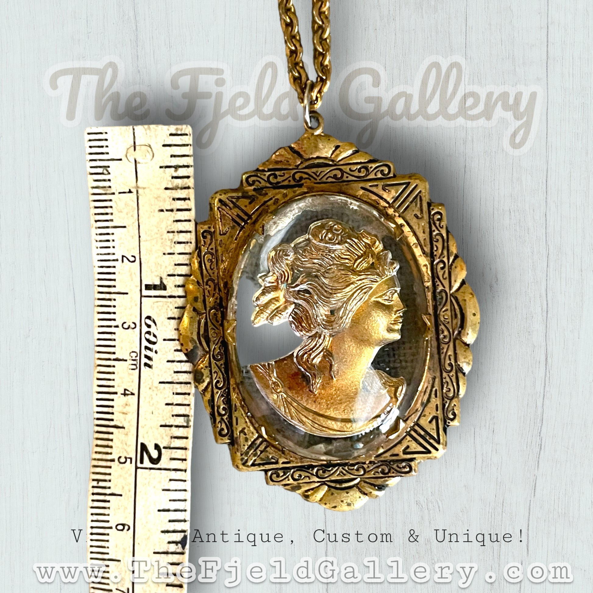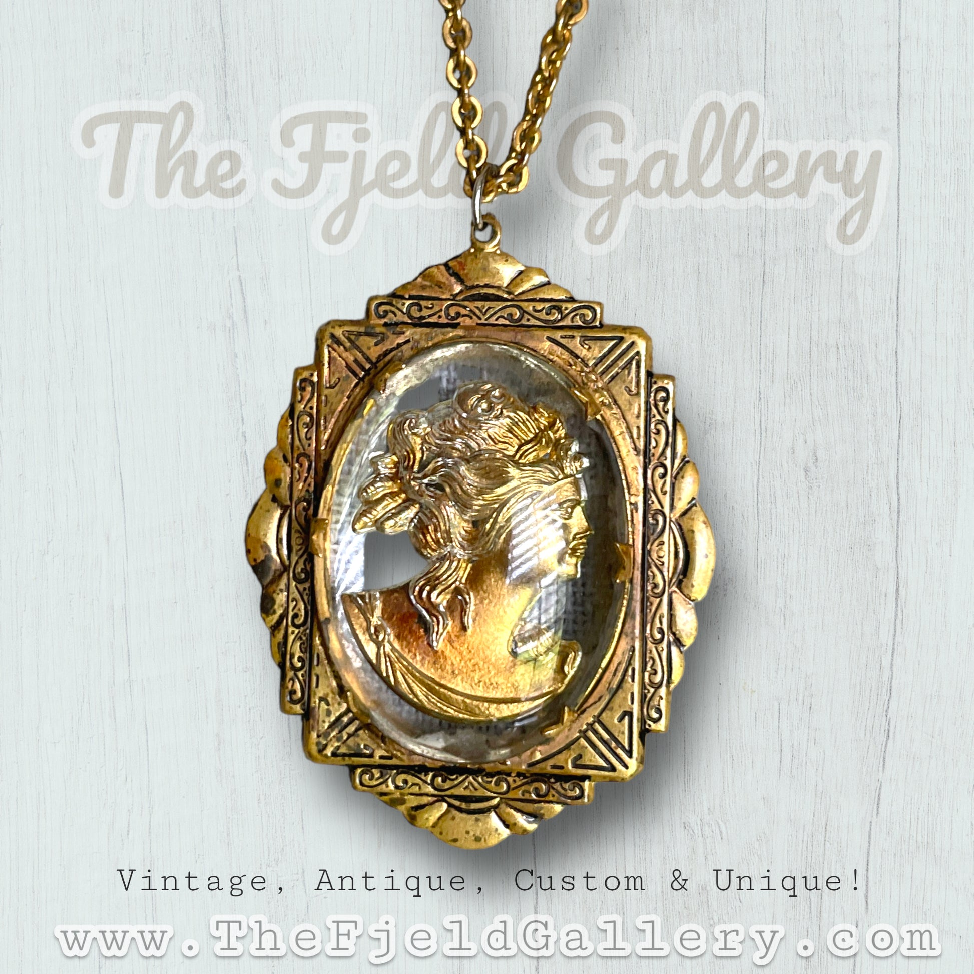 Victorian Gold Metallic & Clear Glass Intaglio Cameo Bezel Set Gold Embossed Necklace