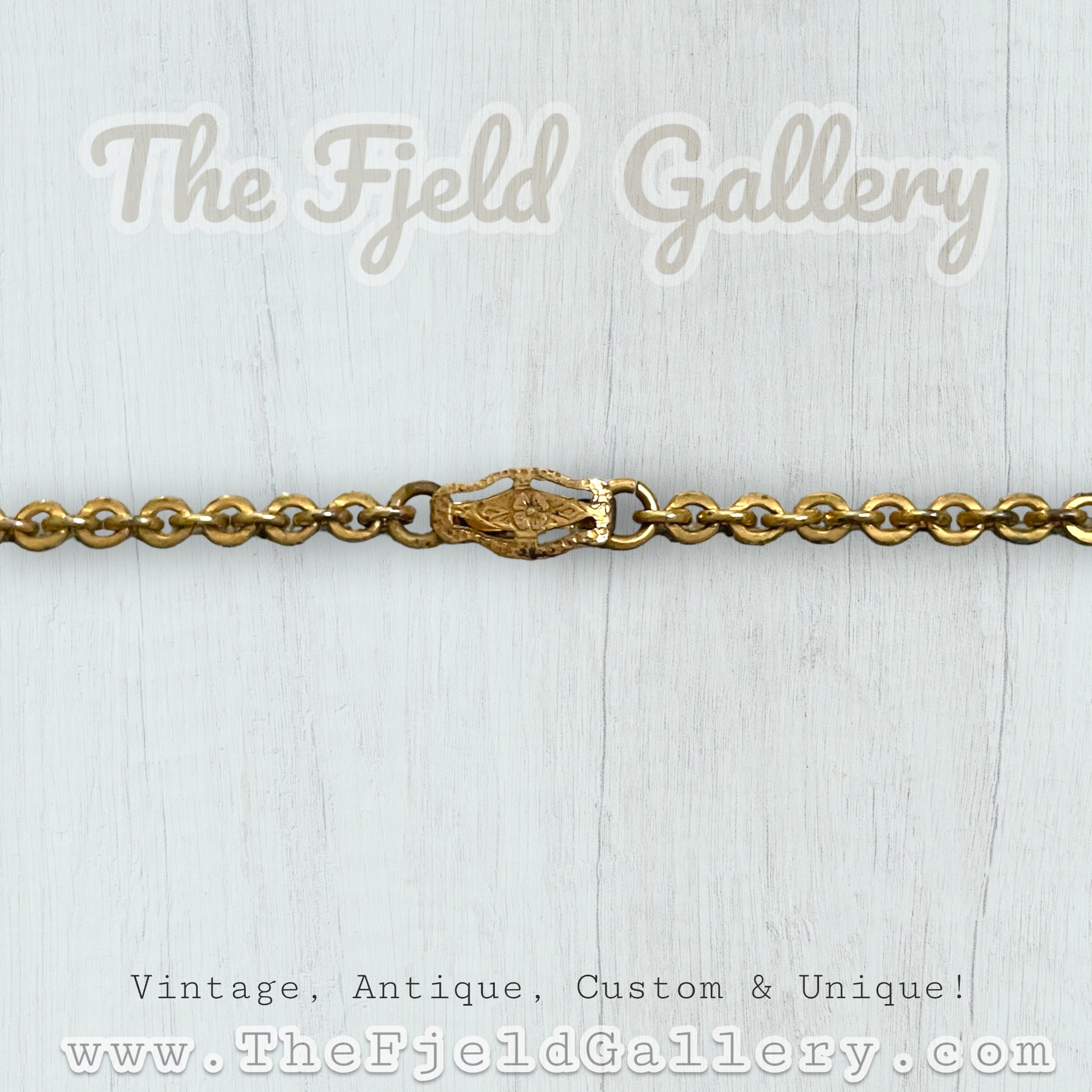 Gorgeous antique Victorian gold & silver foiled metallic glass intaglio cameo. Reverse carved clear glass with gold foil, bezel set in intricately embossed gold chain. Chain is very unique as each link is embossed with designs and each a different shape and patterns.