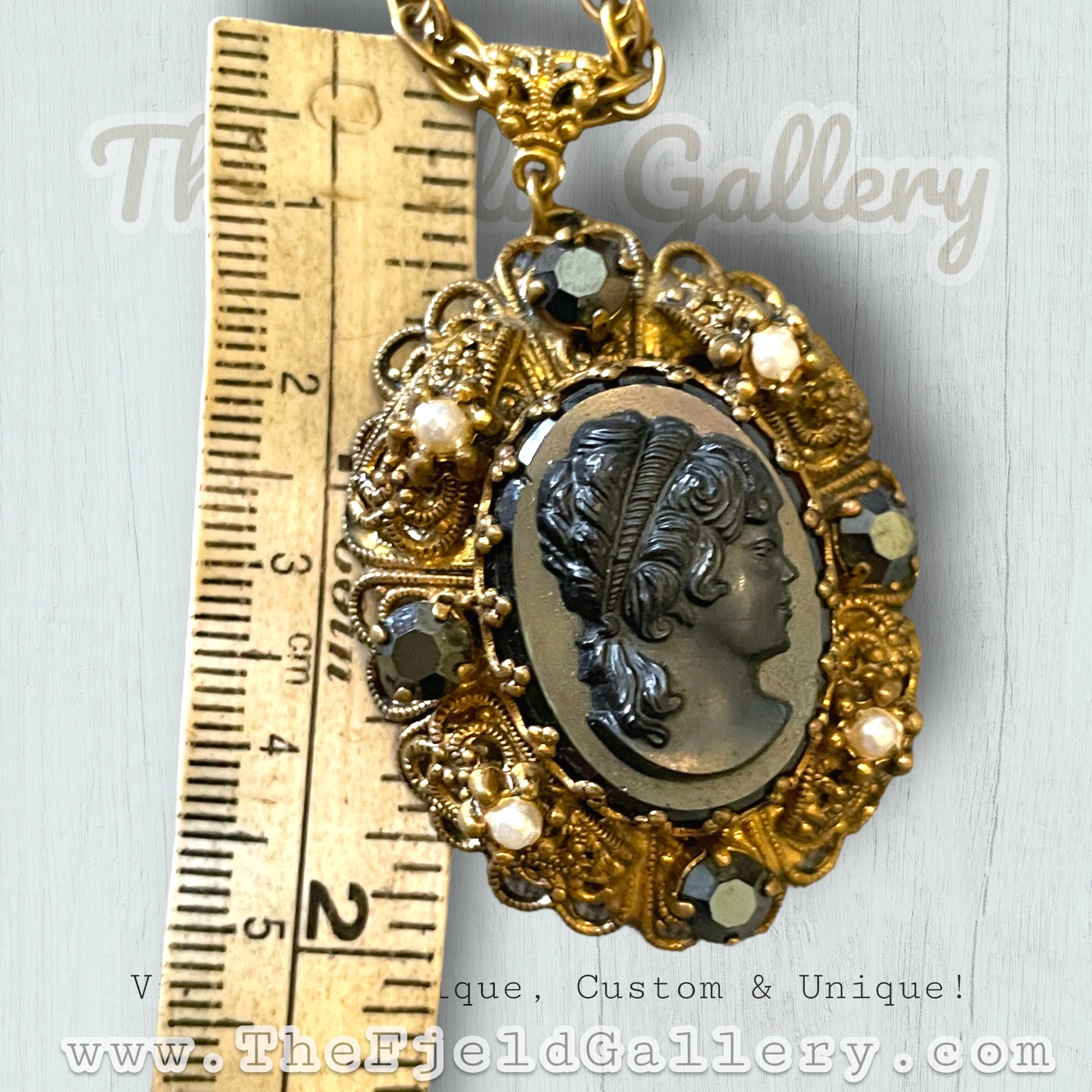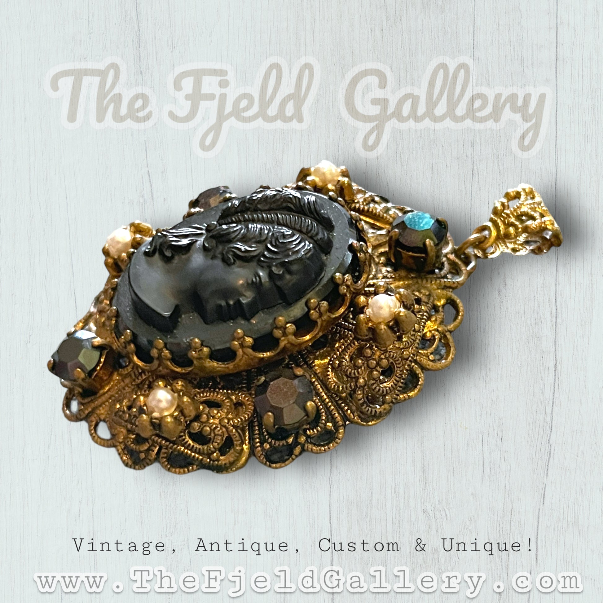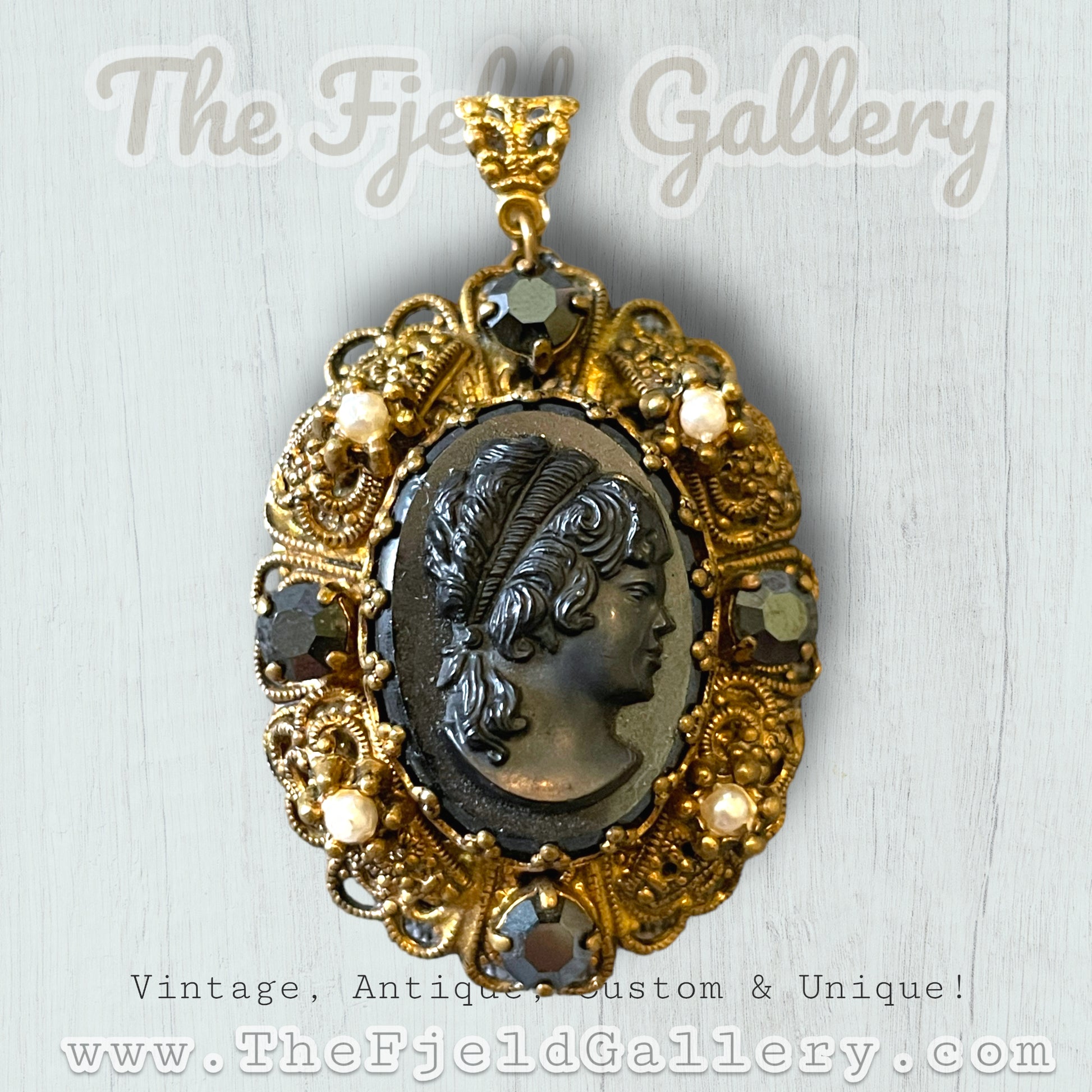 West German Black Hematite Glass Cameo with Pearls & Black Crystals Bezel Set in Gold Brass Filigree