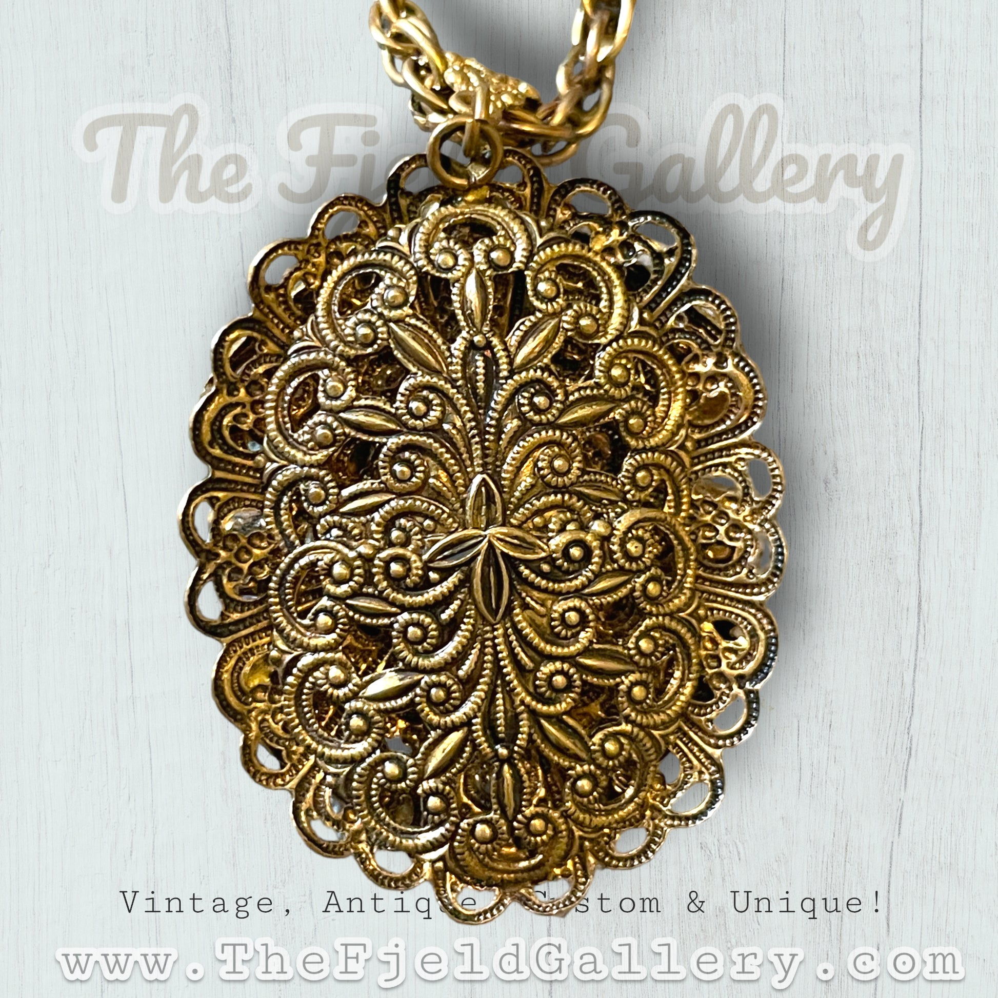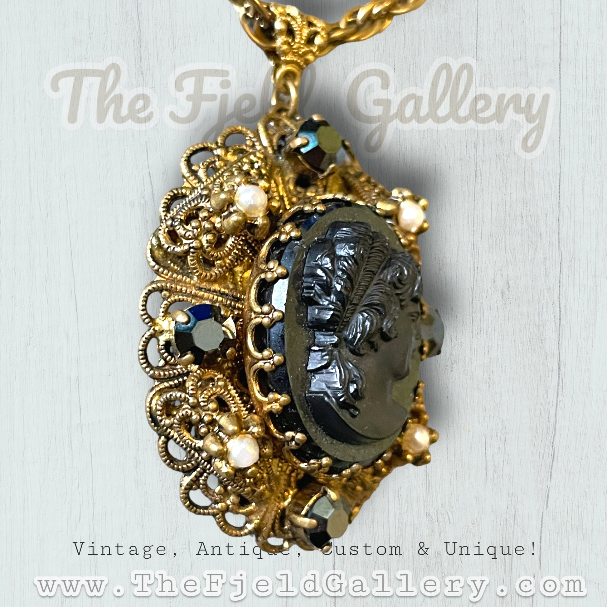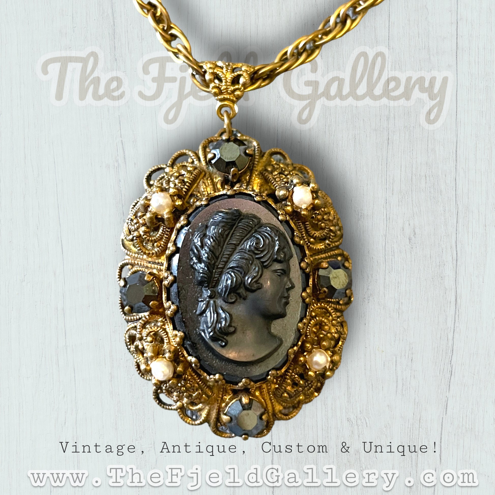 West German Black Hematite Glass Cameo with Pearls & Black Crystals Bezel Set in Gold Brass Filigree