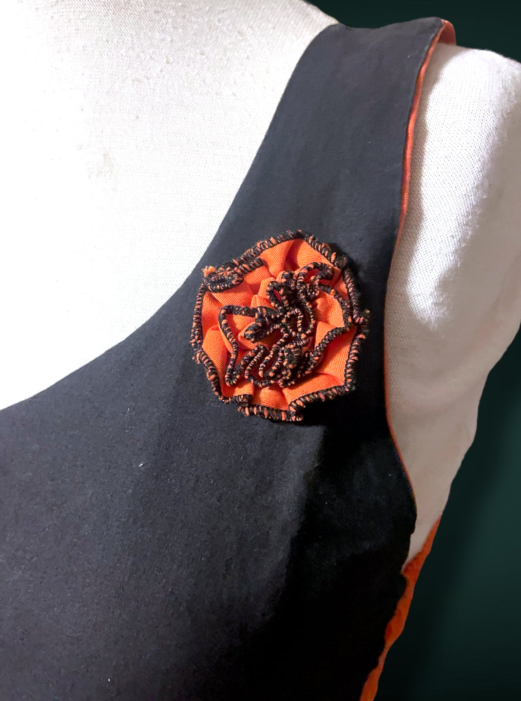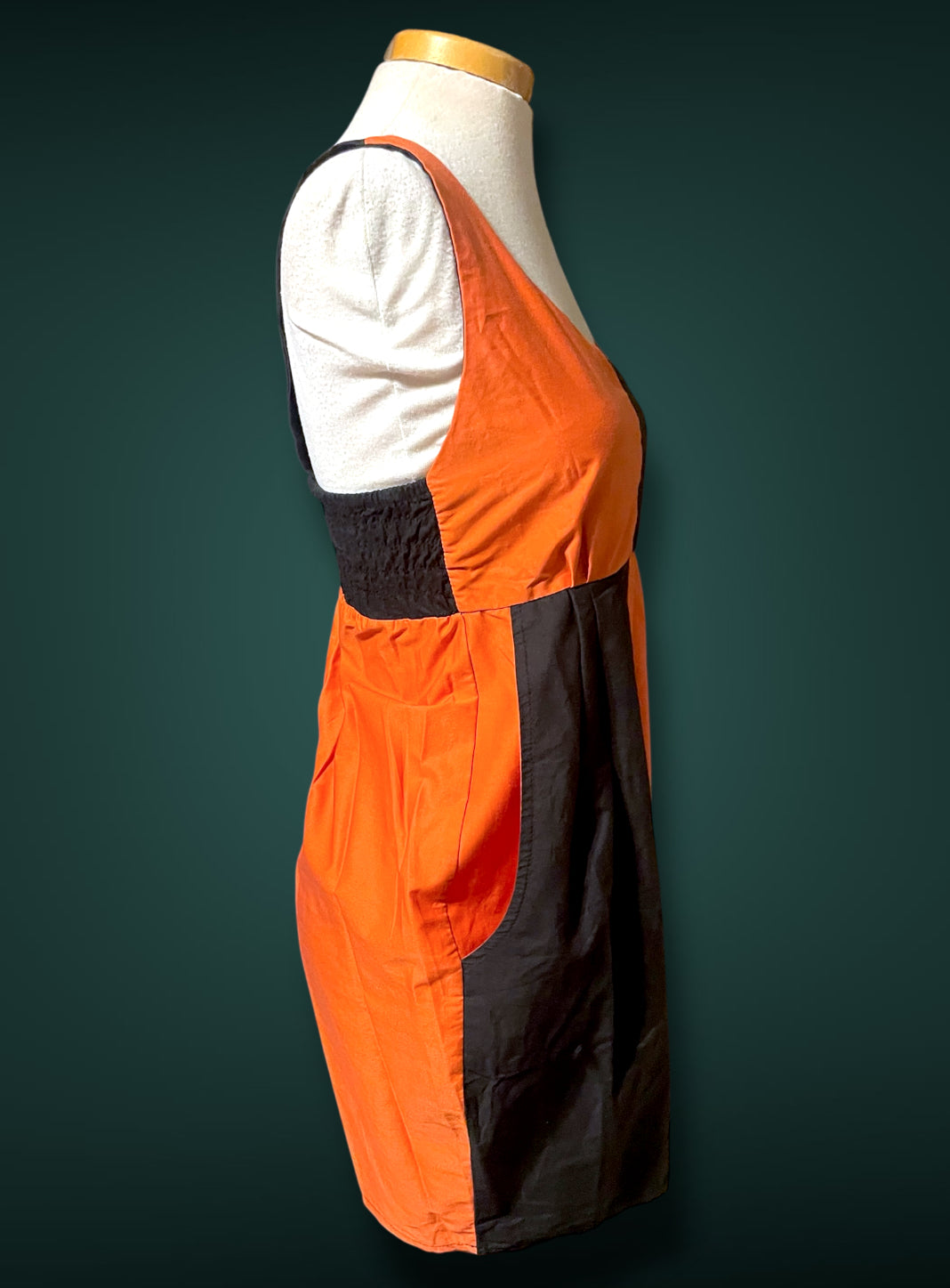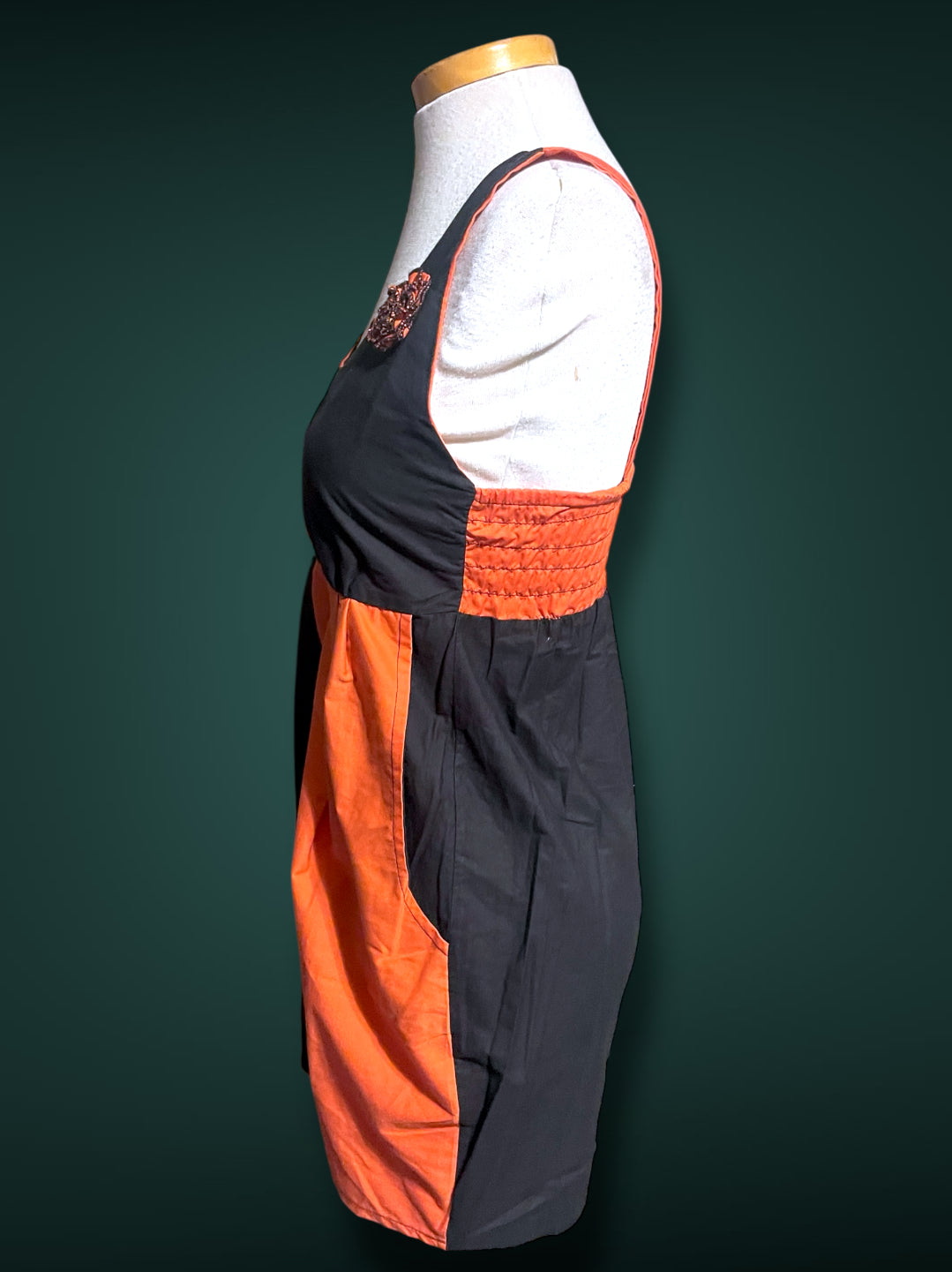 Super cute 1990’s cotton black and red color block short mini”Harley Quinn” mini dress. Tank style 1.5” sleeves and fabric rose flower on left side. Elastic stretchy back at bust to waist height. blousing skirt with pockets on both sides.
