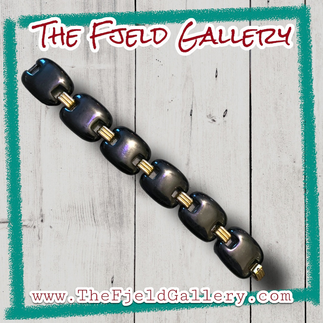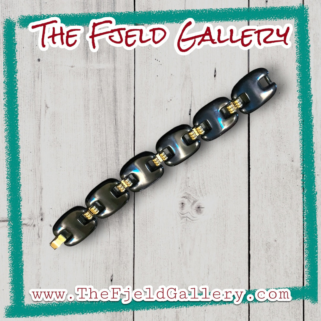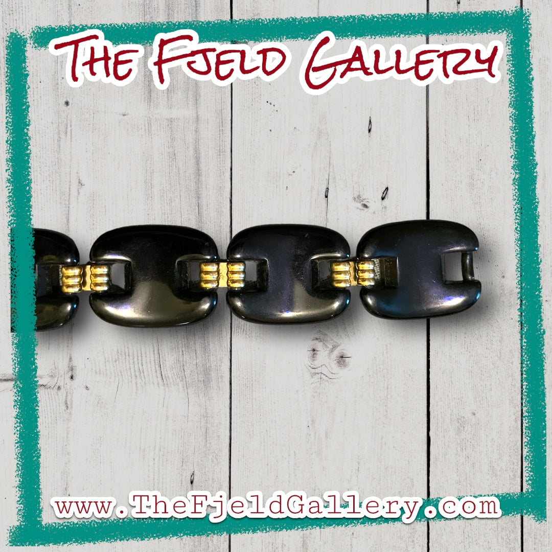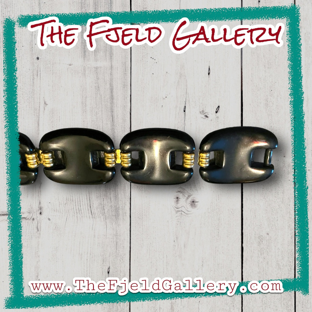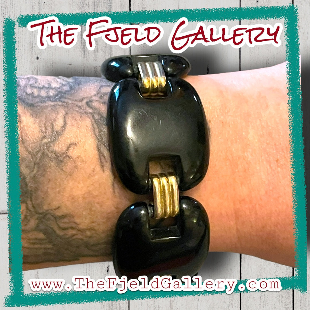 Early Plastic Vintage Black Lucite & Gold Link Chunky Panel Bracelet