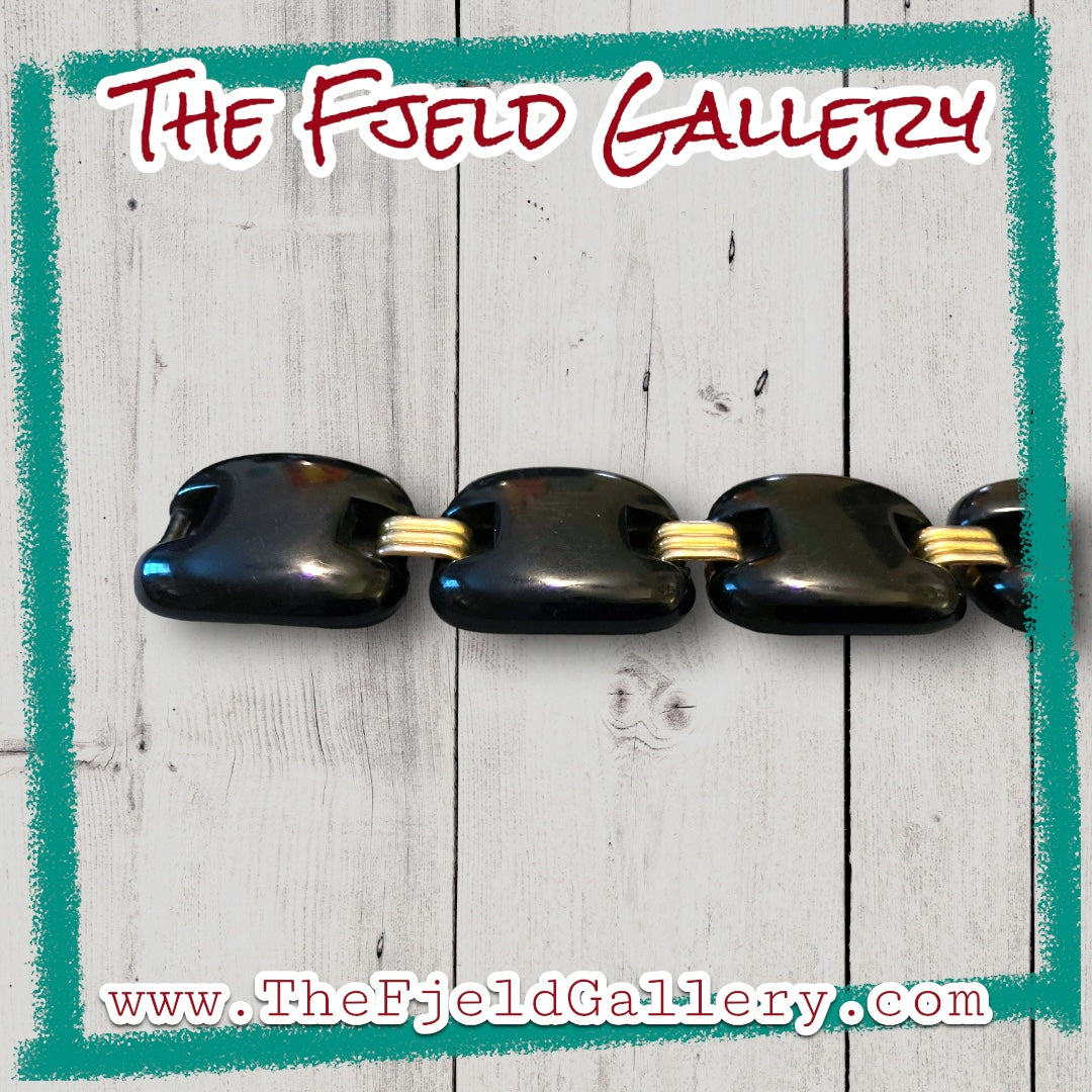 Vintage 1960’s early plastic chunky black lucite link bracelet with gold connecting links. Fold over clasp. 8.5” long.