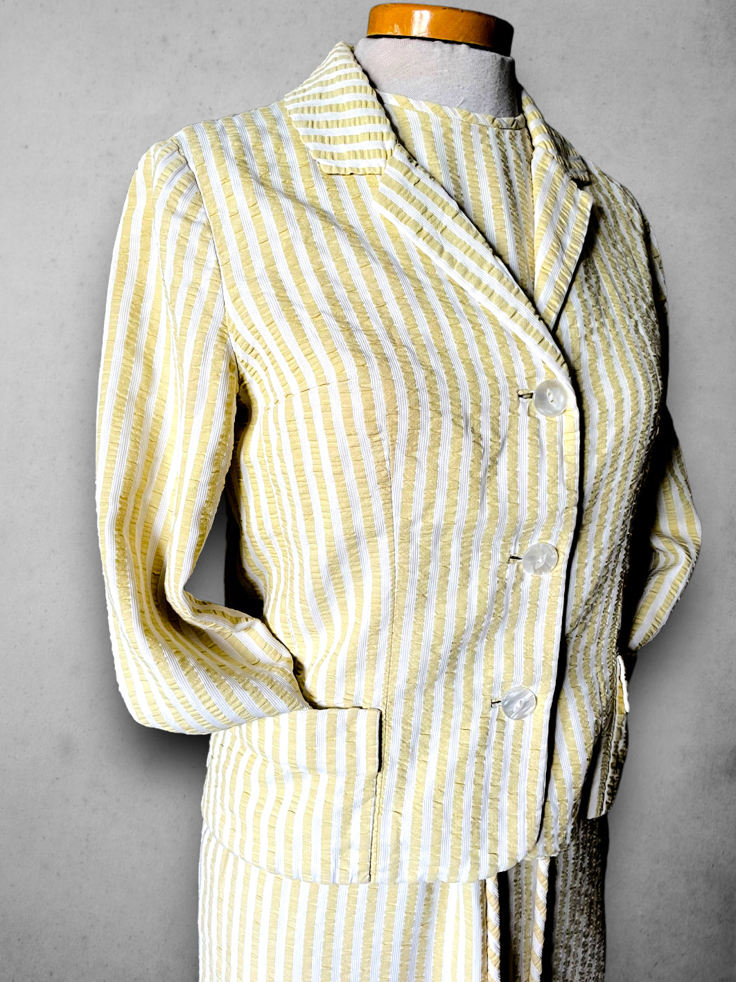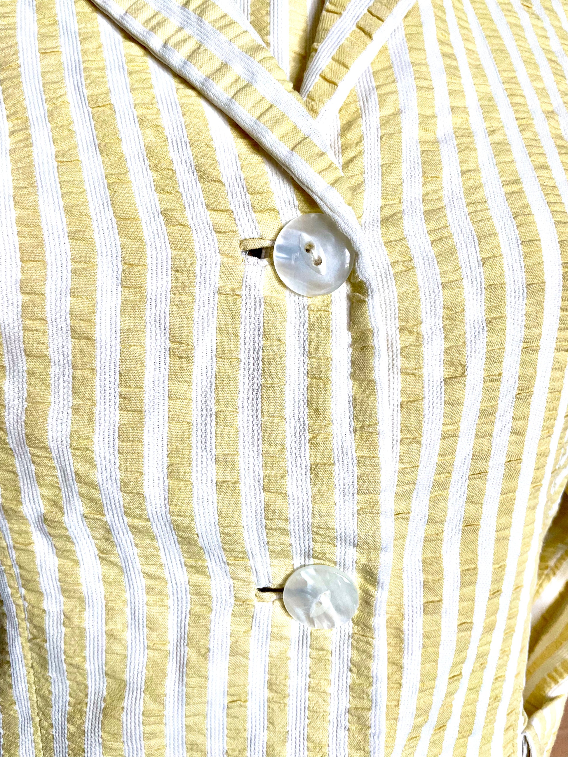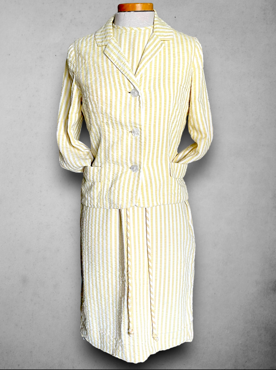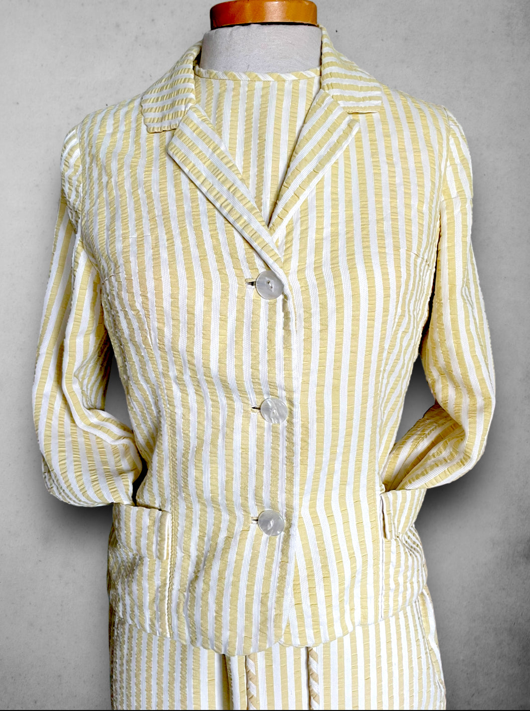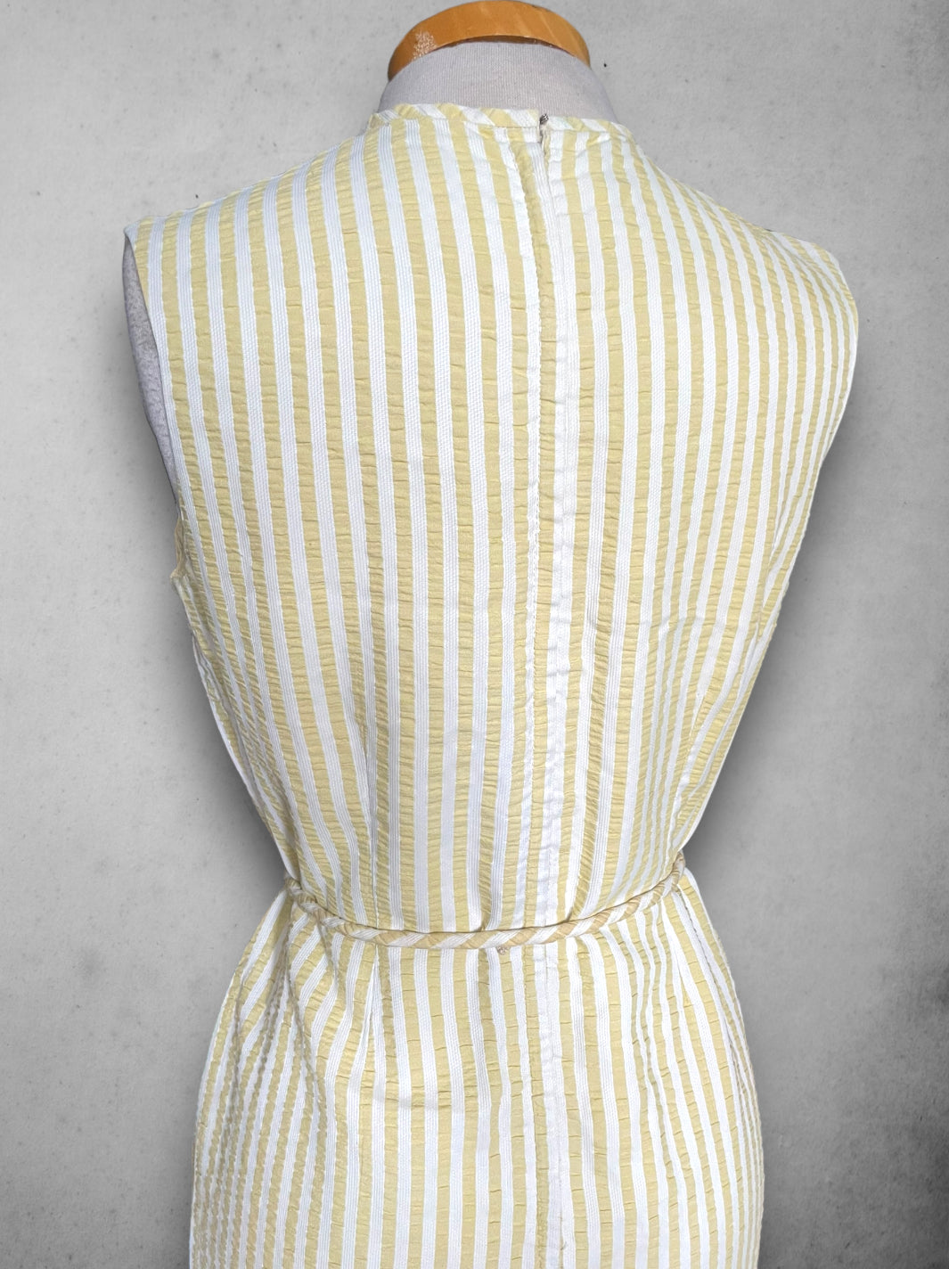 This is a gorgeous and high end designer yellow stripe gingham sleeveless dress with matching rope belt and 3/4 sleeve blazer style jacket with mother of pearl buttons.  Fully lined in both dress and jacket.  Dress has metal zipper up the back in perfect working condition as well as a hook and eye.  Blazer has two front pockets.  Rope belt is thick with some weight to it, not just a strip of fabric, thick like a rope.  No tags or labels attached.  Has a small patched area of damage where the belt ties, must have been done long ago and isn’t noticeable, especially when wearing belt and/or jacket. Damaged area shown in photos. No damage to jacket, some seaming coming loose under armpit of the lining only, nothing to main fabric outside lining.
