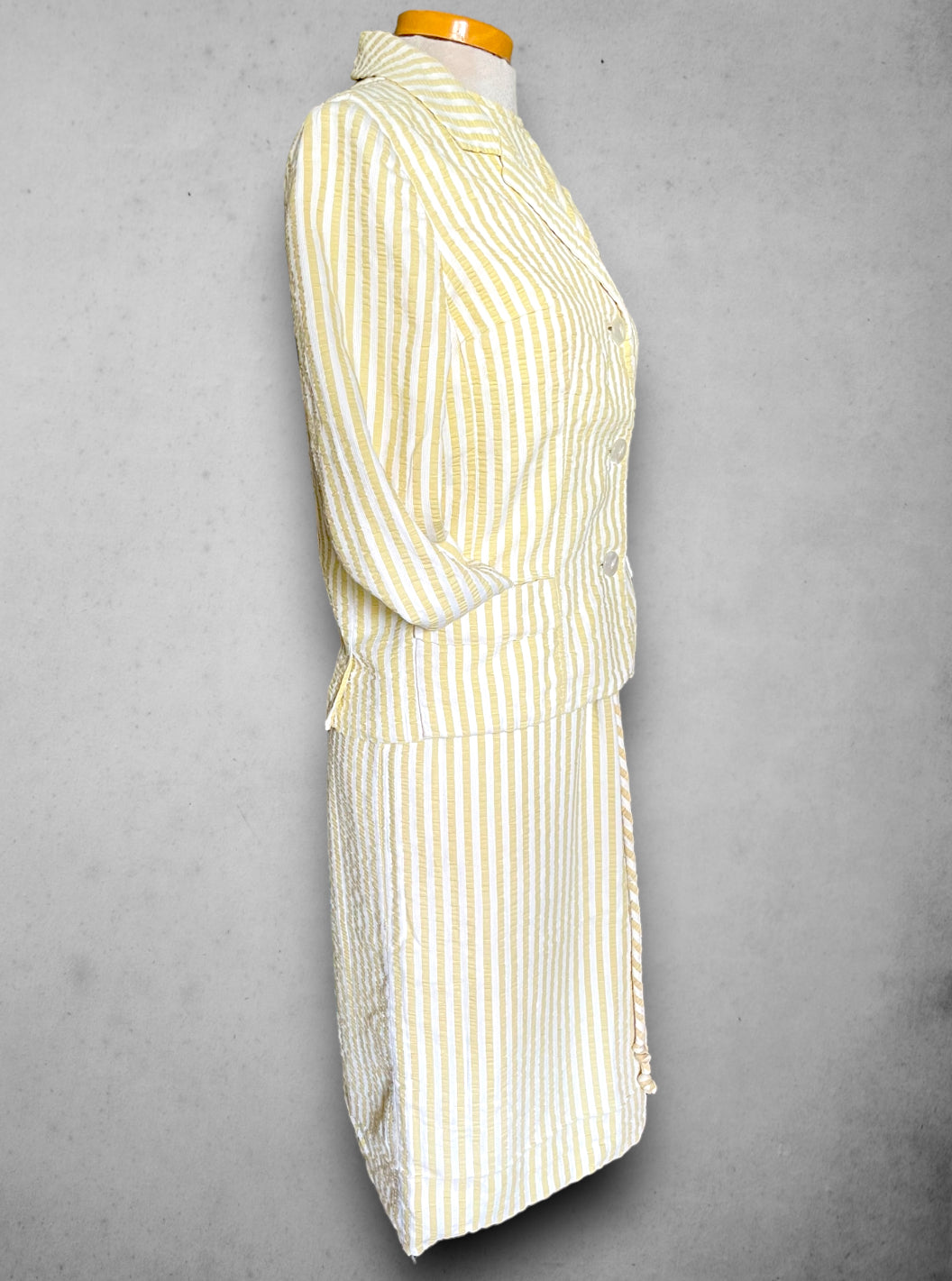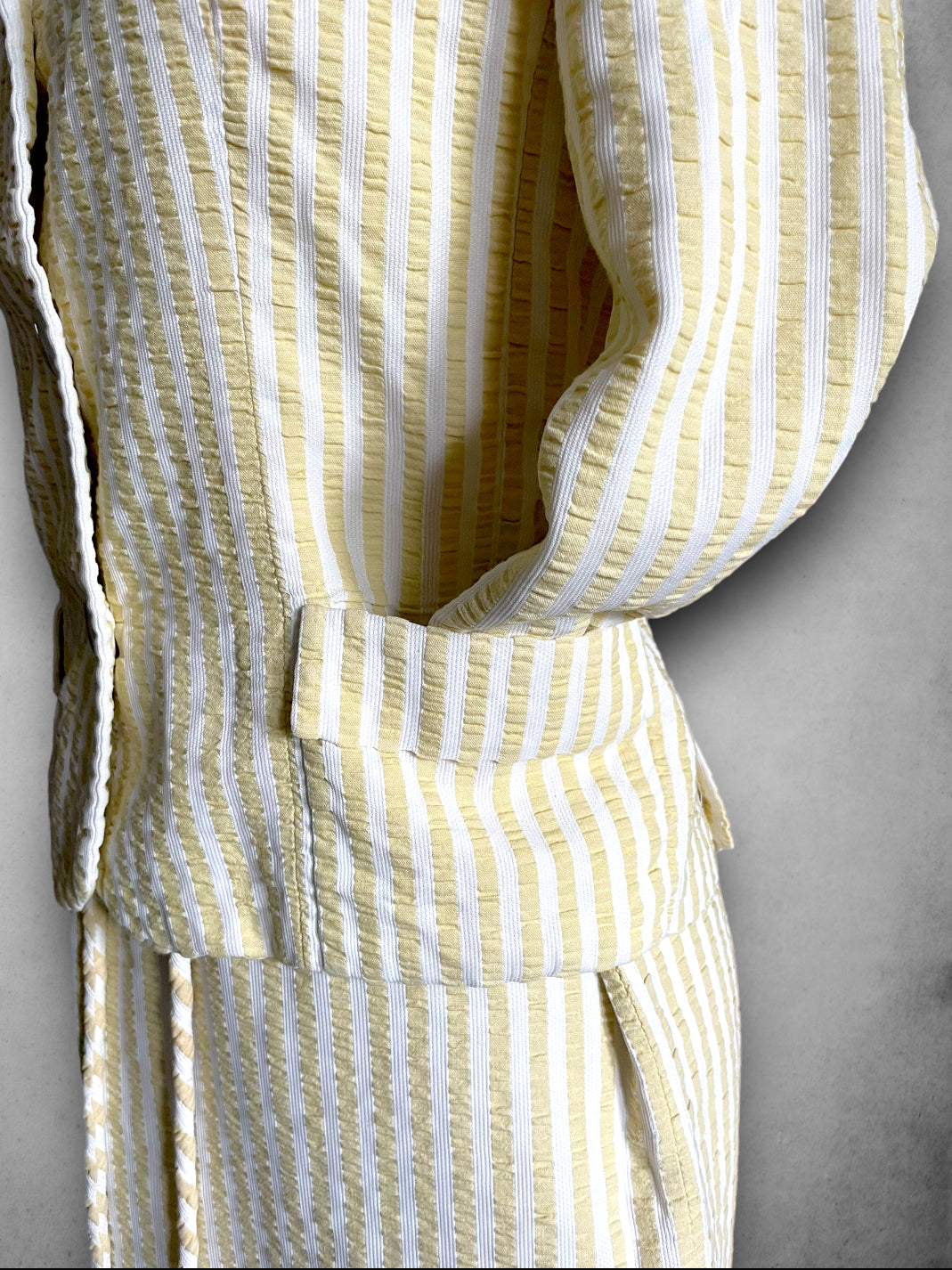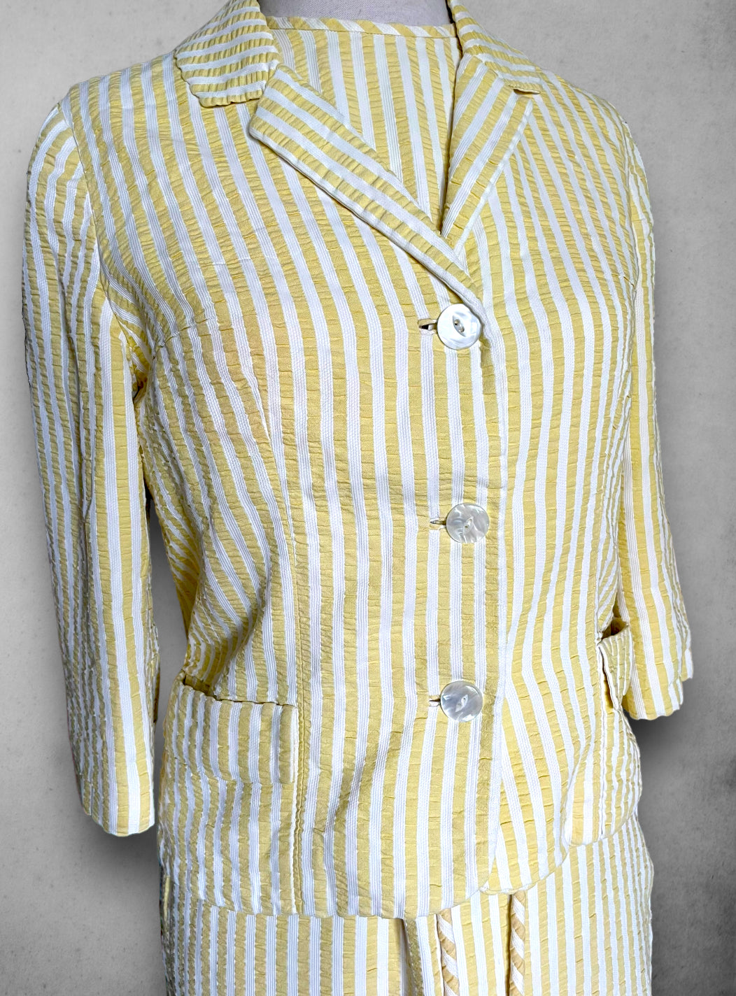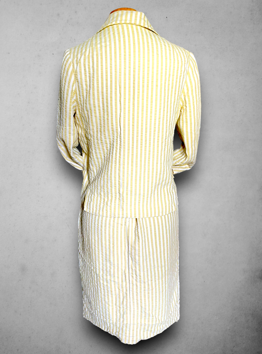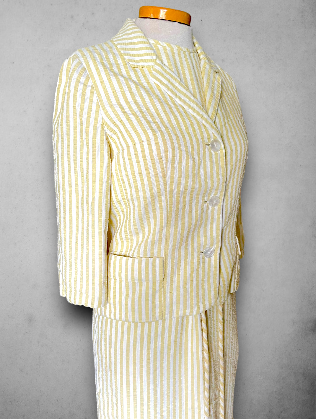 This is a gorgeous and high end designer yellow stripe gingham sleeveless dress with matching rope belt and 3/4 sleeve blazer style jacket with mother of pearl buttons.  Fully lined in both dress and jacket.  Dress has metal zipper up the back in perfect working condition as well as a hook and eye.  Blazer has two front pockets.  Rope belt is thick with some weight to it, not just a strip of fabric, thick like a rope.  No tags or labels attached.  Has a small patched area of damage where the belt ties, must have been done long ago and isn’t noticeable, especially when wearing belt and/or jacket. Damaged area shown in photos. No damage to jacket, some seaming coming loose under armpit of the lining only, nothing to main fabric outside lining.