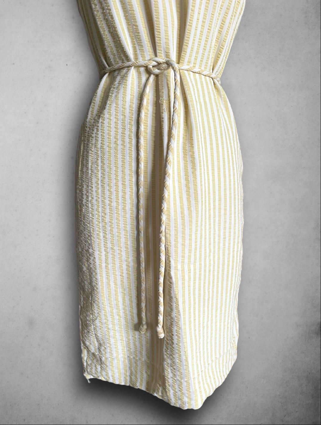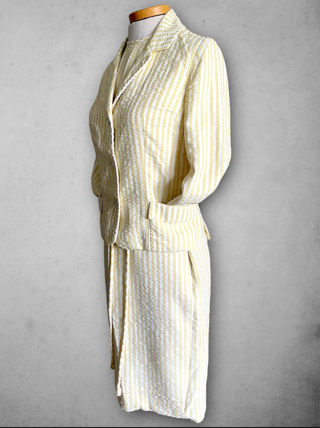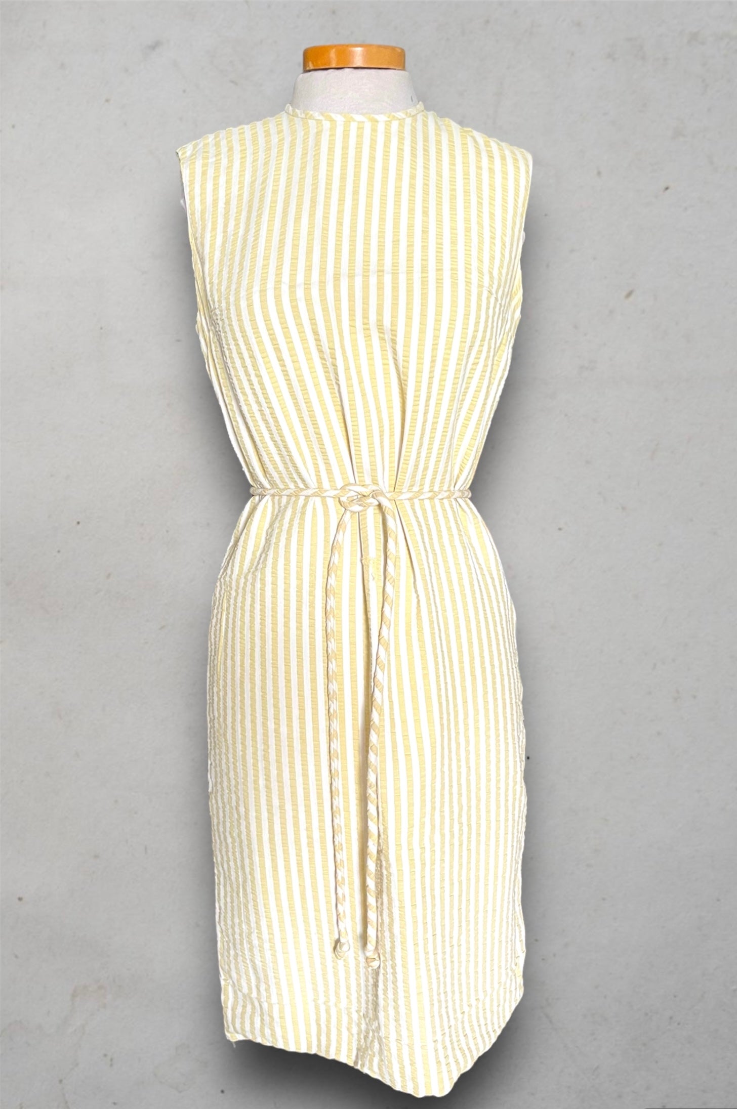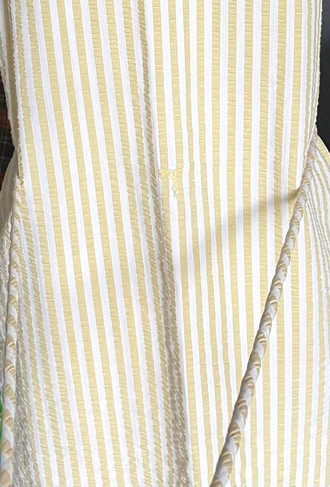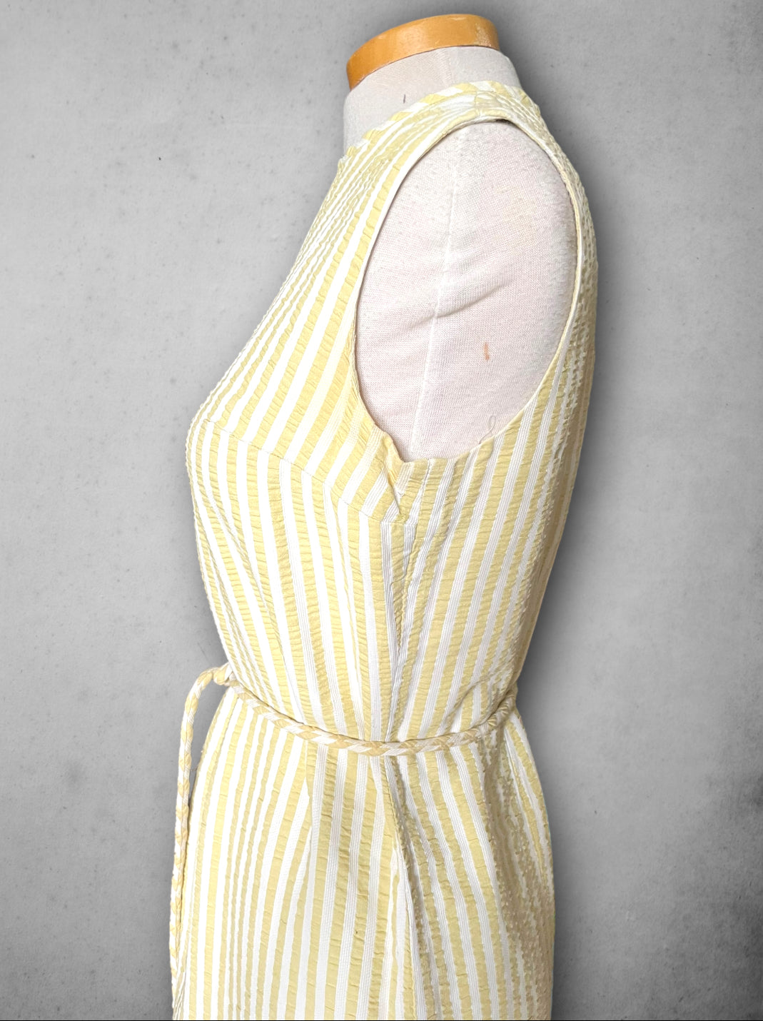 This is a gorgeous and high end designer yellow stripe gingham sleeveless dress with matching rope belt and 3/4 sleeve blazer style jacket with mother of pearl buttons.  Fully lined in both dress and jacket.  Dress has metal zipper up the back in perfect working condition as well as a hook and eye.  Blazer has two front pockets.  Rope belt is thick with some weight to it, not just a strip of fabric, thick like a rope.  No tags or labels attached.  Has a small patched area of damage where the belt ties, must have been done long ago and isn’t noticeable, especially when wearing belt and/or jacket. Damaged area shown in photos. No damage to jacket, some seaming coming loose under armpit of the lining only, nothing to main fabric outside lining.