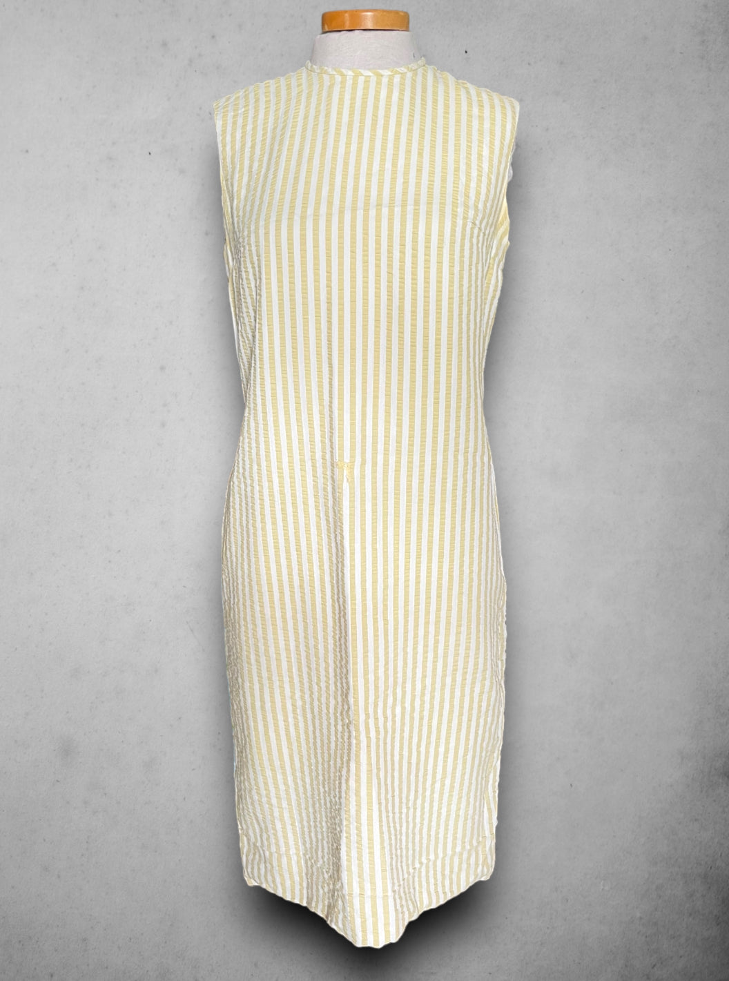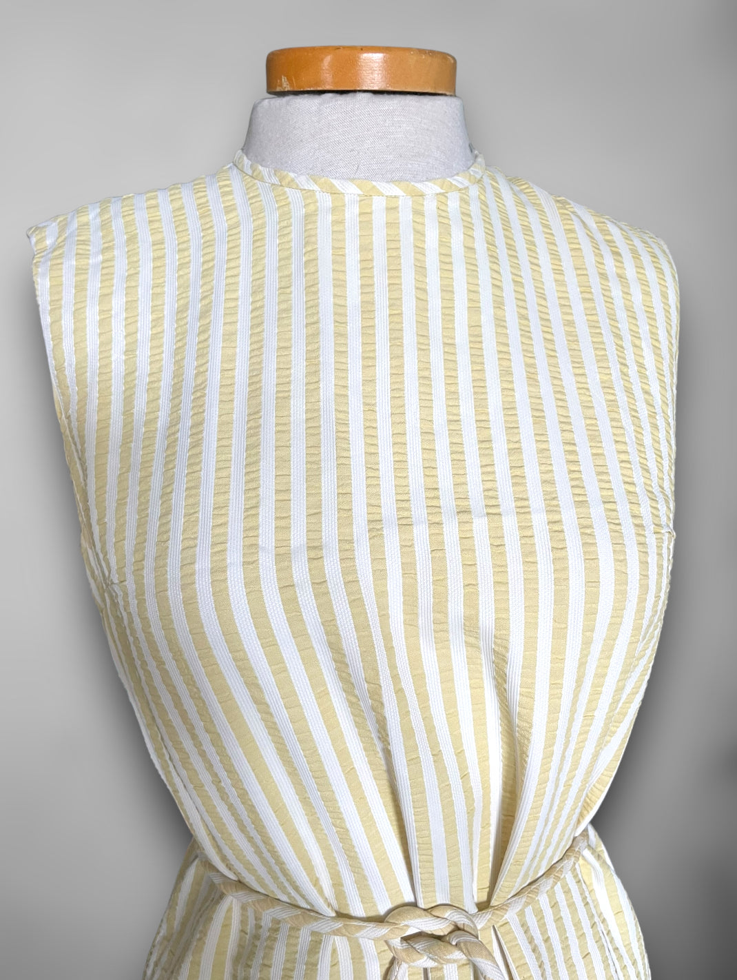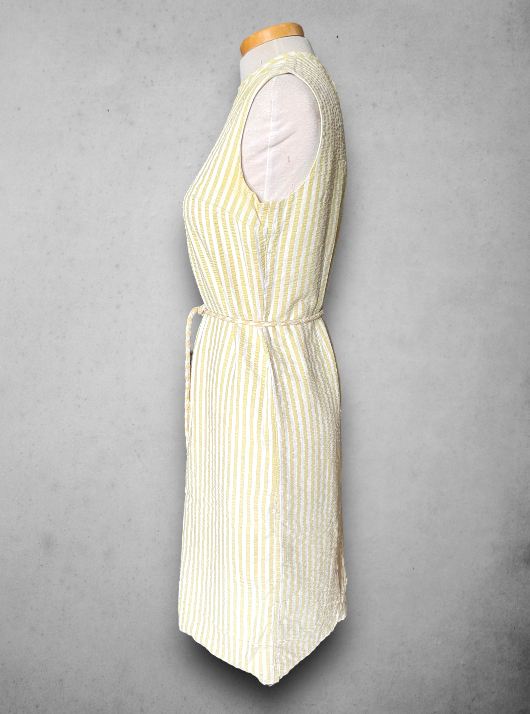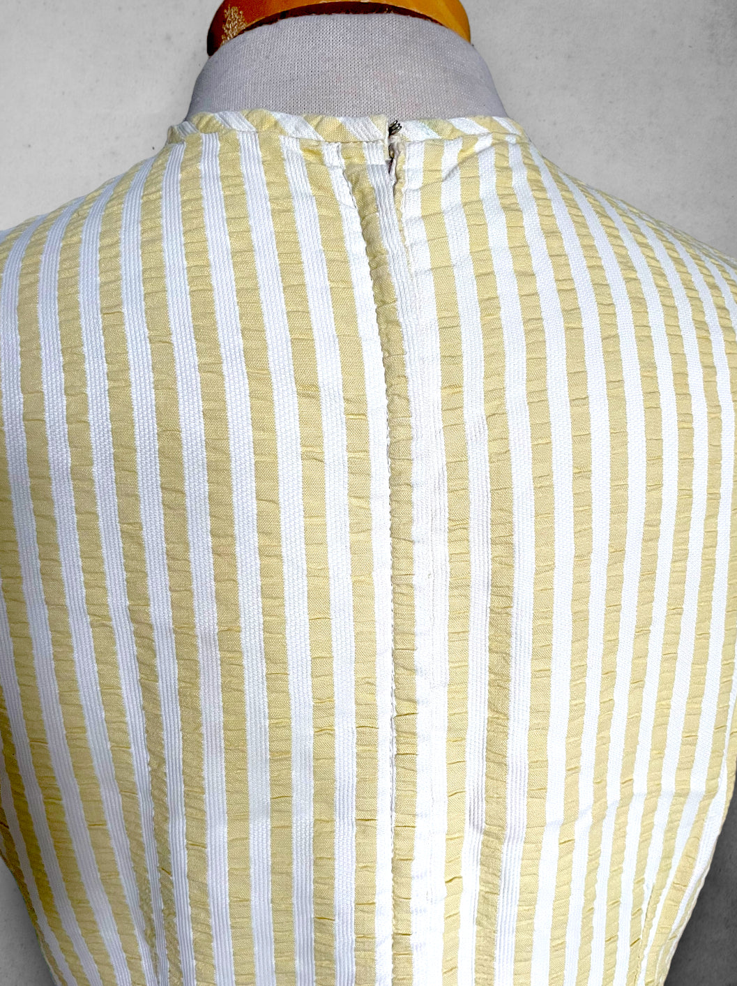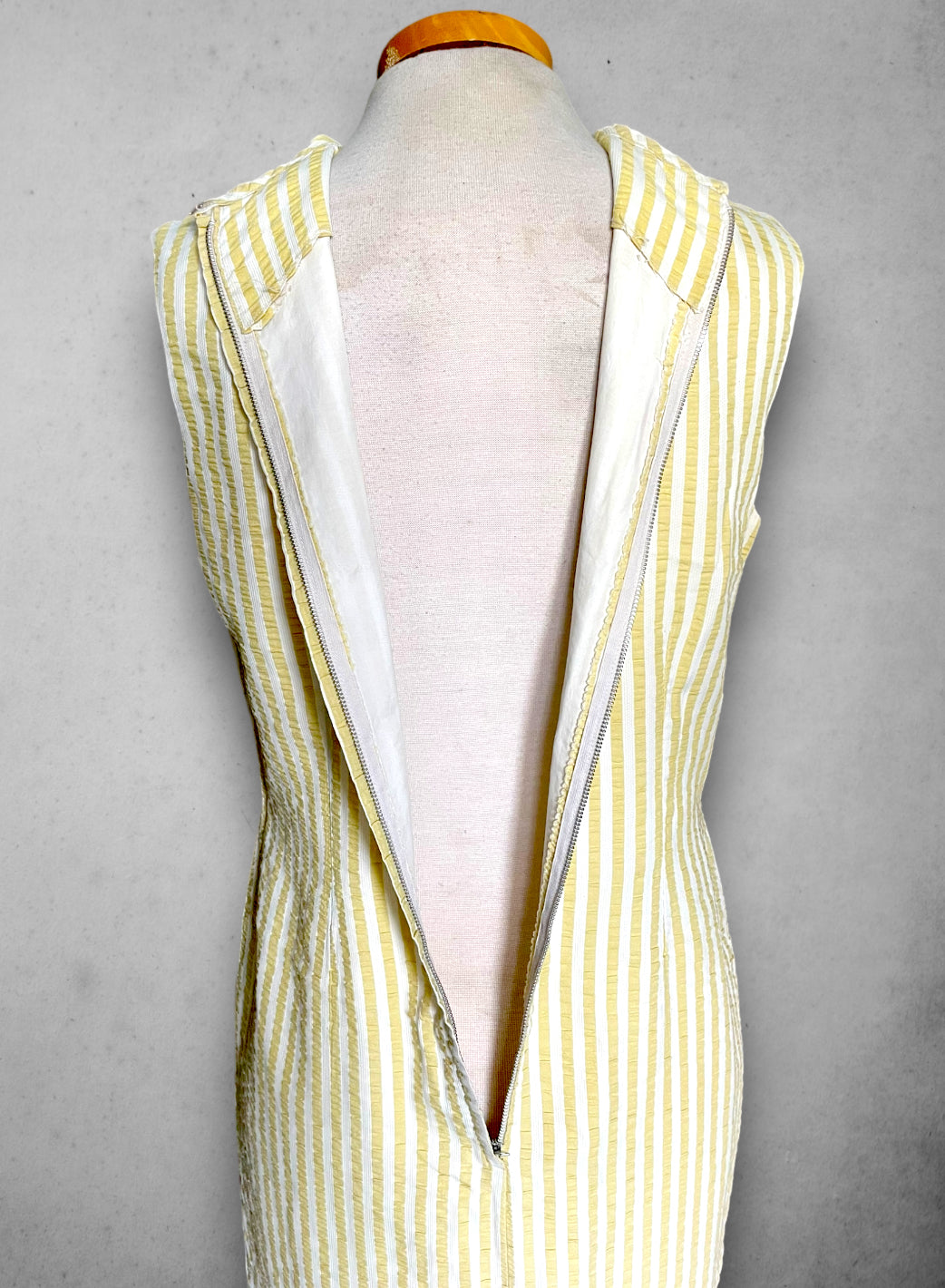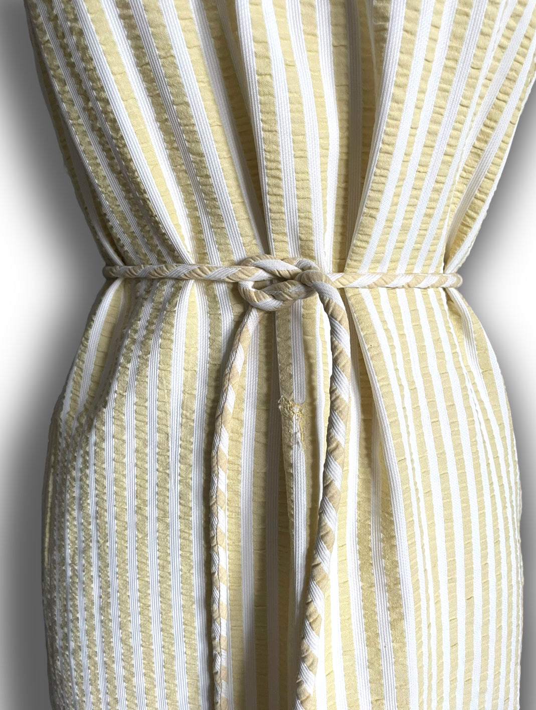 This is a gorgeous and high end designer yellow stripe gingham sleeveless dress with matching rope belt and 3/4 sleeve blazer style jacket with mother of pearl buttons.  Fully lined in both dress and jacket.  Dress has metal zipper up the back in perfect working condition as well as a hook and eye.  Blazer has two front pockets.  Rope belt is thick with some weight to it, not just a strip of fabric, thick like a rope.  No tags or labels attached.  Has a small patched area of damage where the belt ties, must have been done long ago and isn’t noticeable, especially when wearing belt and/or jacket. Damaged area shown in photos. No damage to jacket, some seaming coming loose under armpit of the lining only, nothing to main fabric outside lining.