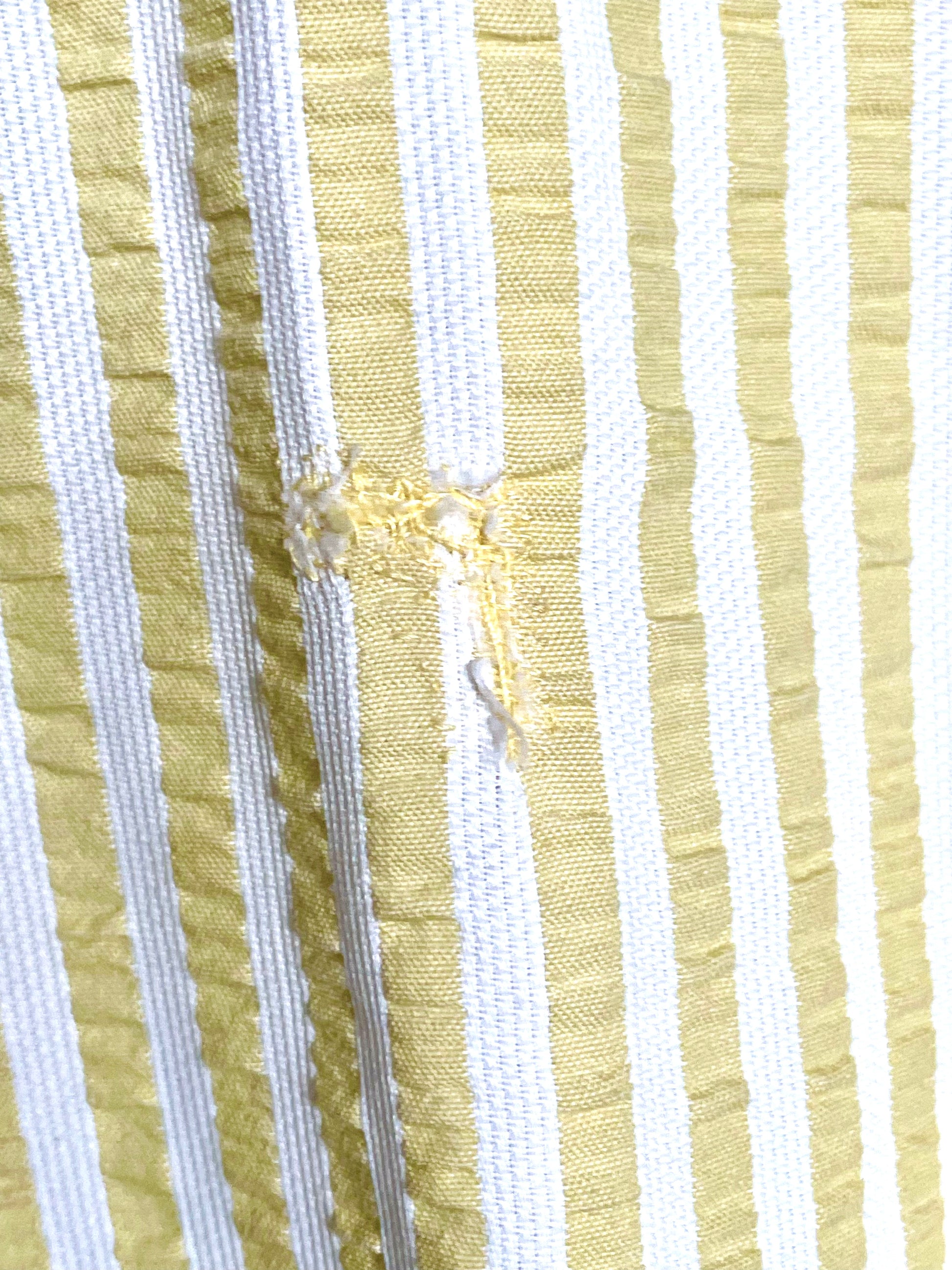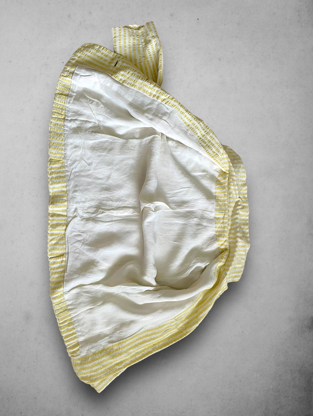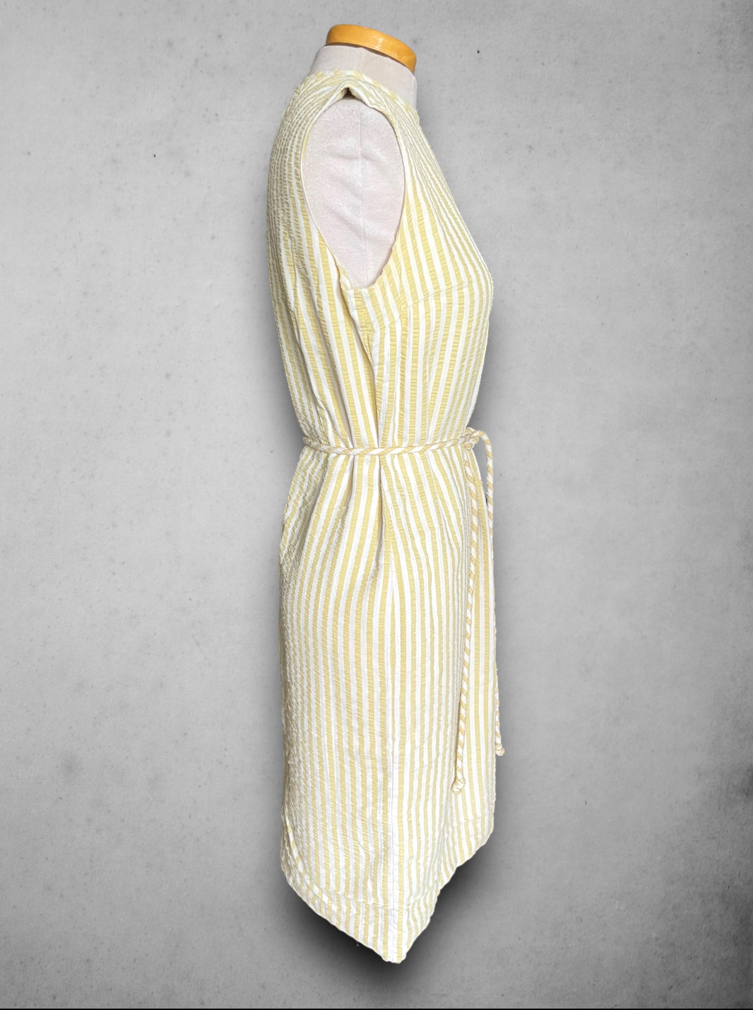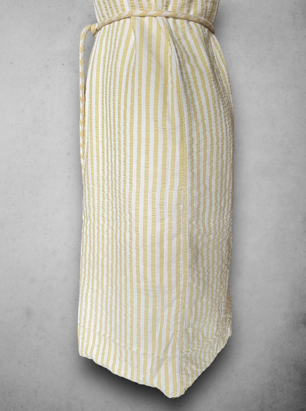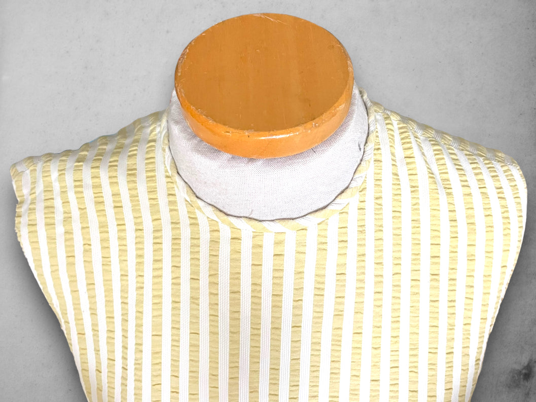 This is a gorgeous and high end designer yellow stripe gingham sleeveless dress with matching rope belt and 3/4 sleeve blazer style jacket with mother of pearl buttons.  Fully lined in both dress and jacket.  Dress has metal zipper up the back in perfect working condition as well as a hook and eye.  Blazer has two front pockets.  Rope belt is thick with some weight to it, not just a strip of fabric, thick like a rope.  No tags or labels attached.  Has a small patched area of damage where the belt ties, must have been done long ago and isn’t noticeable, especially when wearing belt and/or jacket. Damaged area shown in photos. No damage to jacket, some seaming coming loose under armpit of the lining only, nothing to main fabric outside lining.