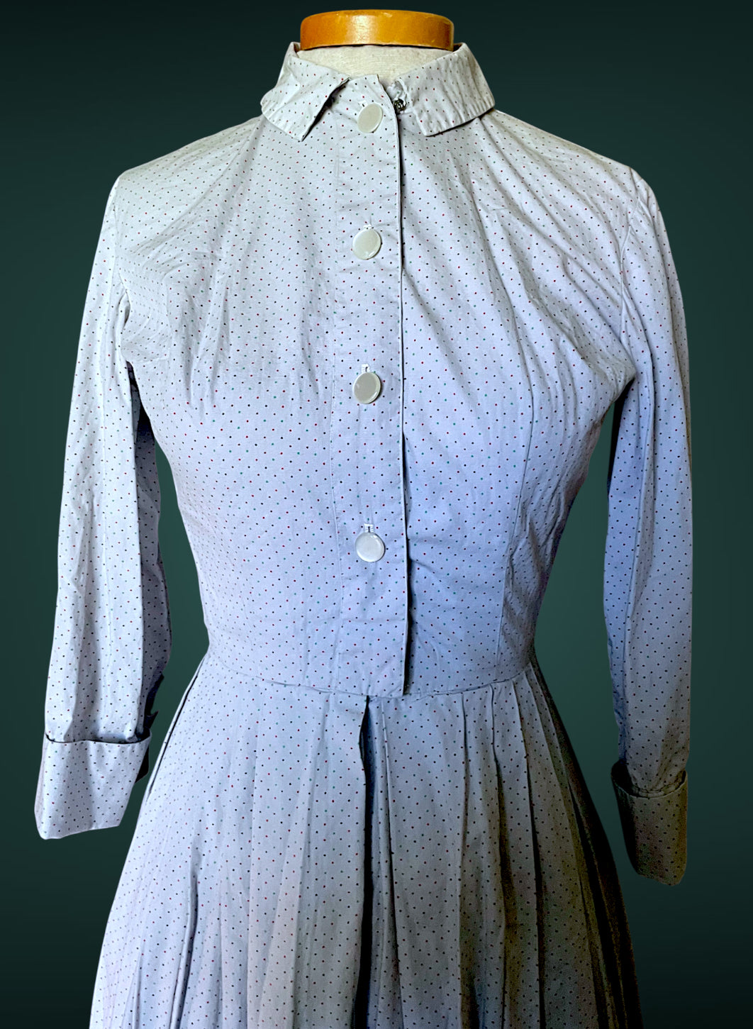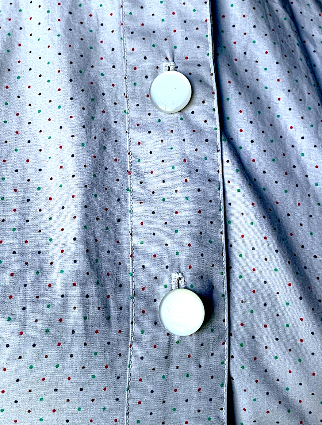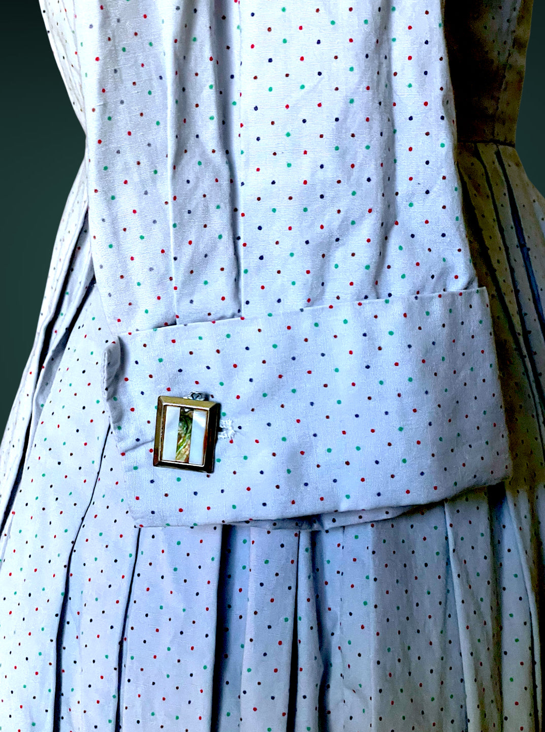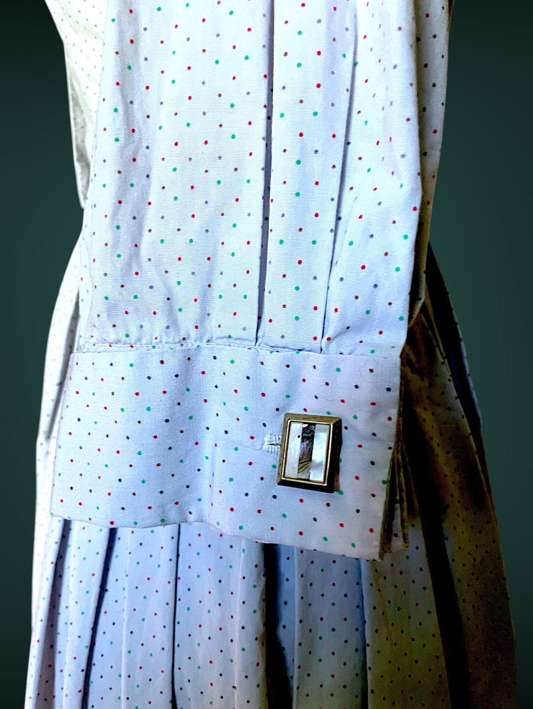 Incredible high end 1960’s A-Line full skirt, button up dress shirt dress.  Heavy cotton fabric in gray with tiny red, green & blue polka dots.  Gorgeous opalescent mother of pearl buttons from collar to waist.  Collar folds over and has a hidden snap at corner by top button to make sure it lays perfectly flat. Long sleeves with cuffs that takes cuff links to close. (Cuff links pictured not included) Dress shirt construction back with two middle back pleats.  Waist is heavily and expertly pleated, still pressed.  Center of skirt at waist has a 6” intended split to make it easier to put on.  Has a hook and eye at waist below bottom button to close.  Slit not visible when worn. No tags or labels remain.  Bottom hem has additional 3.25” seam allowance.  Reinforced construction at neck.  Really amazing dress. Oh and it has POCKETS! Photos don’t do justice.