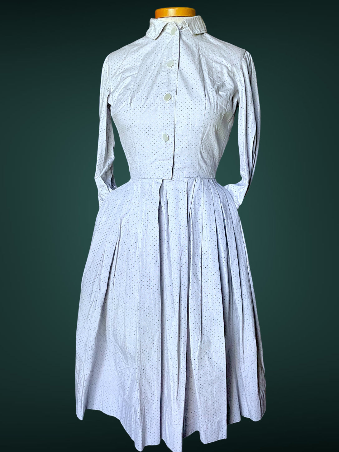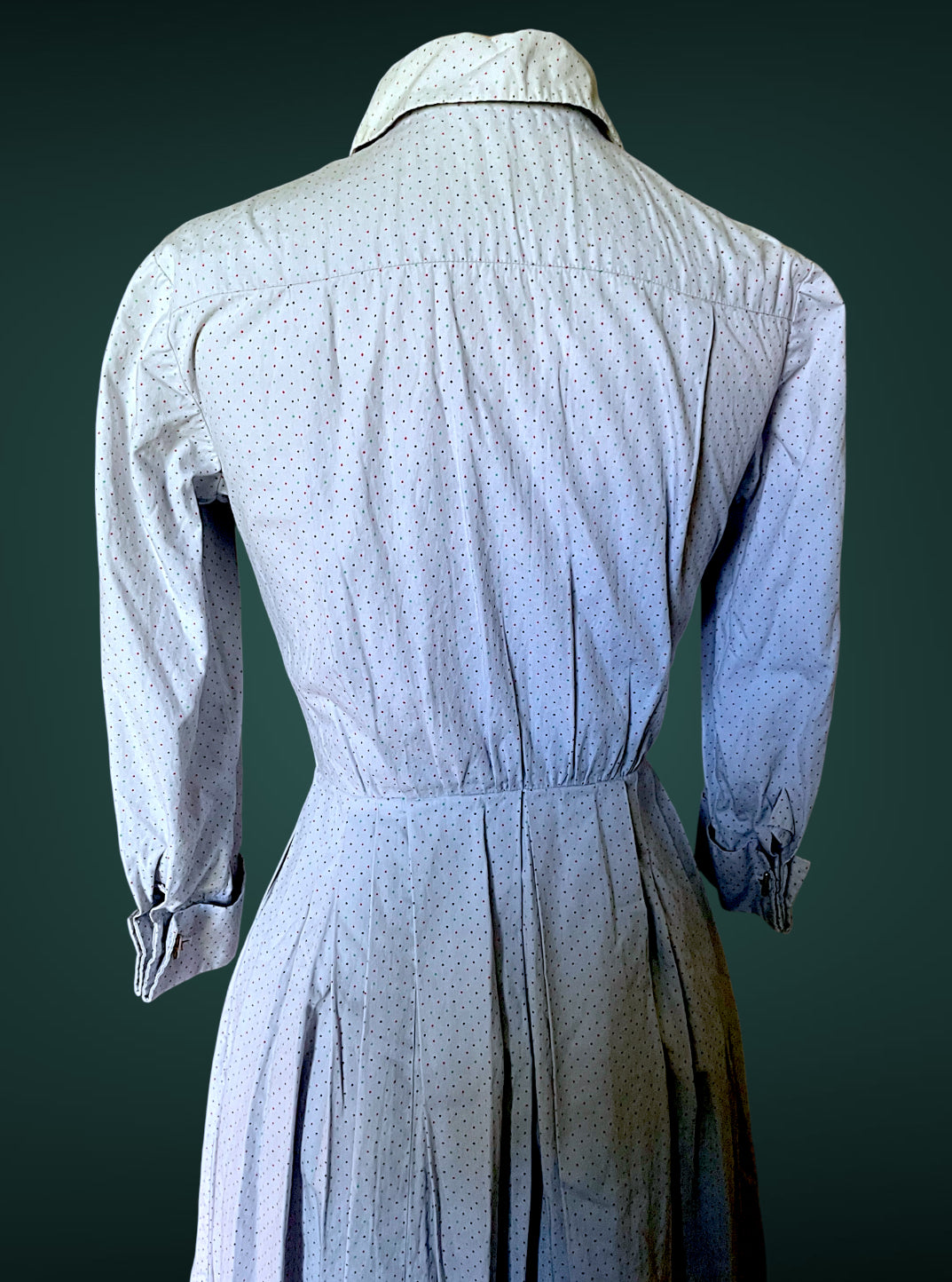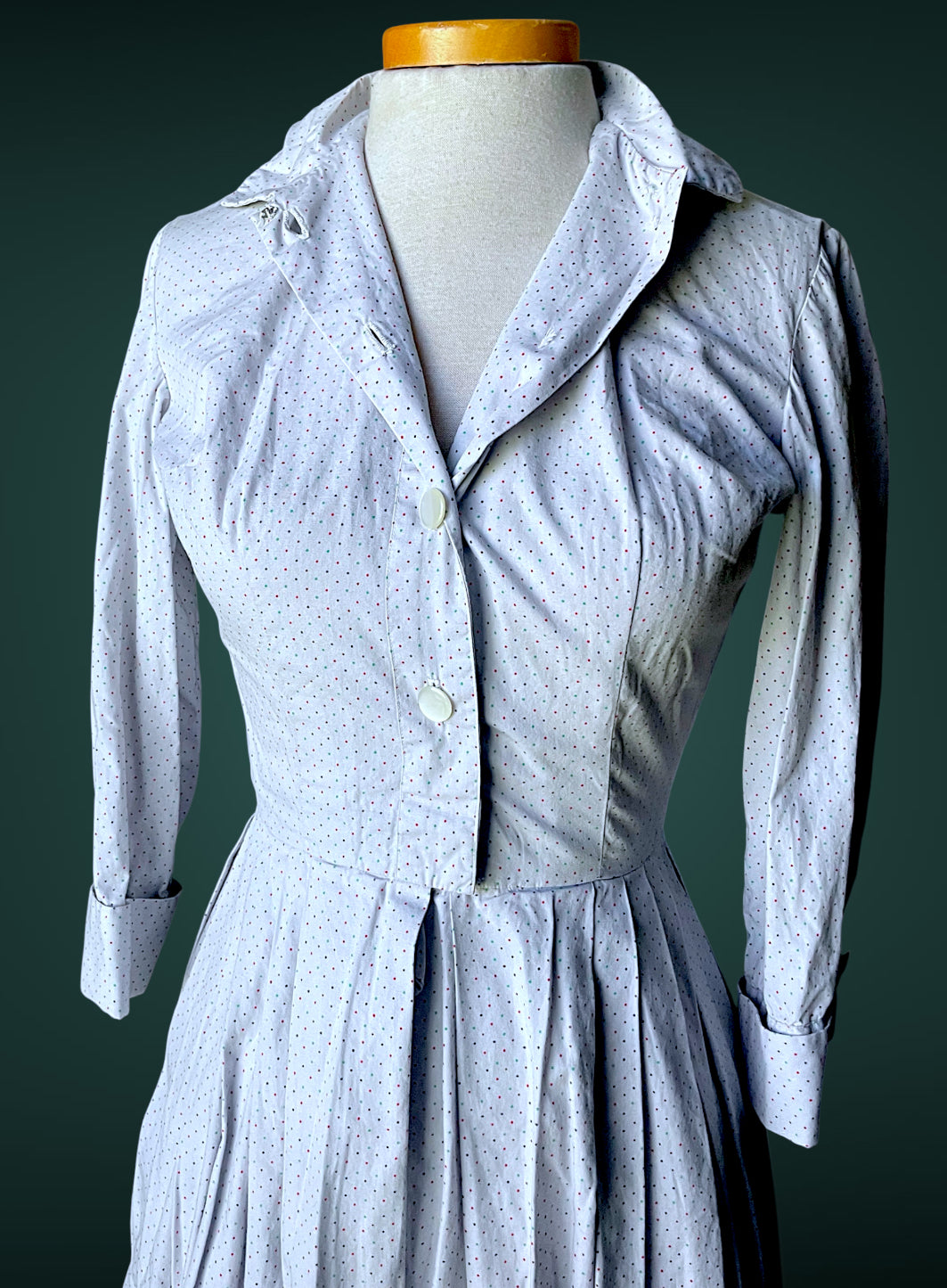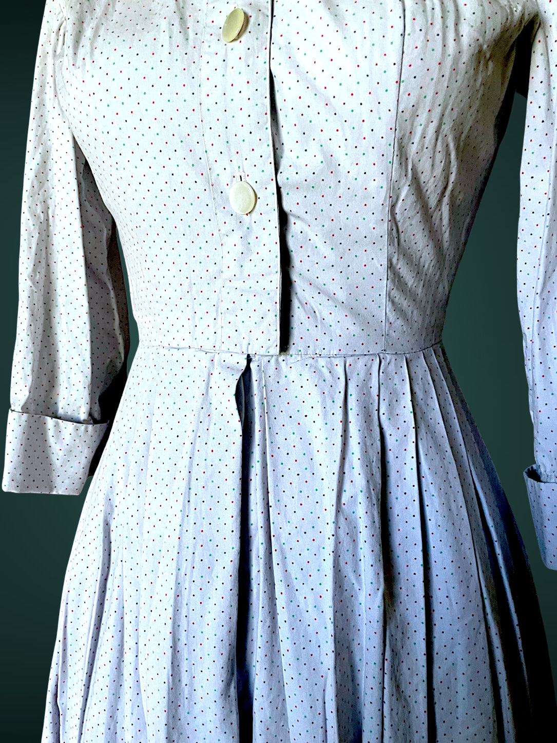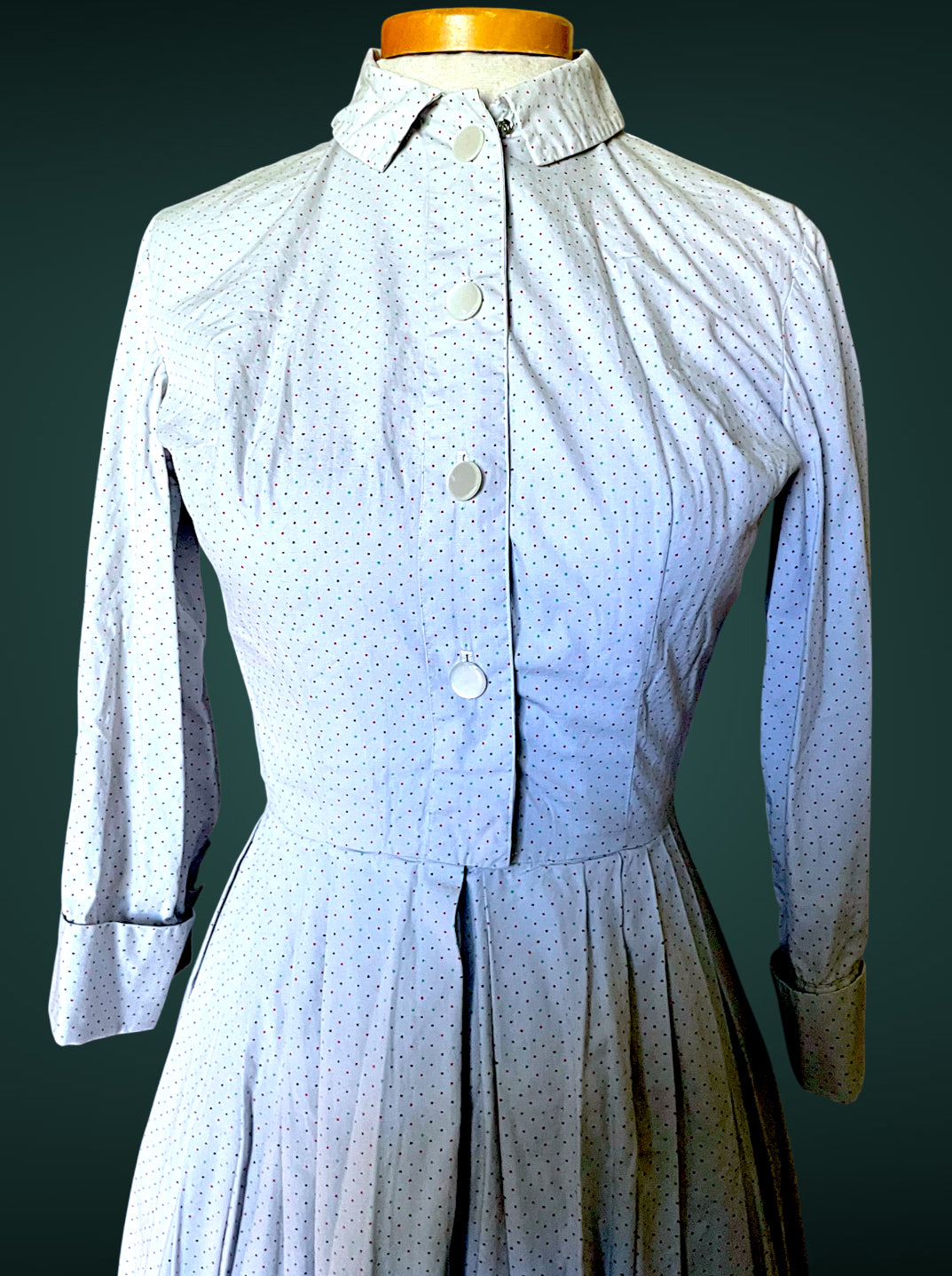 Incredible high end 1960’s A-Line full skirt, button up dress shirt dress.  Heavy cotton fabric in gray with tiny red, green & blue polka dots.  Gorgeous opalescent mother of pearl buttons from collar to waist.  Collar folds over and has a hidden snap at corner by top button to make sure it lays perfectly flat. Long sleeves with cuffs that takes cuff links to close. (Cuff links pictured not included) Dress shirt construction back with two middle back pleats.  Waist is heavily and expertly pleated, still pressed.  Center of skirt at waist has a 6” intended split to make it easier to put on.  Has a hook and eye at waist below bottom button to close.  Slit not visible when worn. No tags or labels remain.  Bottom hem has additional 3.25” seam allowance.  Reinforced construction at neck.  Really amazing dress. Oh and it has POCKETS! Photos don’t do justice.