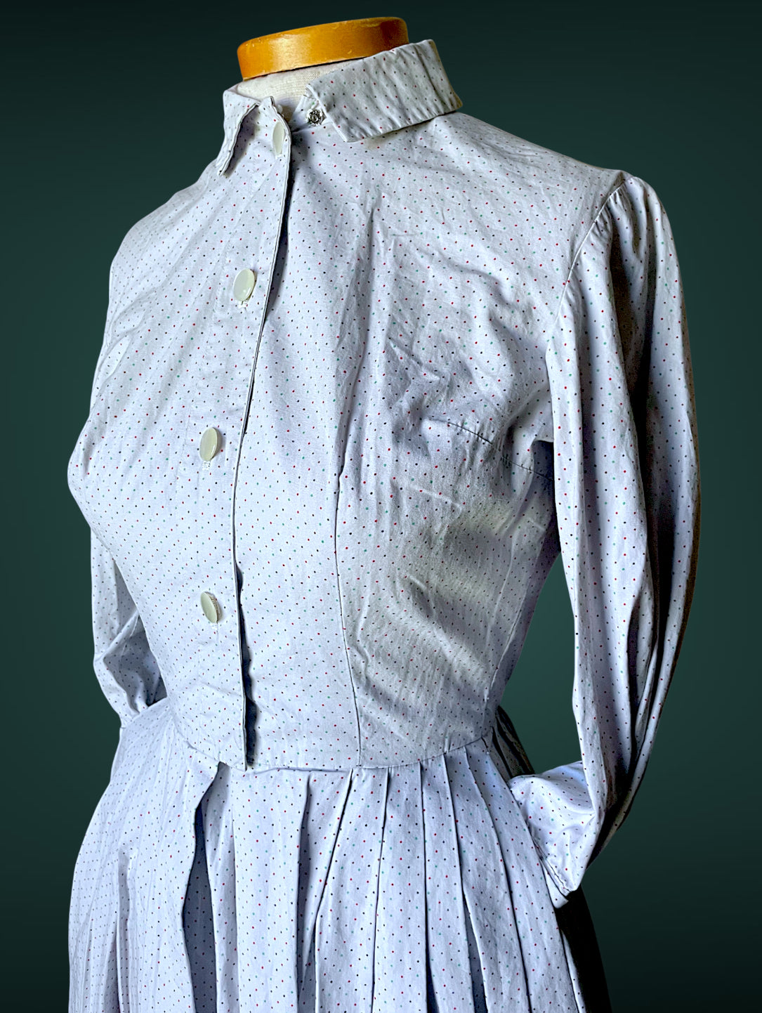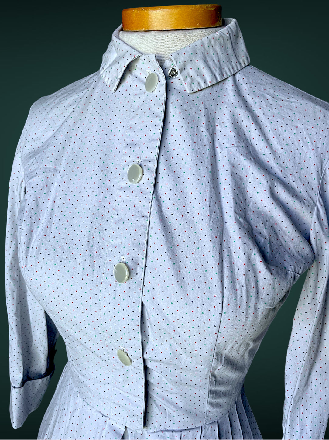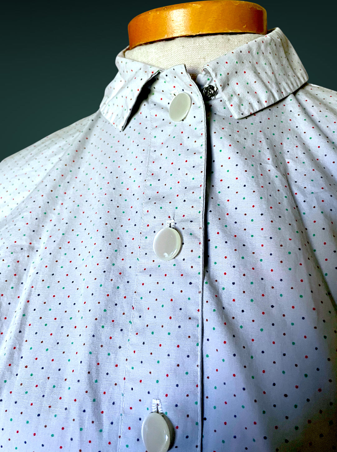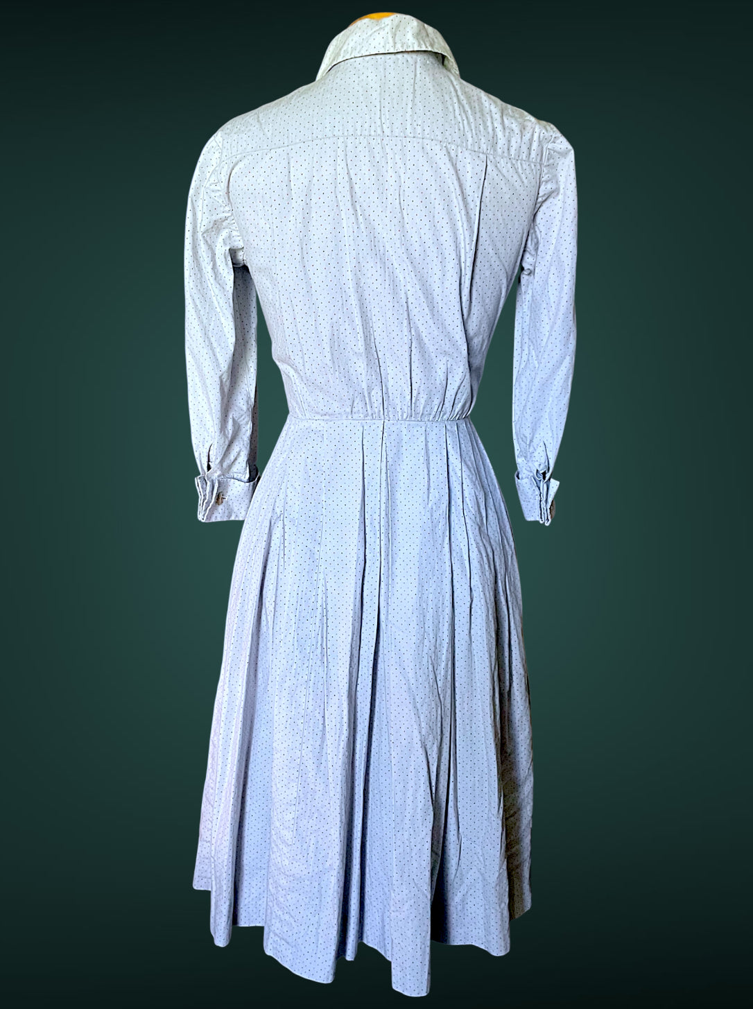 Incredible high end 1960’s A-Line full skirt, button up dress shirt dress.  Heavy cotton fabric in gray with tiny red, green & blue polka dots.  Gorgeous opalescent mother of pearl buttons from collar to waist.  Collar folds over and has a hidden snap at corner by top button to make sure it lays perfectly flat. Long sleeves with cuffs that takes cuff links to close. (Cuff links pictured not included) Dress shirt construction back with two middle back pleats.  Waist is heavily and expertly pleated, still pressed.  Center of skirt at waist has a 6” intended split to make it easier to put on.  Has a hook and eye at waist below bottom button to close.  Slit not visible when worn. No tags or labels remain.  Bottom hem has additional 3.25” seam allowance.  Reinforced construction at neck.  Really amazing dress. Oh and it has POCKETS! Photos don’t do justice.