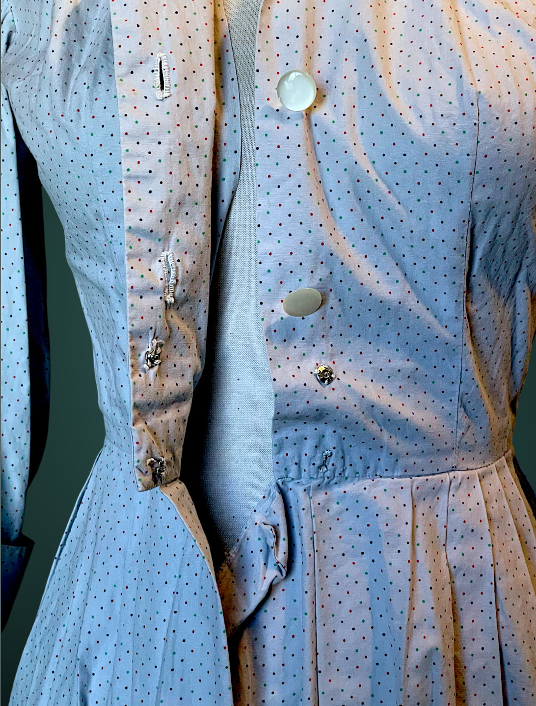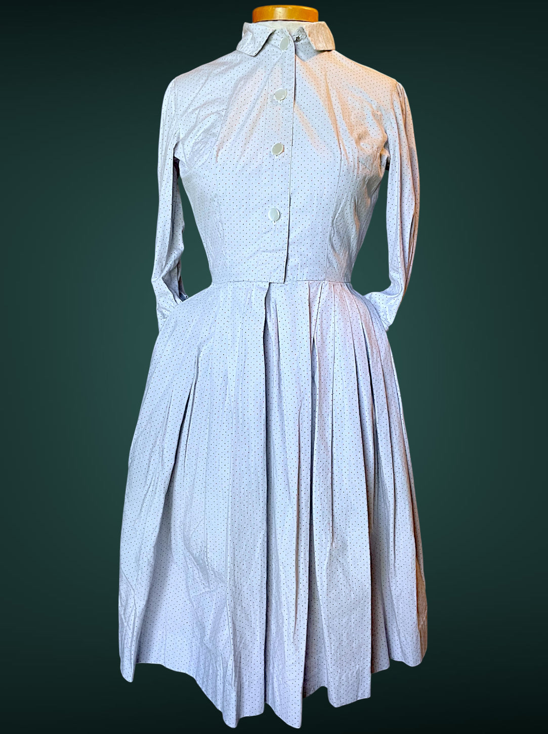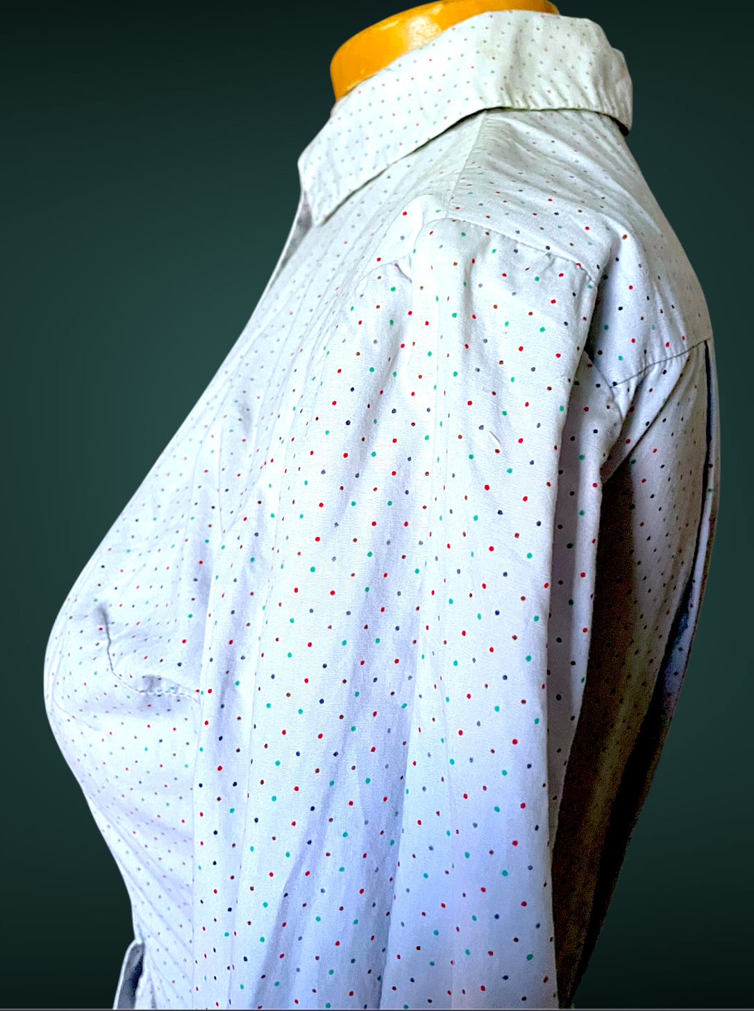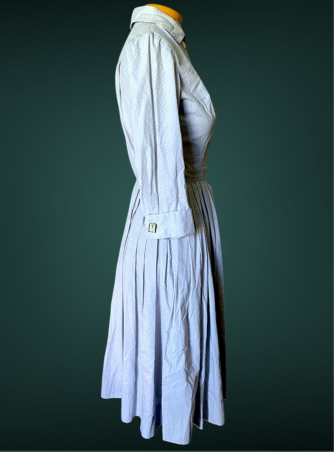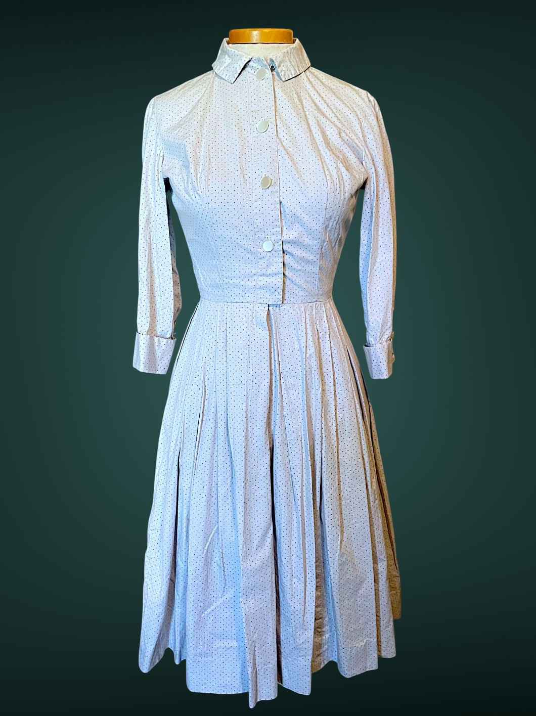 Incredible high end 1960’s A-Line full skirt, button up dress shirt dress.  Heavy cotton fabric in gray with tiny red, green & blue polka dots.  Gorgeous opalescent mother of pearl buttons from collar to waist.  Collar folds over and has a hidden snap at corner by top button to make sure it lays perfectly flat. Long sleeves with cuffs that takes cuff links to close. (Cuff links pictured not included) Dress shirt construction back with two middle back pleats.  Waist is heavily and expertly pleated, still pressed.  Center of skirt at waist has a 6” intended split to make it easier to put on.  Has a hook and eye at waist below bottom button to close.  Slit not visible when worn. No tags or labels remain.  Bottom hem has additional 3.25” seam allowance.  Reinforced construction at neck.  Really amazing dress. Oh and it has POCKETS! Photos don’t do justice.