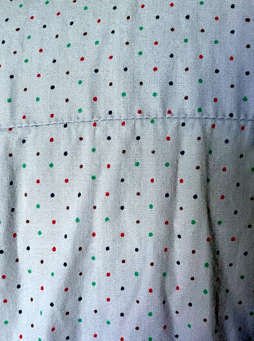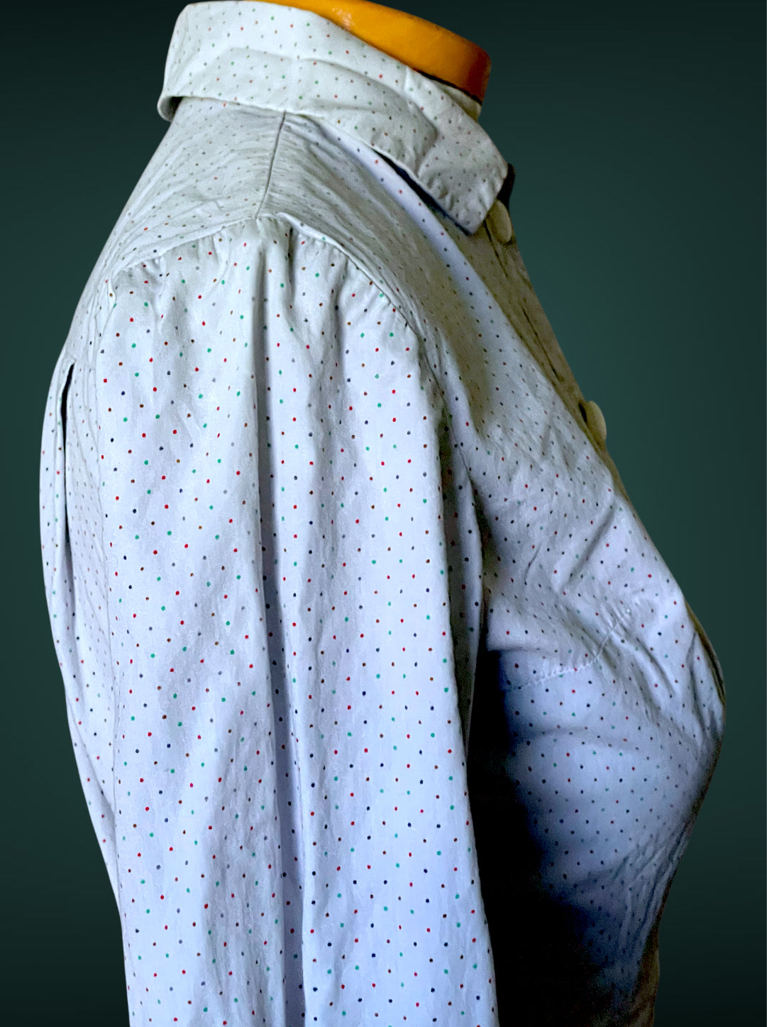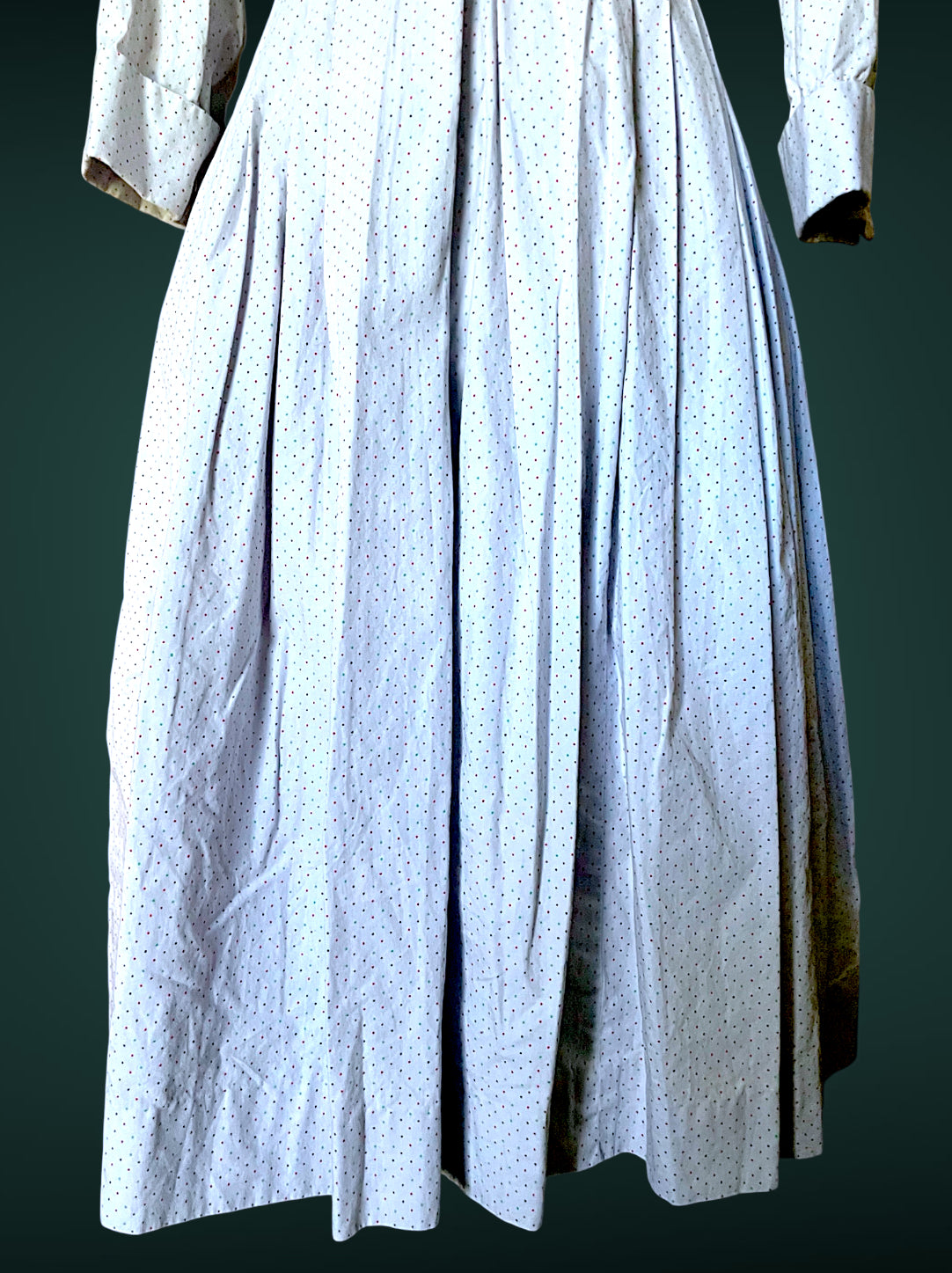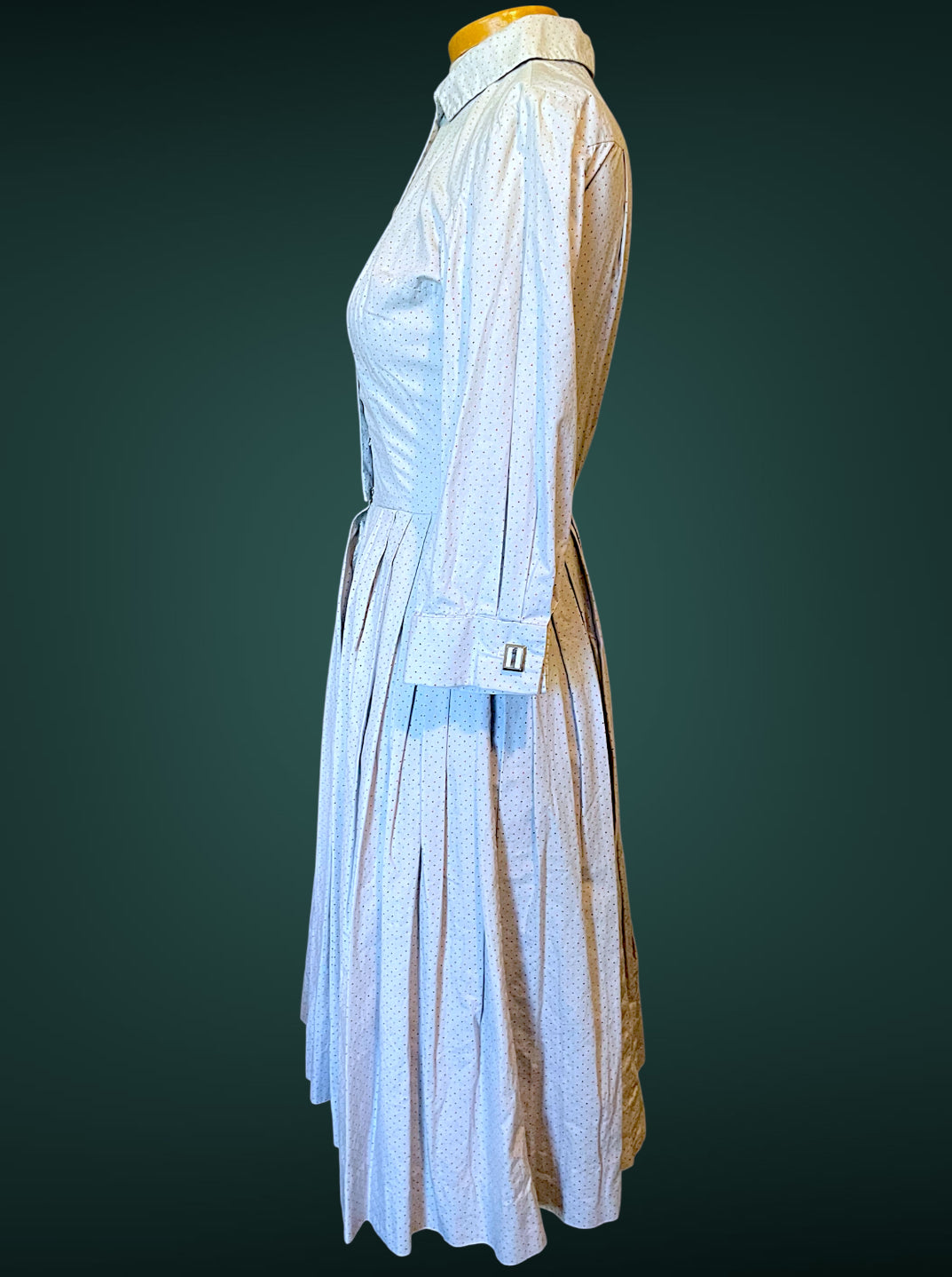 Incredible high end 1960’s A-Line full skirt, button up dress shirt dress.  Heavy cotton fabric in gray with tiny red, green & blue polka dots.  Gorgeous opalescent mother of pearl buttons from collar to waist.  Collar folds over and has a hidden snap at corner by top button to make sure it lays perfectly flat. Long sleeves with cuffs that takes cuff links to close. (Cuff links pictured not included) Dress shirt construction back with two middle back pleats.  Waist is heavily and expertly pleated, still pressed.  Center of skirt at waist has a 6” intended split to make it easier to put on.  Has a hook and eye at waist below bottom button to close.  Slit not visible when worn. No tags or labels remain.  Bottom hem has additional 3.25” seam allowance.  Reinforced construction at neck.  Really amazing dress. Oh and it has POCKETS! Photos don’t do justice.
