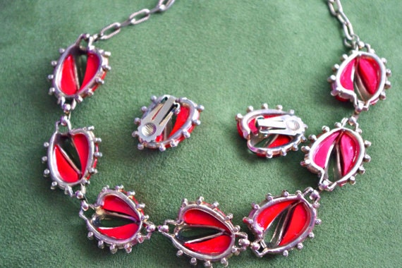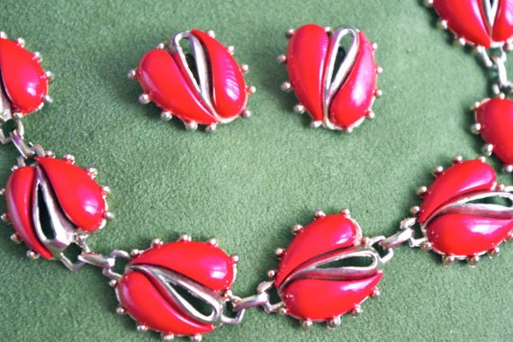 Vintage 1950's Cherry Red Rose Art Deco Thermoset Demi Parure Necklace & Earrings Set