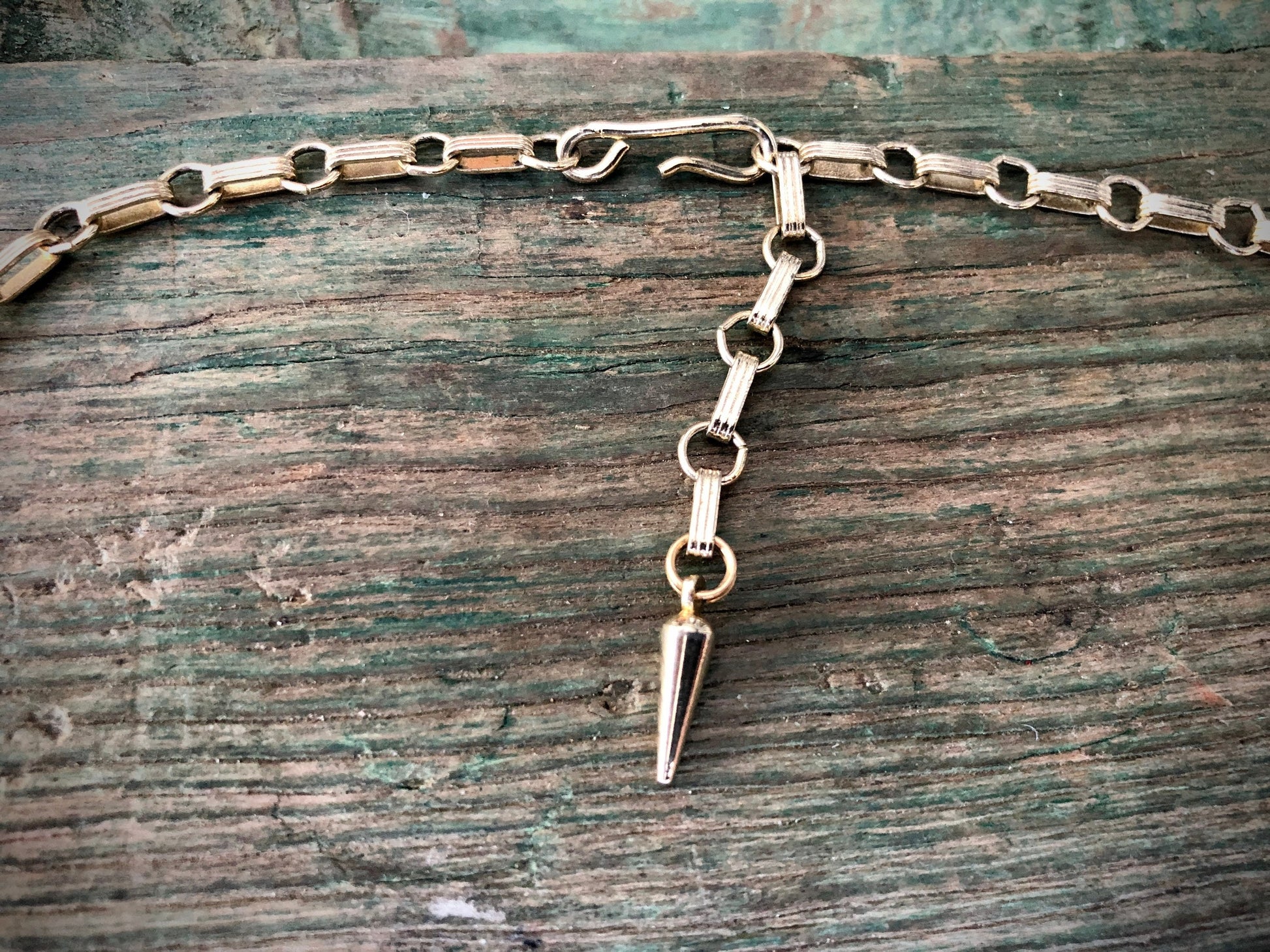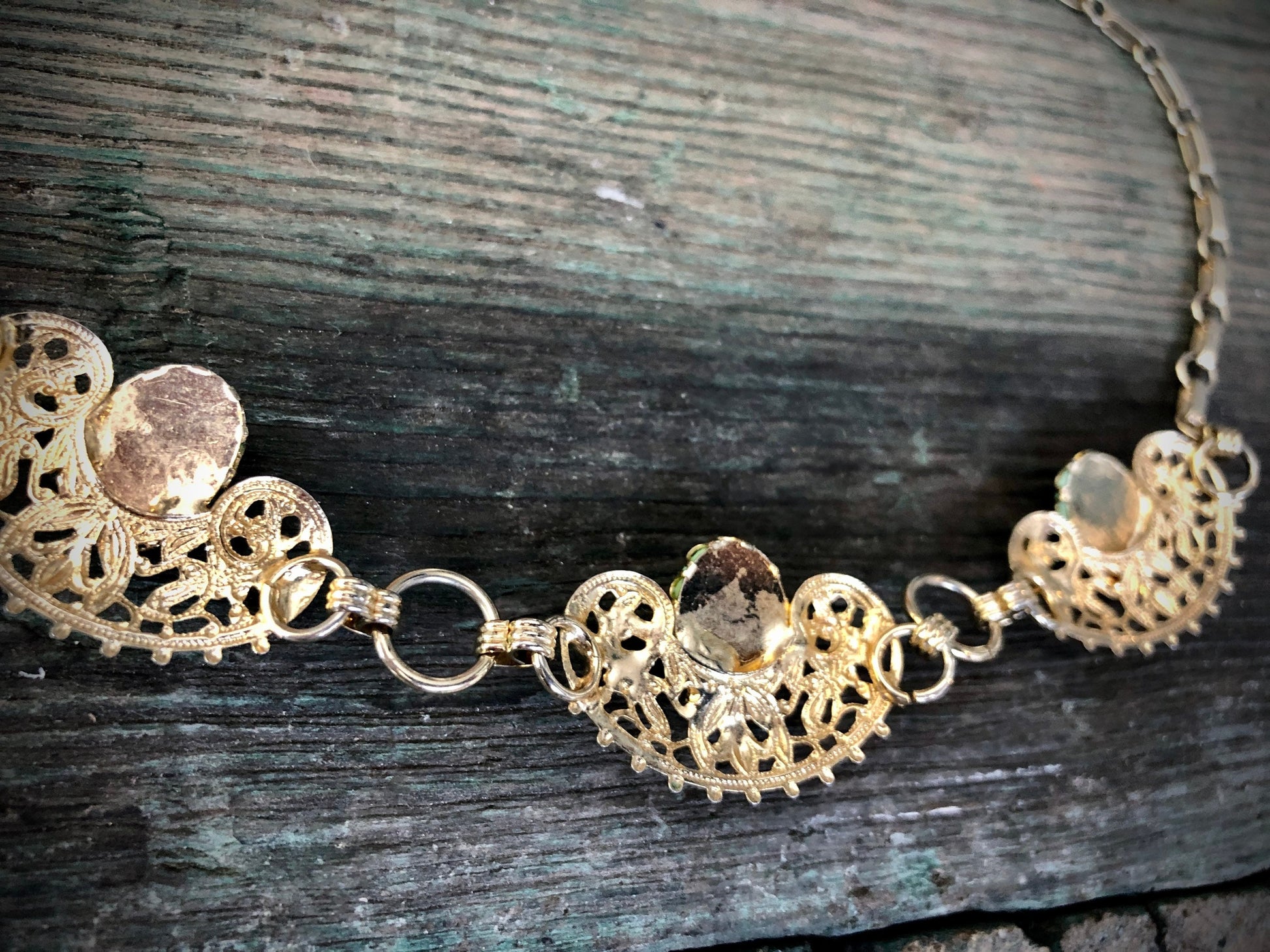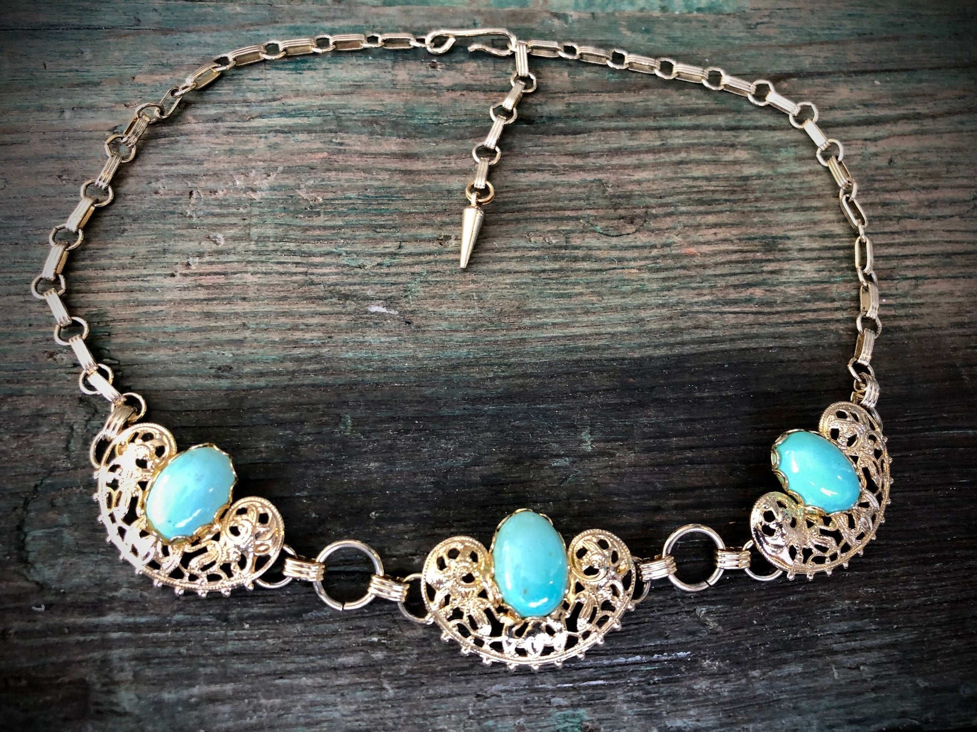 Vintage 1950s Gold Stamping Panel Necklace with fancy bezel set Robins Egg Turquoise Blue Glass Cabochons on a gold chain. Hook and eye style closure.