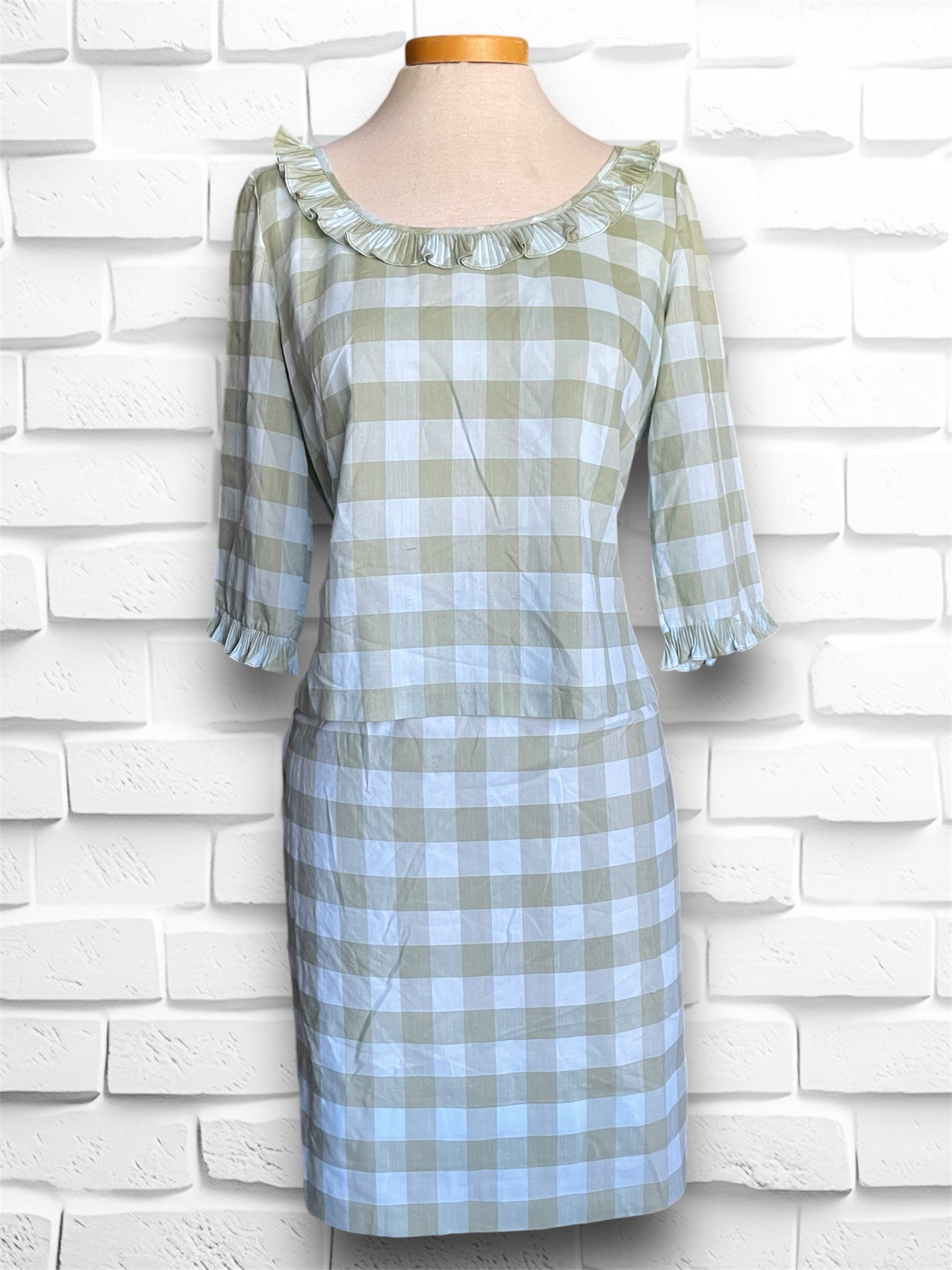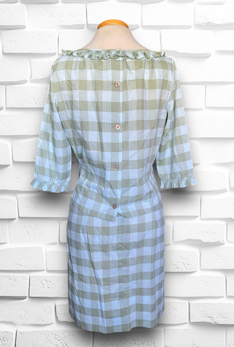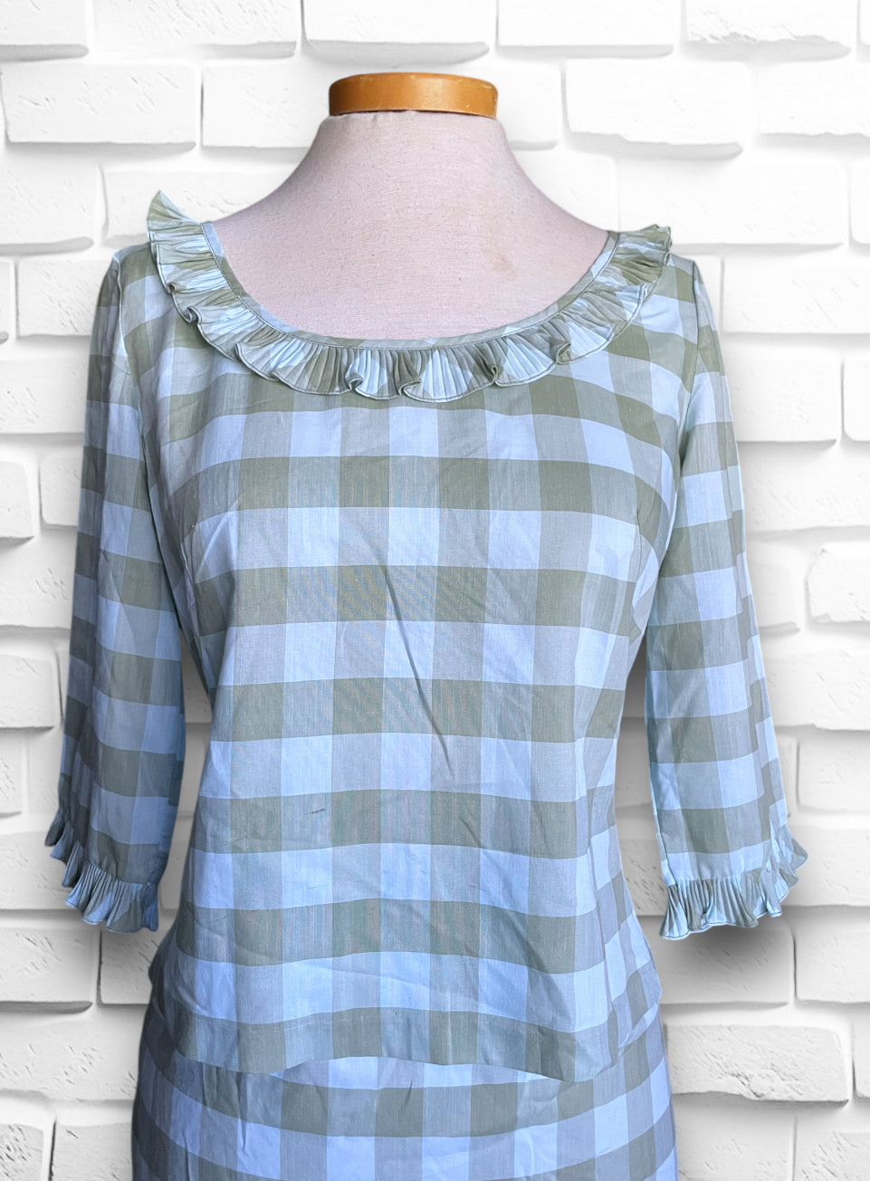 Adorable vintage 1960’s baby blue & green plaid pencil skirt & ruffle 3/4 sleeve shirt set. Shirt has ruffles around the scoop neck and 3/4 sleeves as well as buttons all the way up the back. Skirt is mimi pencil style. In perfect condition! Label reads “Koret of California”