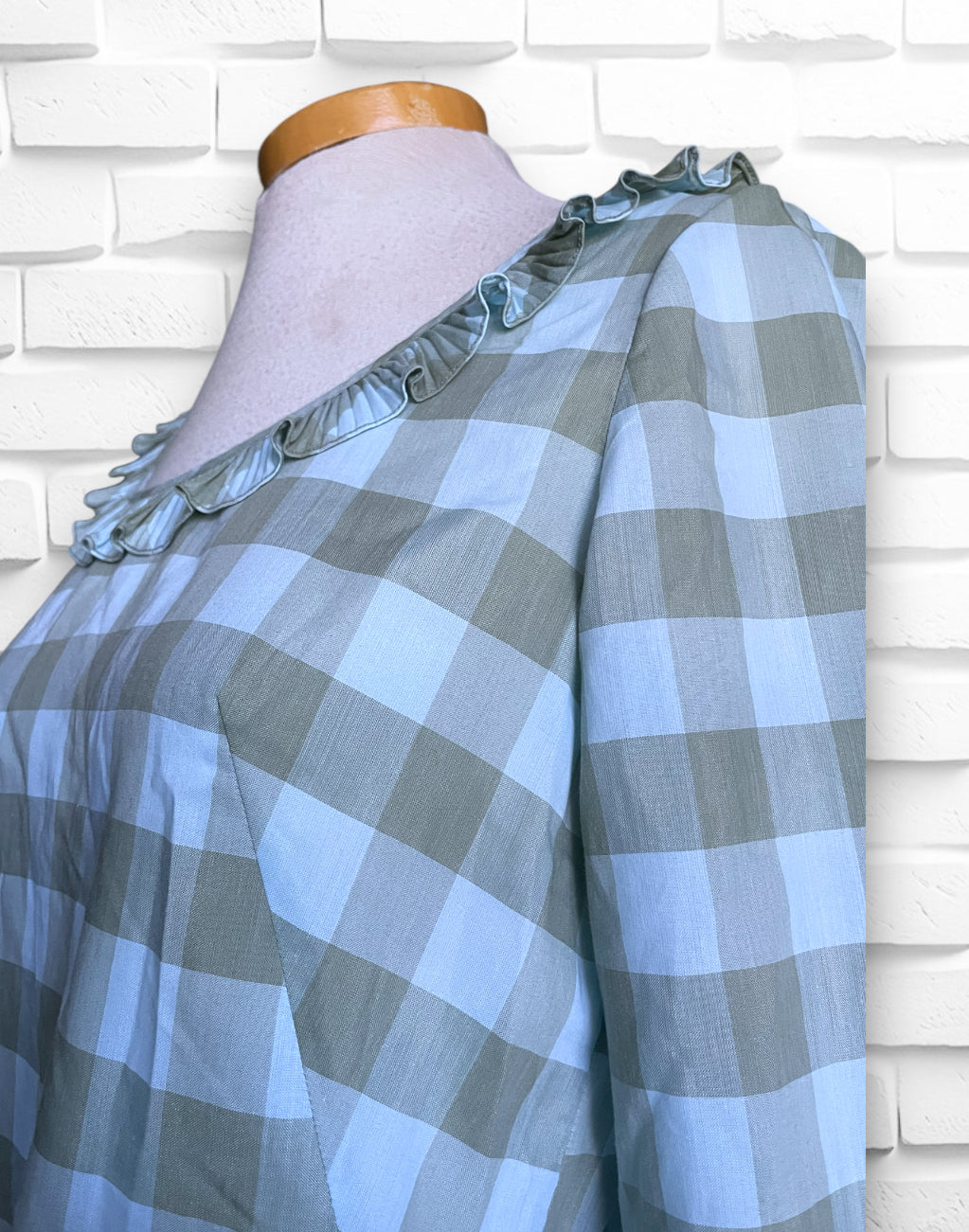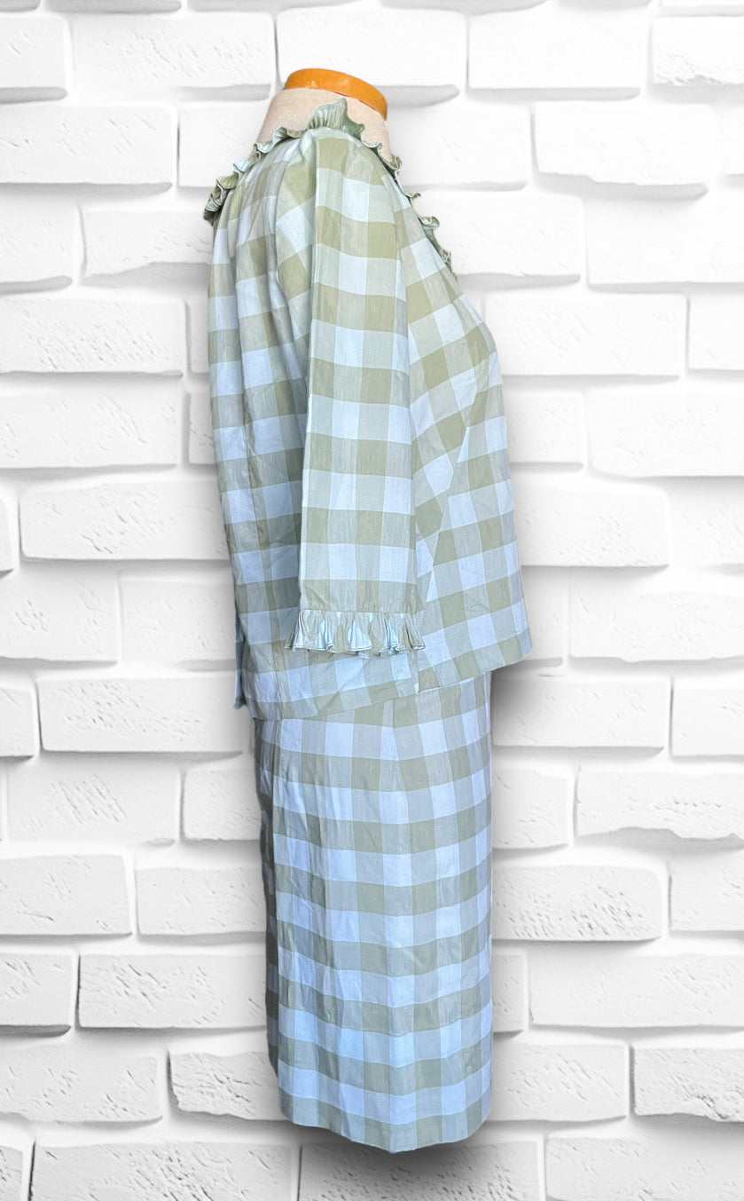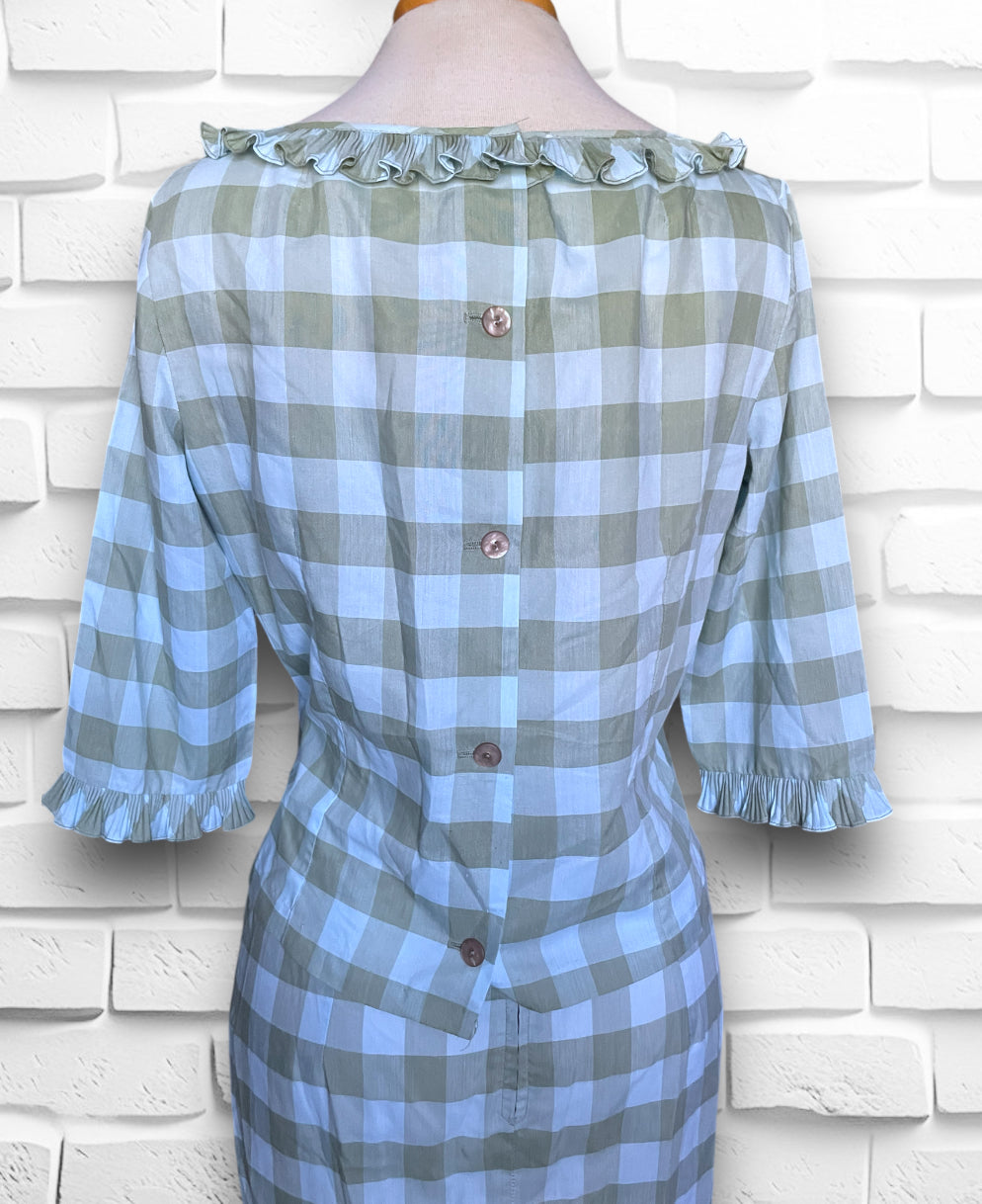 Adorable vintage 1960’s baby blue & green plaid pencil skirt & ruffle 3/4 sleeve shirt set. Shirt has ruffles around the scoop neck and 3/4 sleeves as well as buttons all the way up the back. Skirt is mimi pencil style. In perfect condition! Label reads “Koret of California”