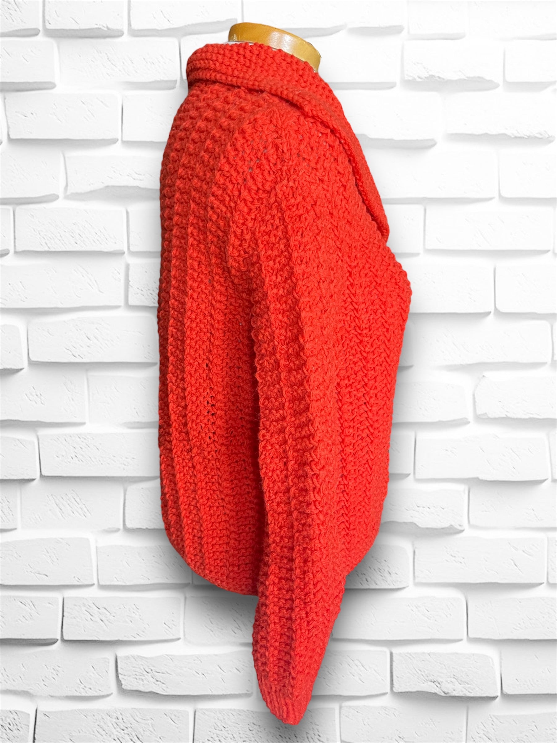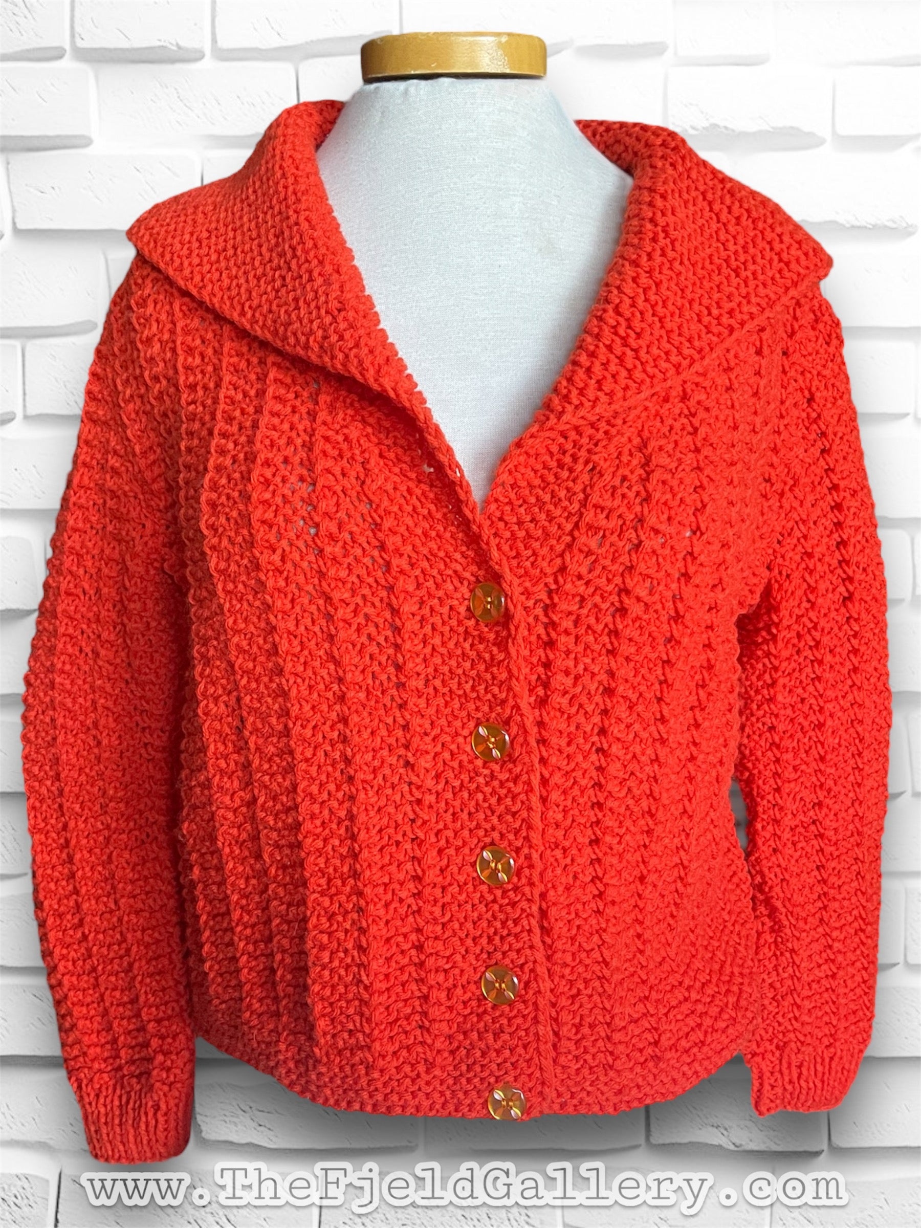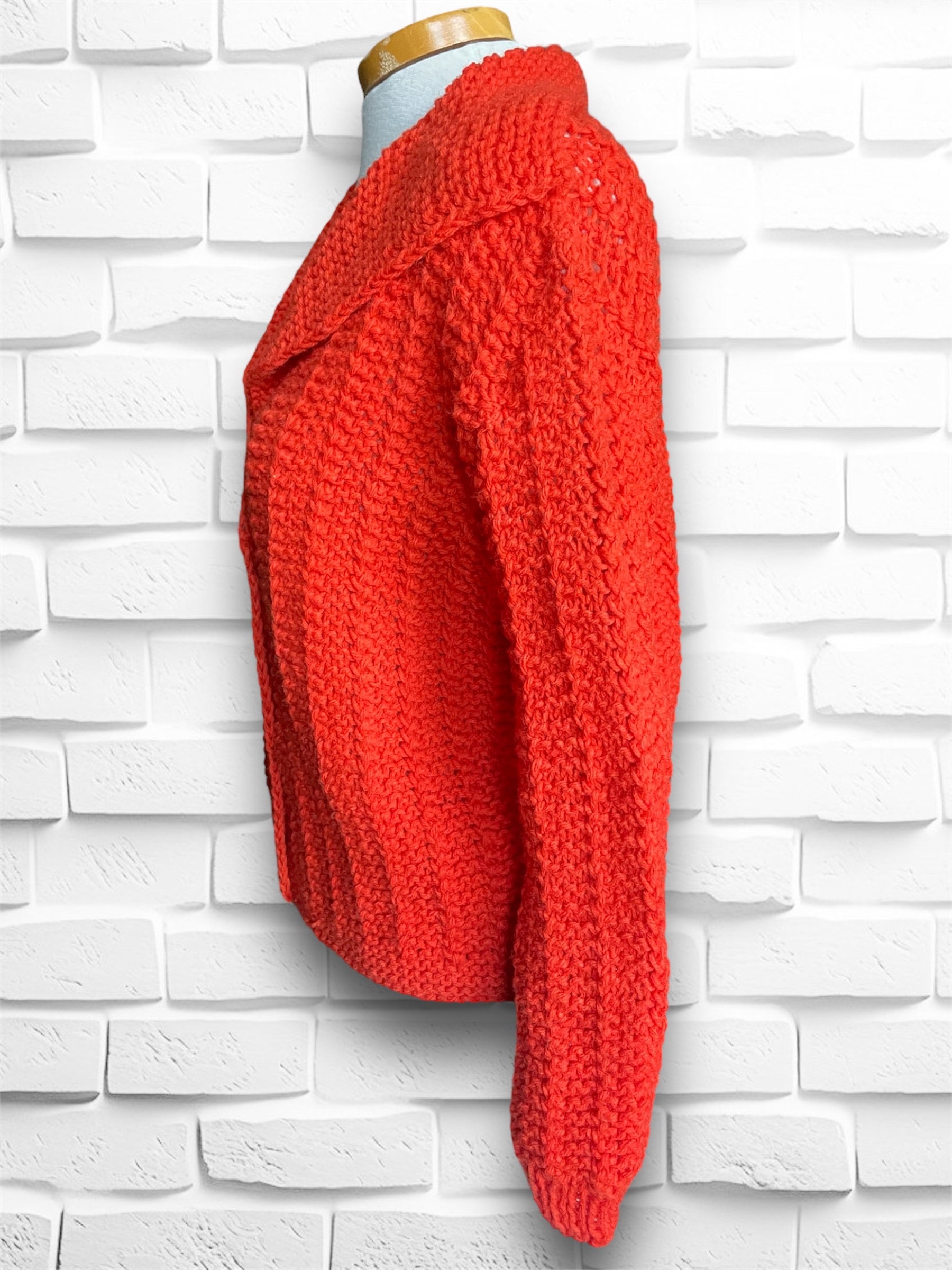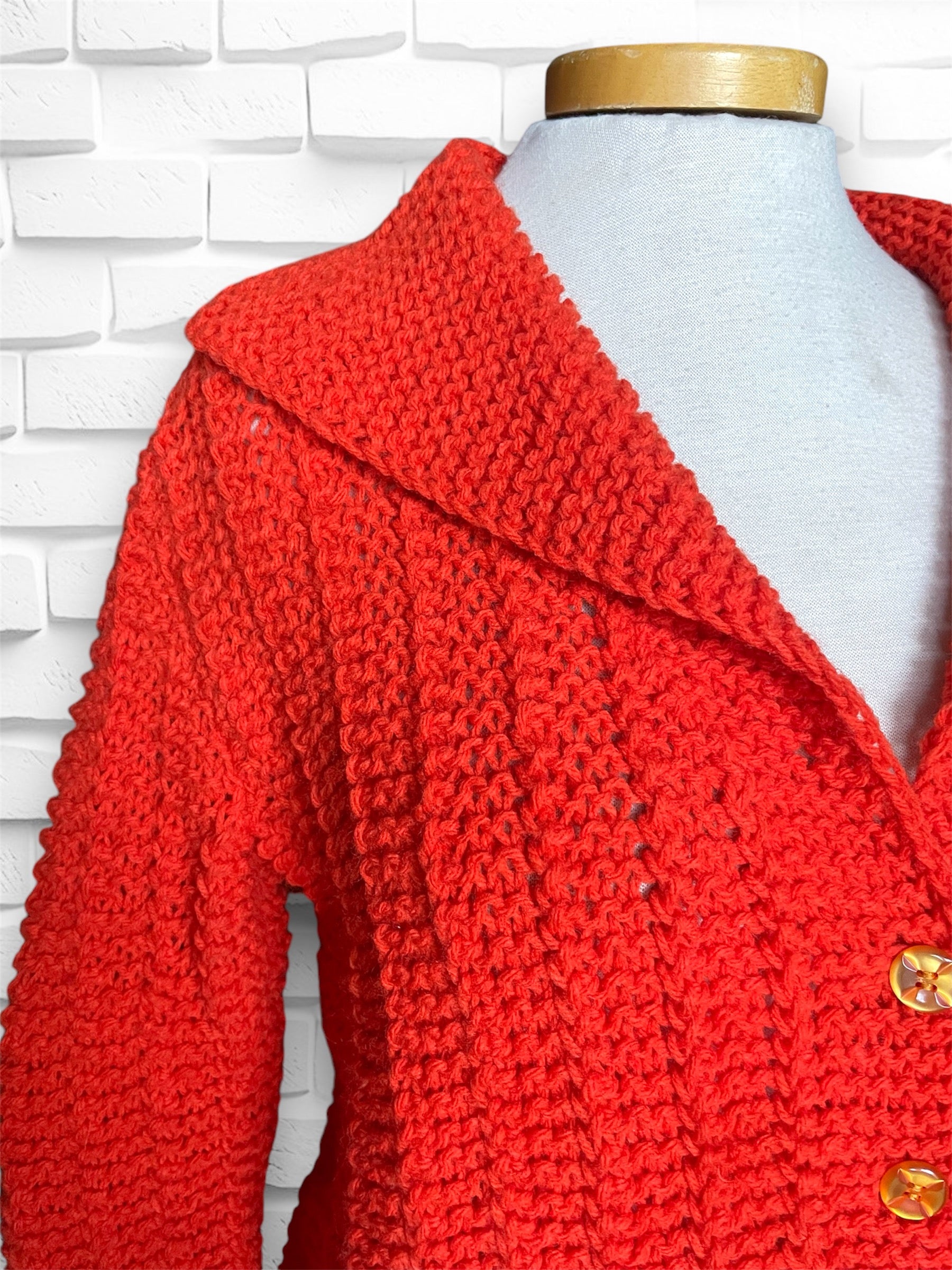 Vintage 1960’s bright orange knit sweater with wide collar and shiny opalescent orange buttons. No damage or condition issues. No tags or labels.