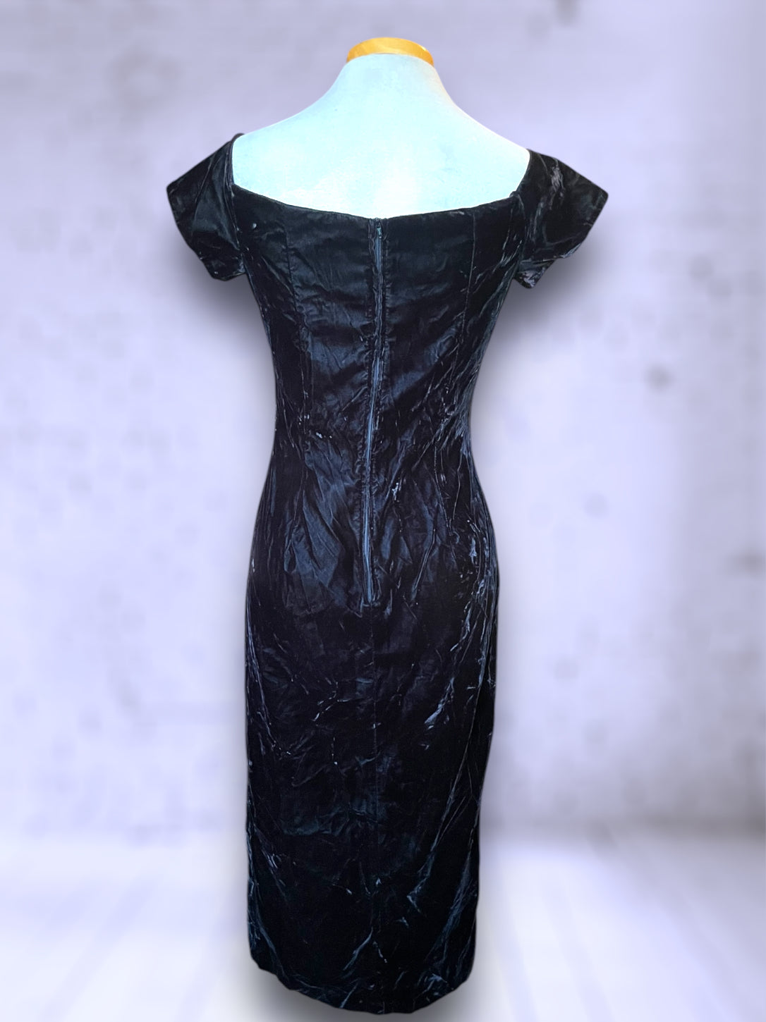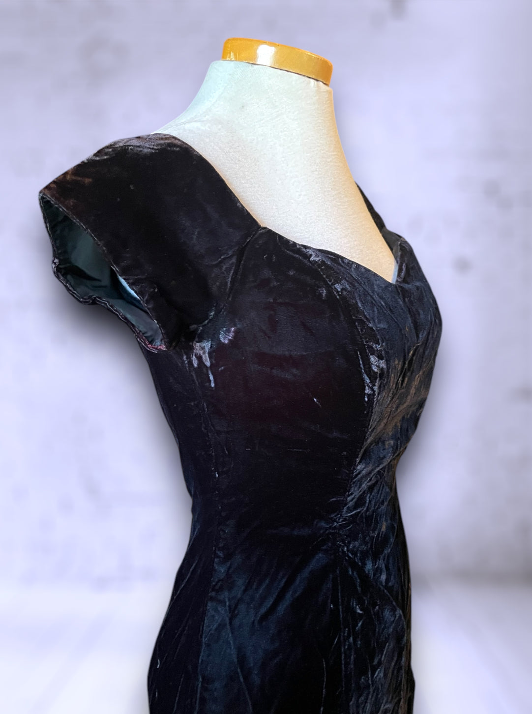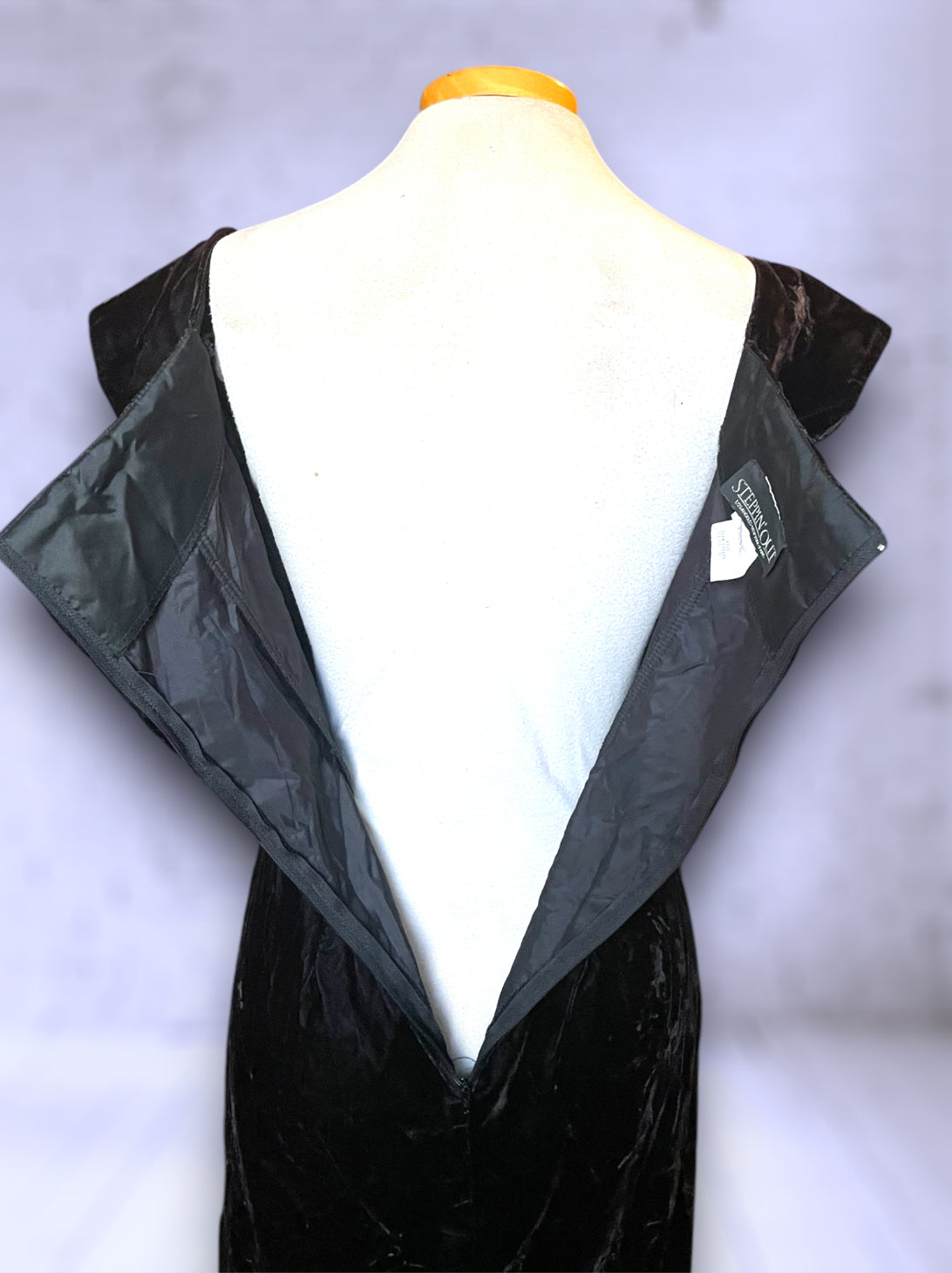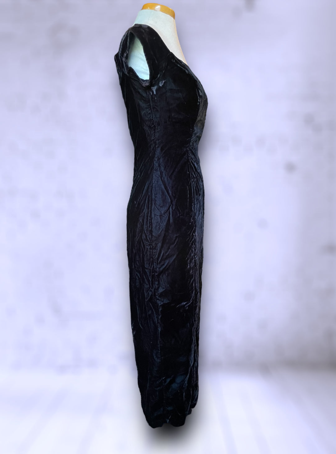Gorgeous vintage 1980’s black crush velvet long dress. Off the shoulder with black stretchy hidden straps and a super high slit on the left side. Hidden zipper closure on the back. Label is Stepping’ Out /Los Angeles. New York. Paris / size 9 / Made in the USA. No damage or condition issues.