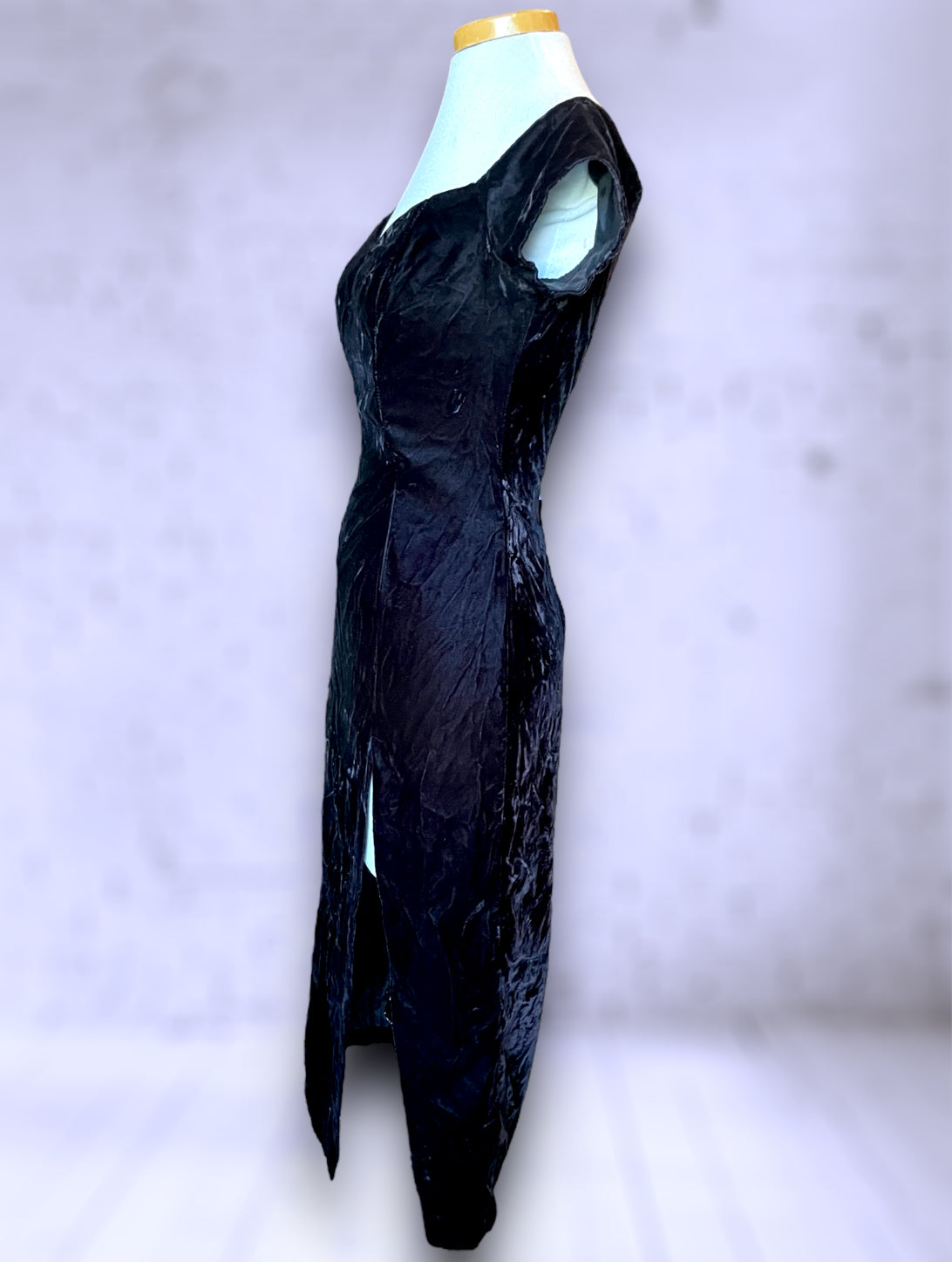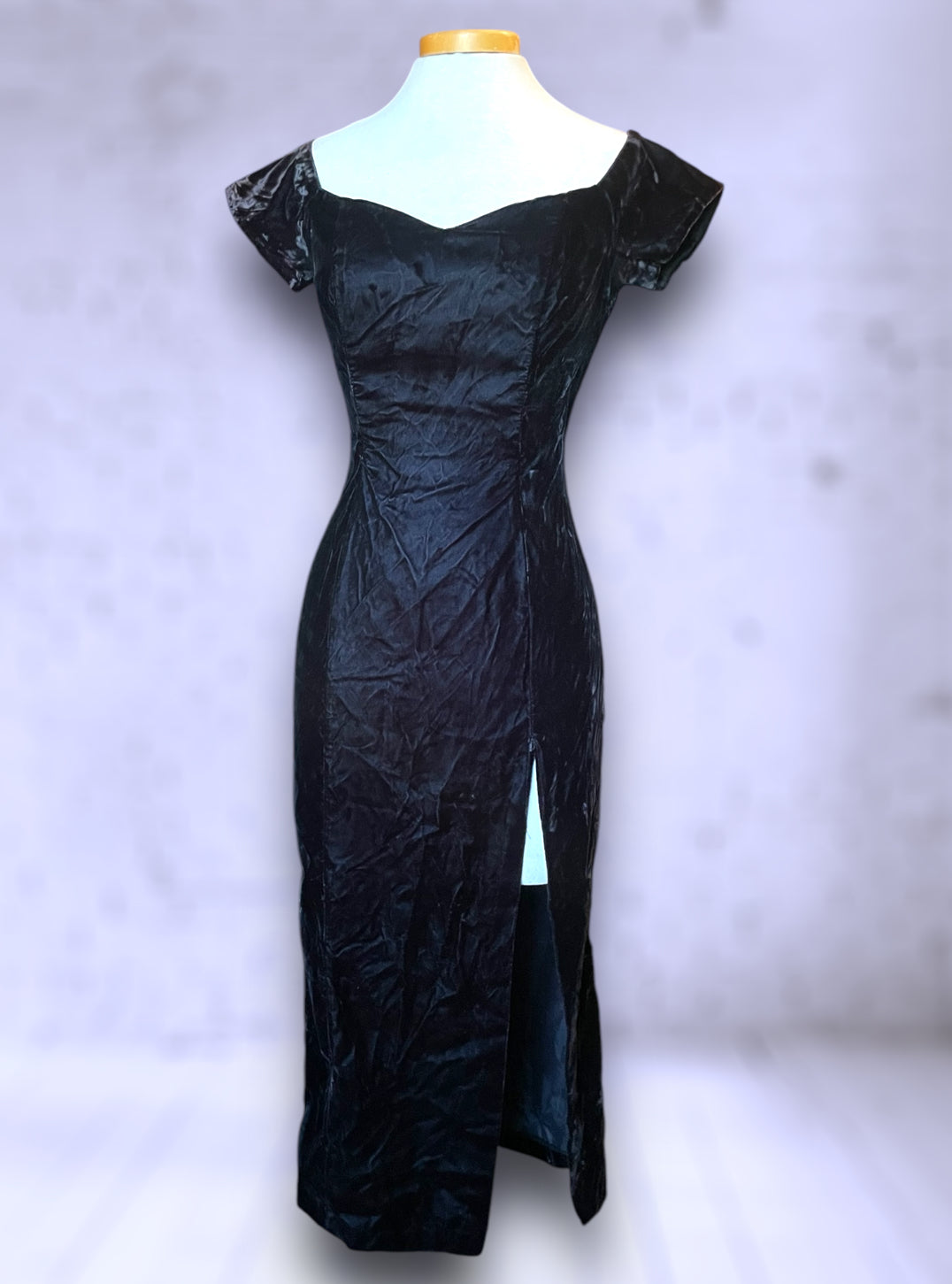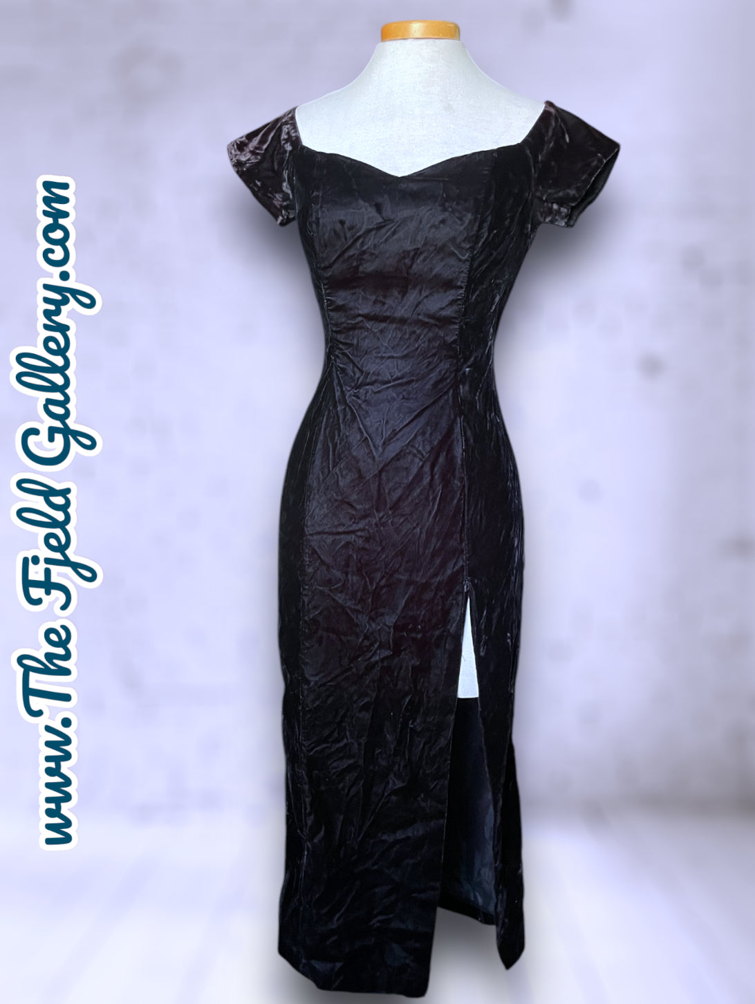 Vintage 1980’s Black Crush Velvet Off the Shoulder High Slit Dress