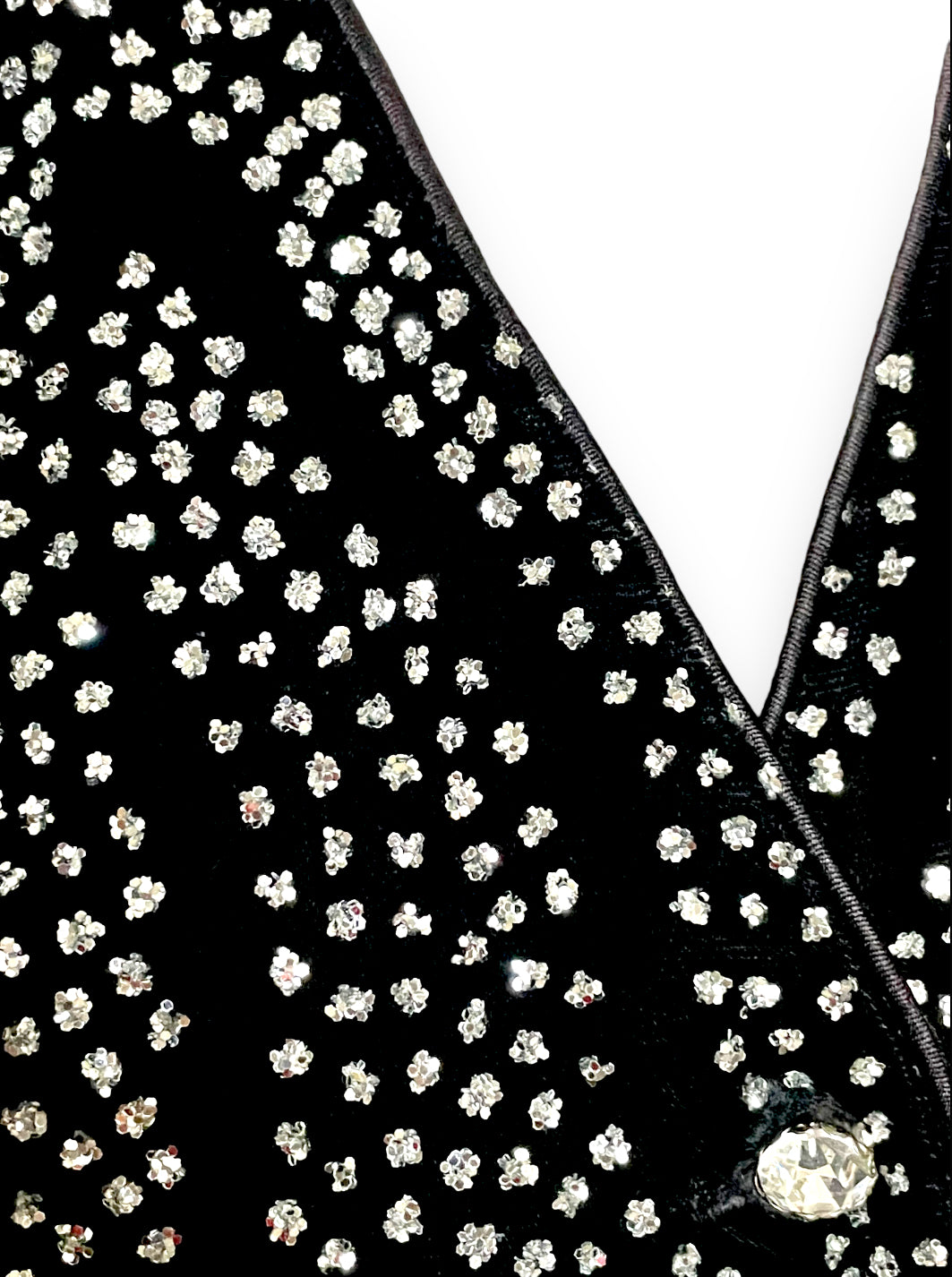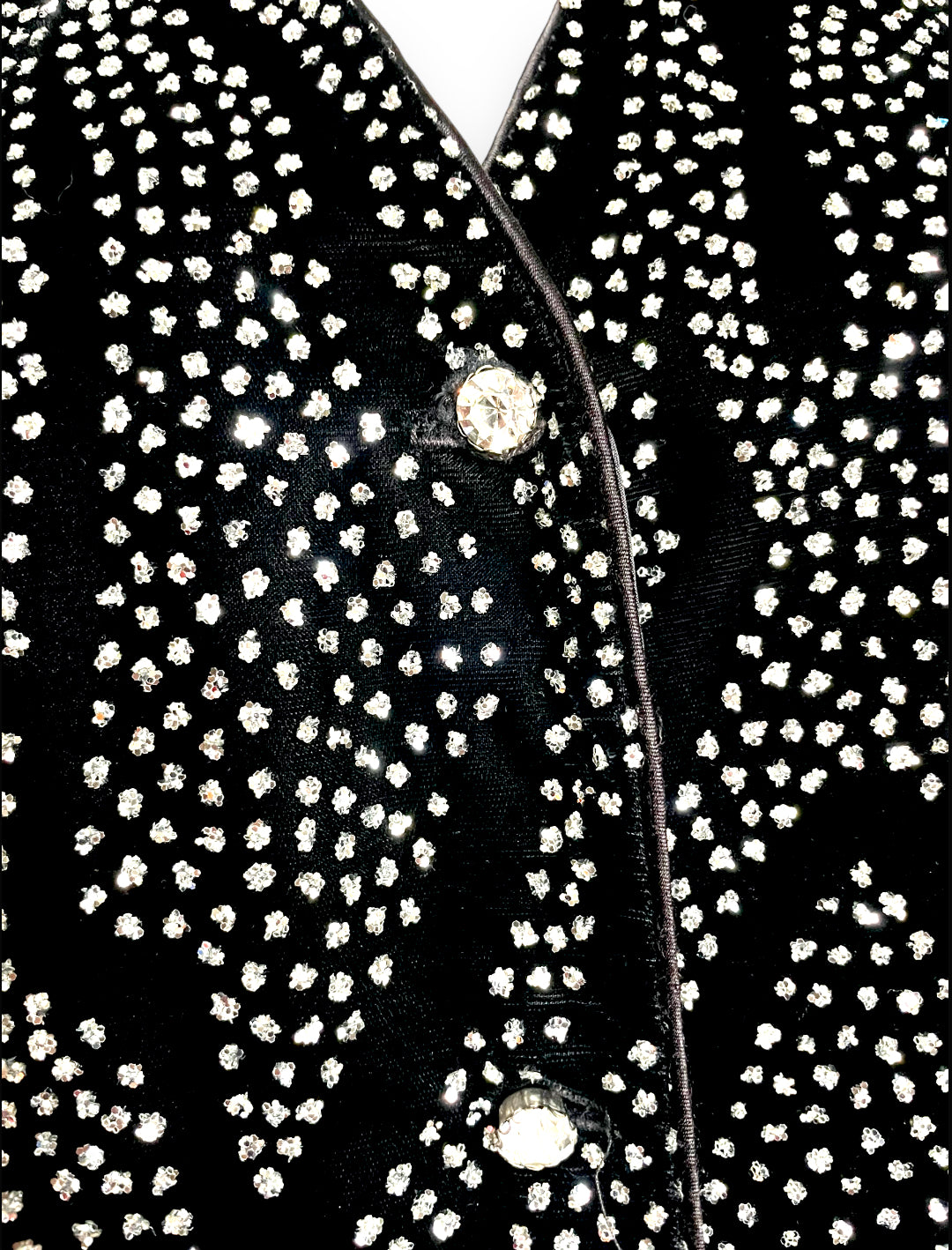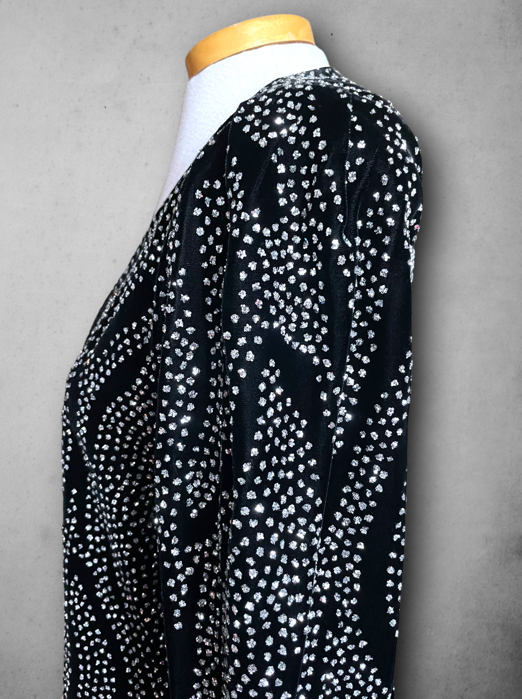Beautiful 1980’s vintage outerwear. Black velvet with dots of silver glitter forming a unique pattern. 4 crystal buttons up the front with a V-neckline. Shoulder pads inside giving a strong shoulder. Bottom hemline mimics V neck. Black piping along all edges including wrists and neckline as well as hemline. Tag reads Riki Lang for NUIT. Size 12.