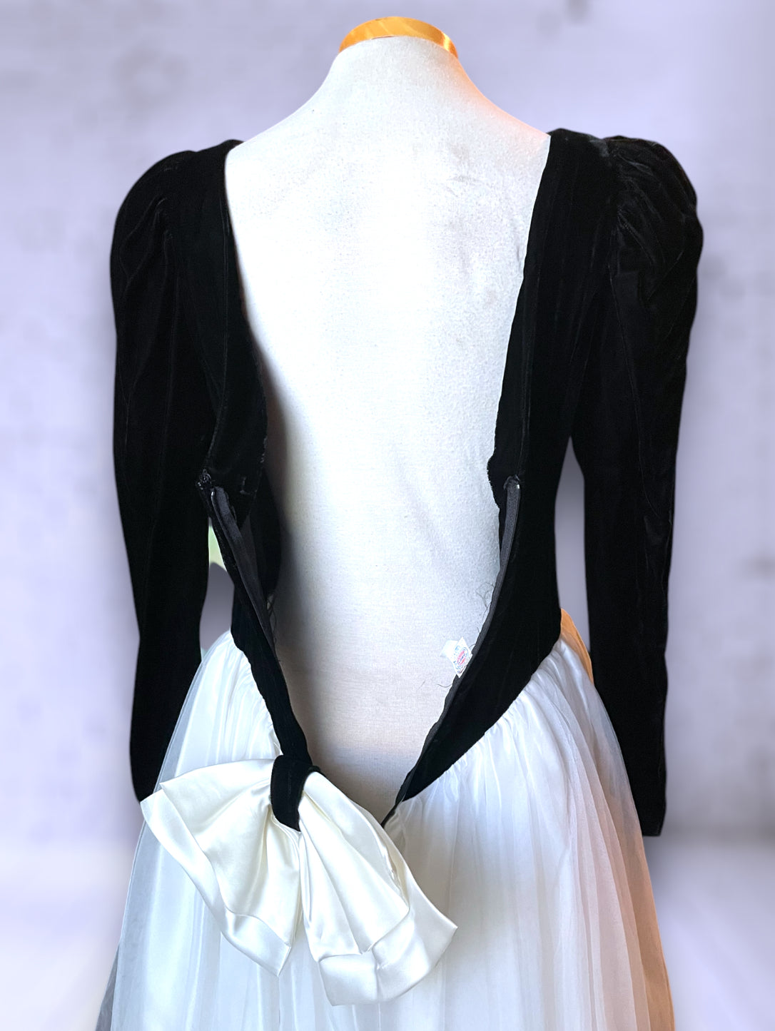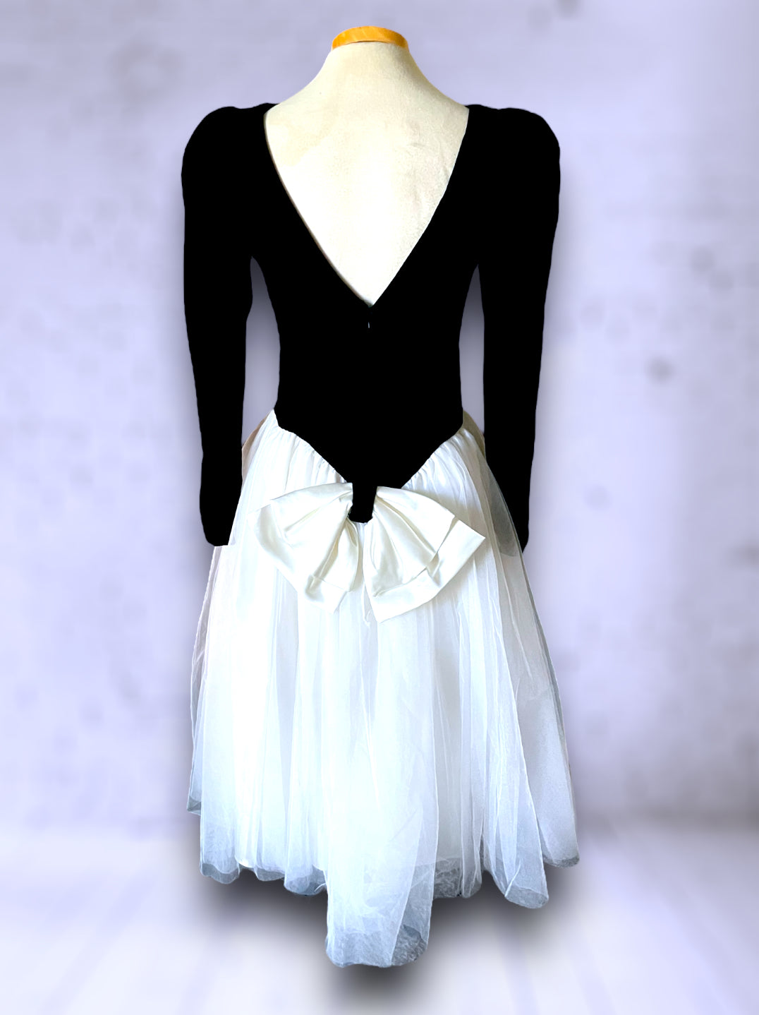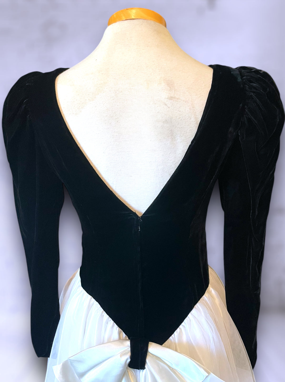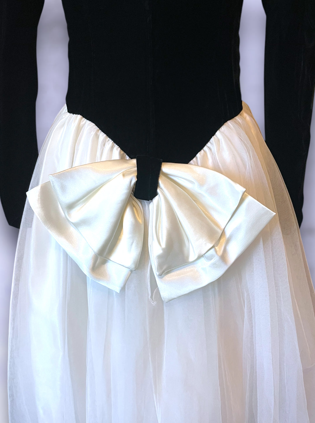 Vintage 1980’s Black Velvet & White Fluffy Bow Skirt Formal Long Sleeve Dress