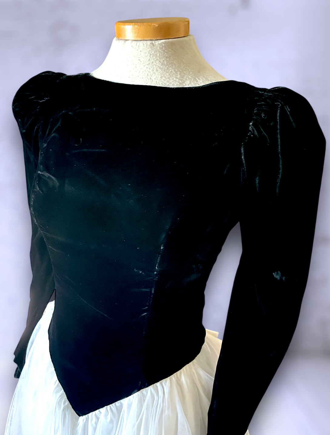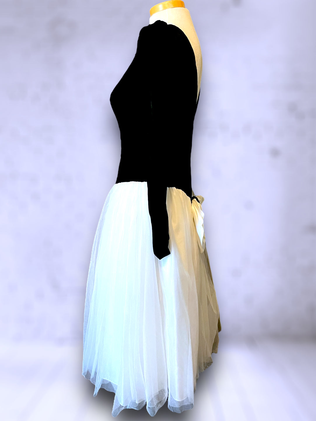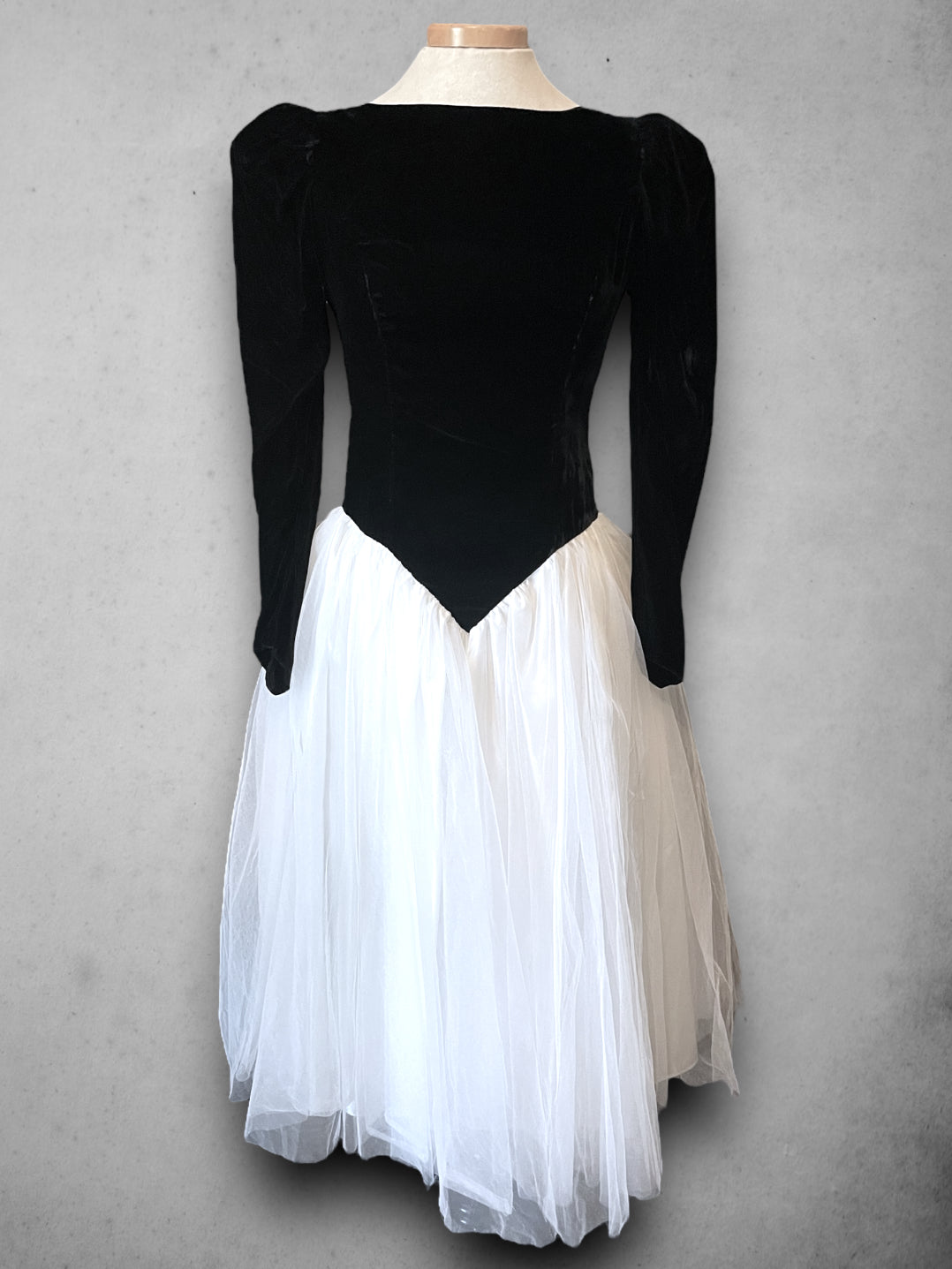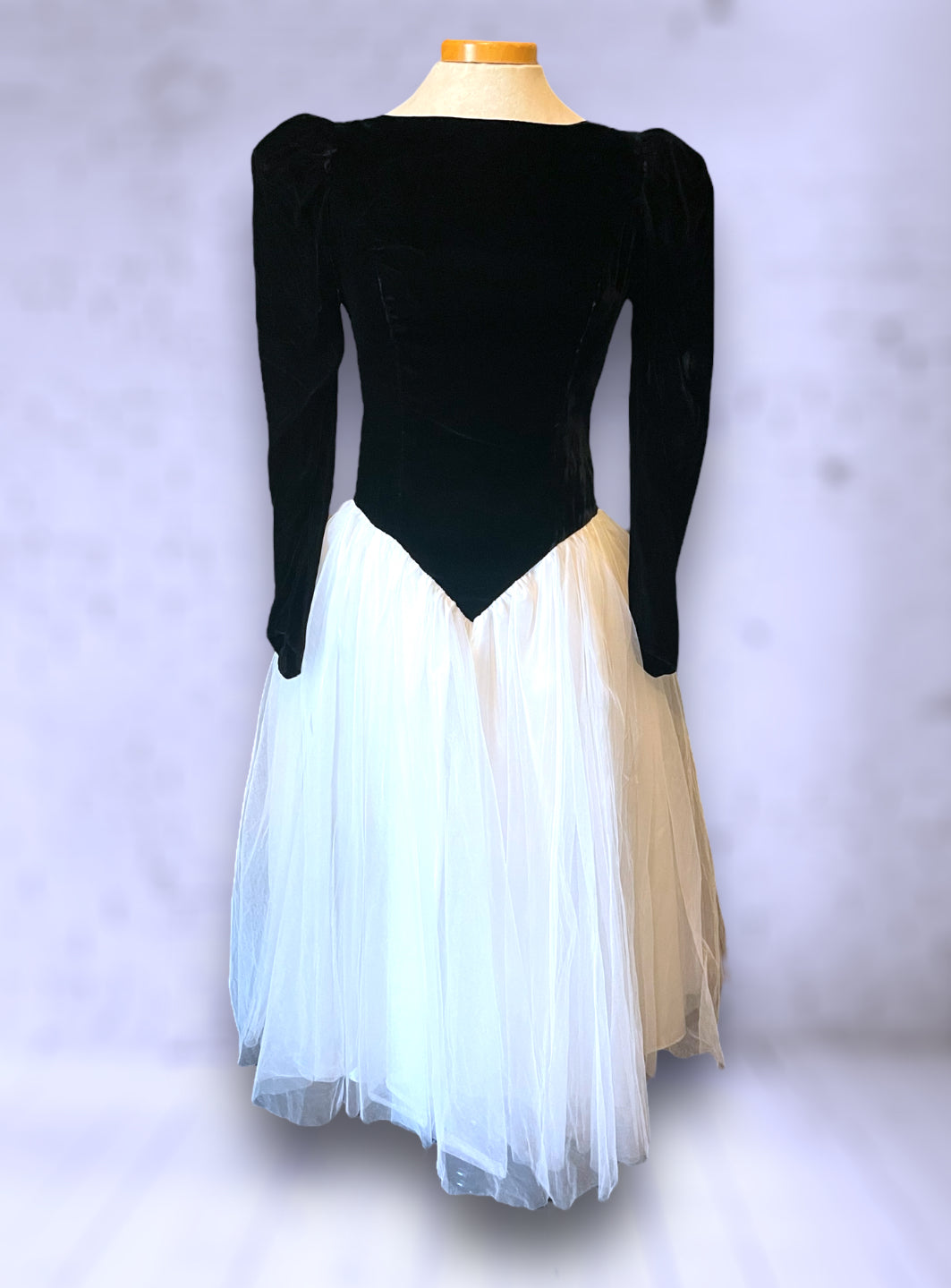 Vintage 1980’s Black Velvet & White Fluffy Bow Skirt Formal Long Sleeve Dress