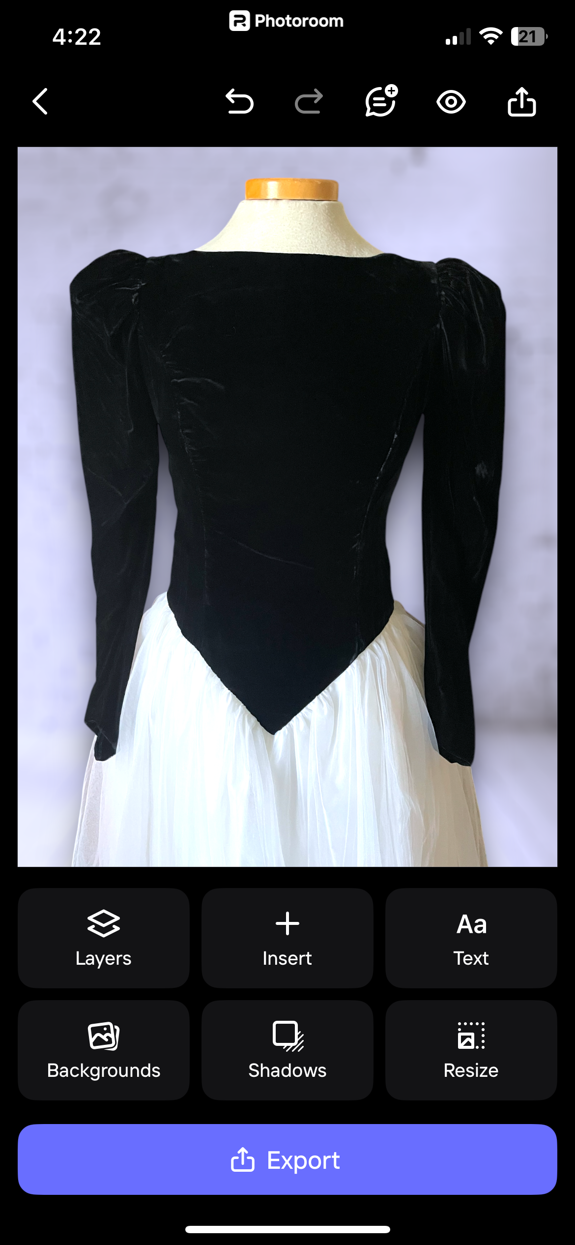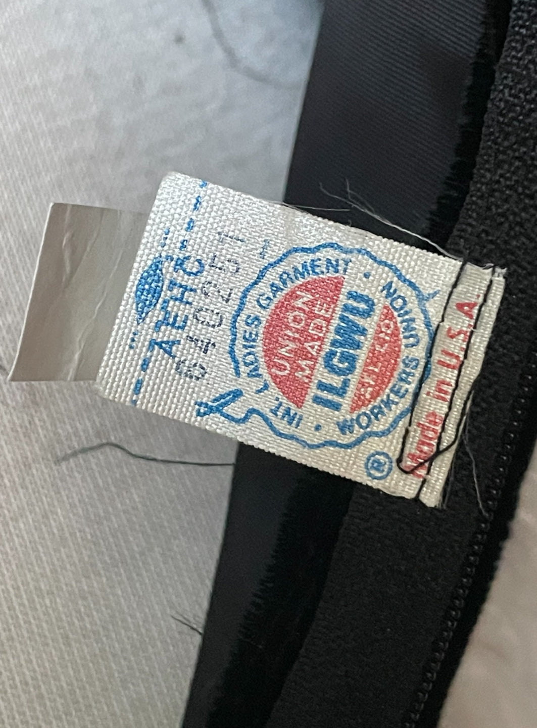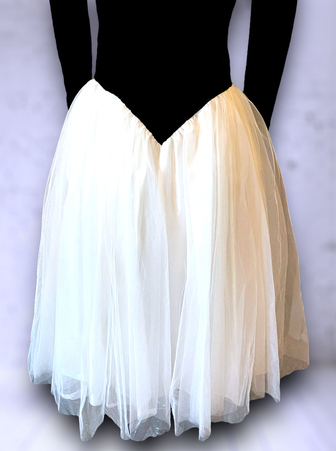Beautiful vintage 1980’s black and white formal dress.  Bodice is black velvet and long sleeved with a tight wrist that snaps shut to be tight on wrist and a V cut drop waist.  Skirt is a white, see through fine tulle over white satin.  It’s multi layer, fluffy, flouncy, full skirt with a white satin bow at the center of the back just below the hidden zipper and hook and eye closure.   Low cut V back, and high front neckline.  Shoulders have a ruffled pleat and a stiff tulle underneath to give the shoulder a little poof.  No designer label found but there is a ILGWU union made tag and a dry clean only/Made in the USA tag. No stains or damage or condition issues at all.  Like new condition.