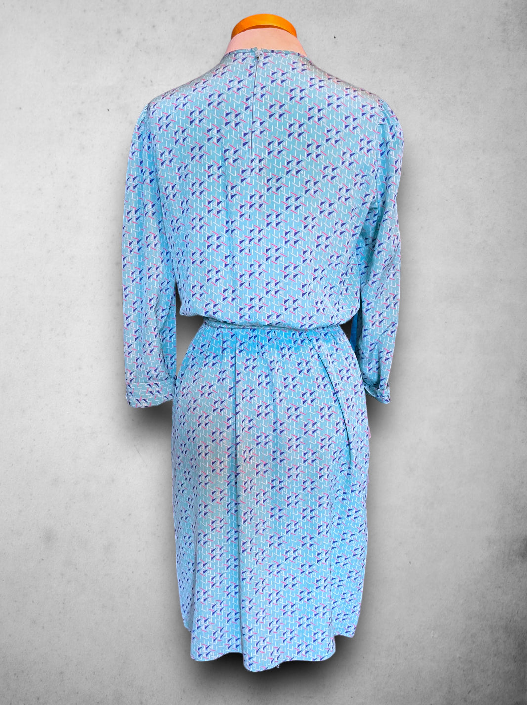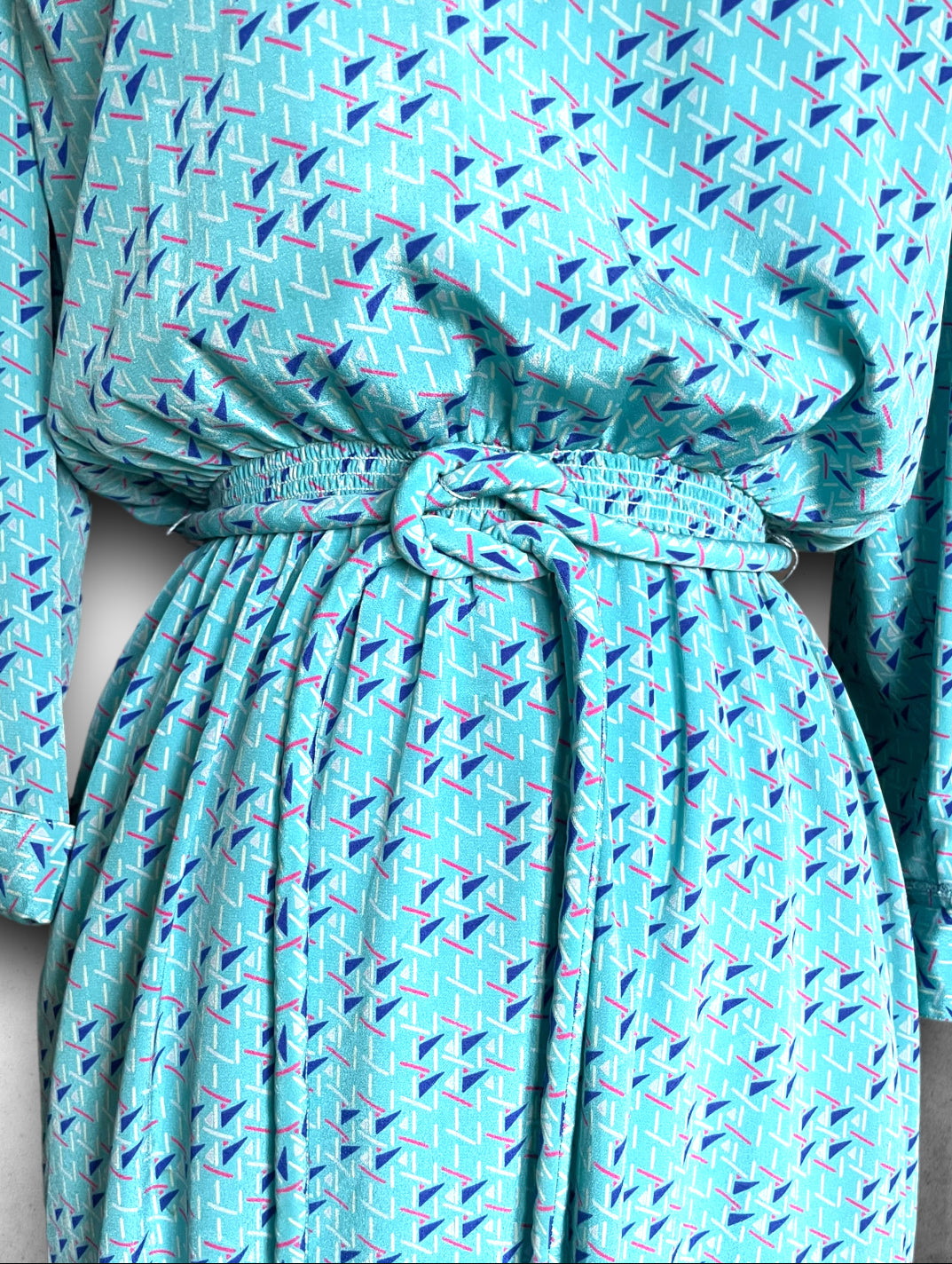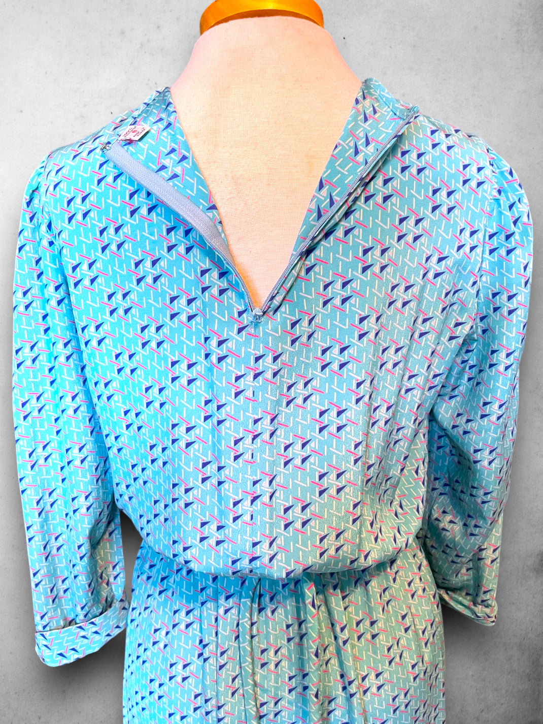 Vintage 1980’s Blue, Teal, Pink & White Abstract Pattern Dress