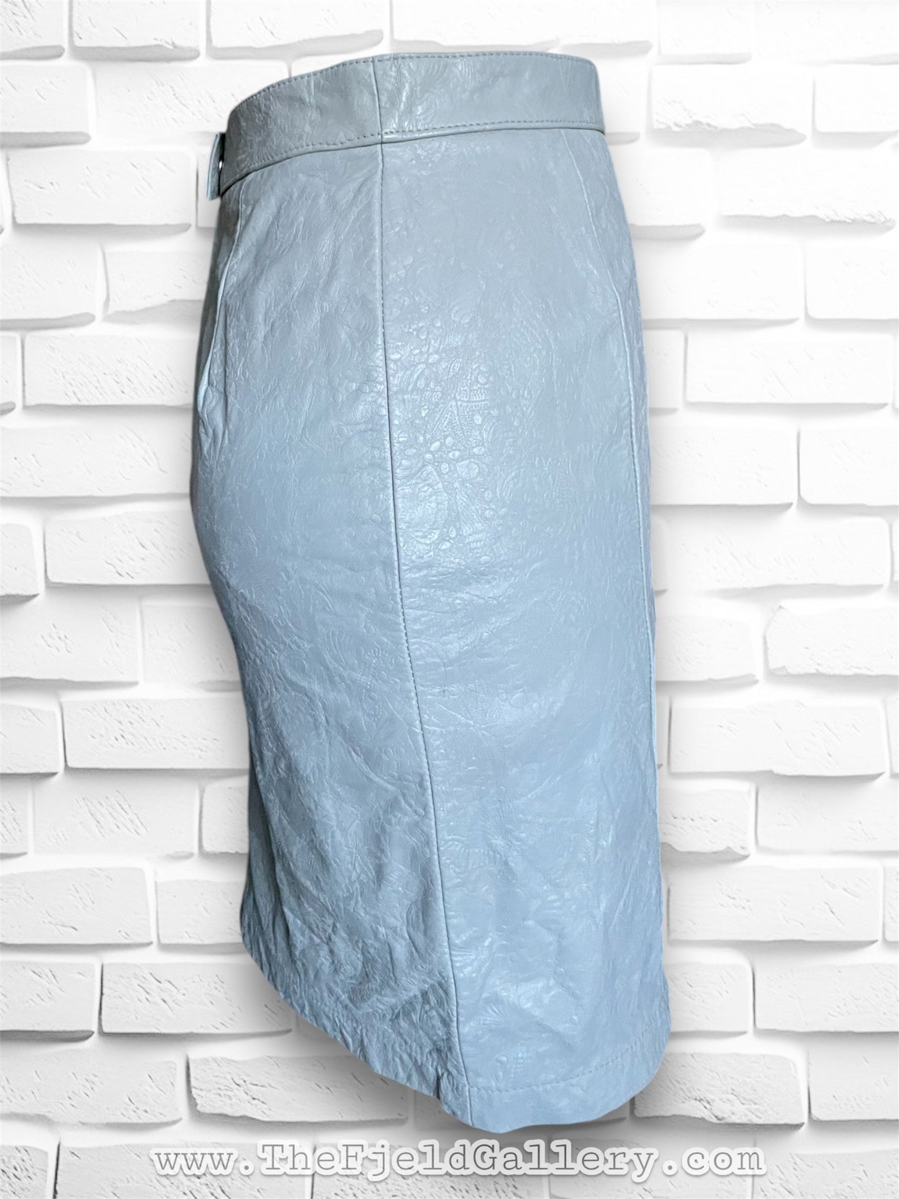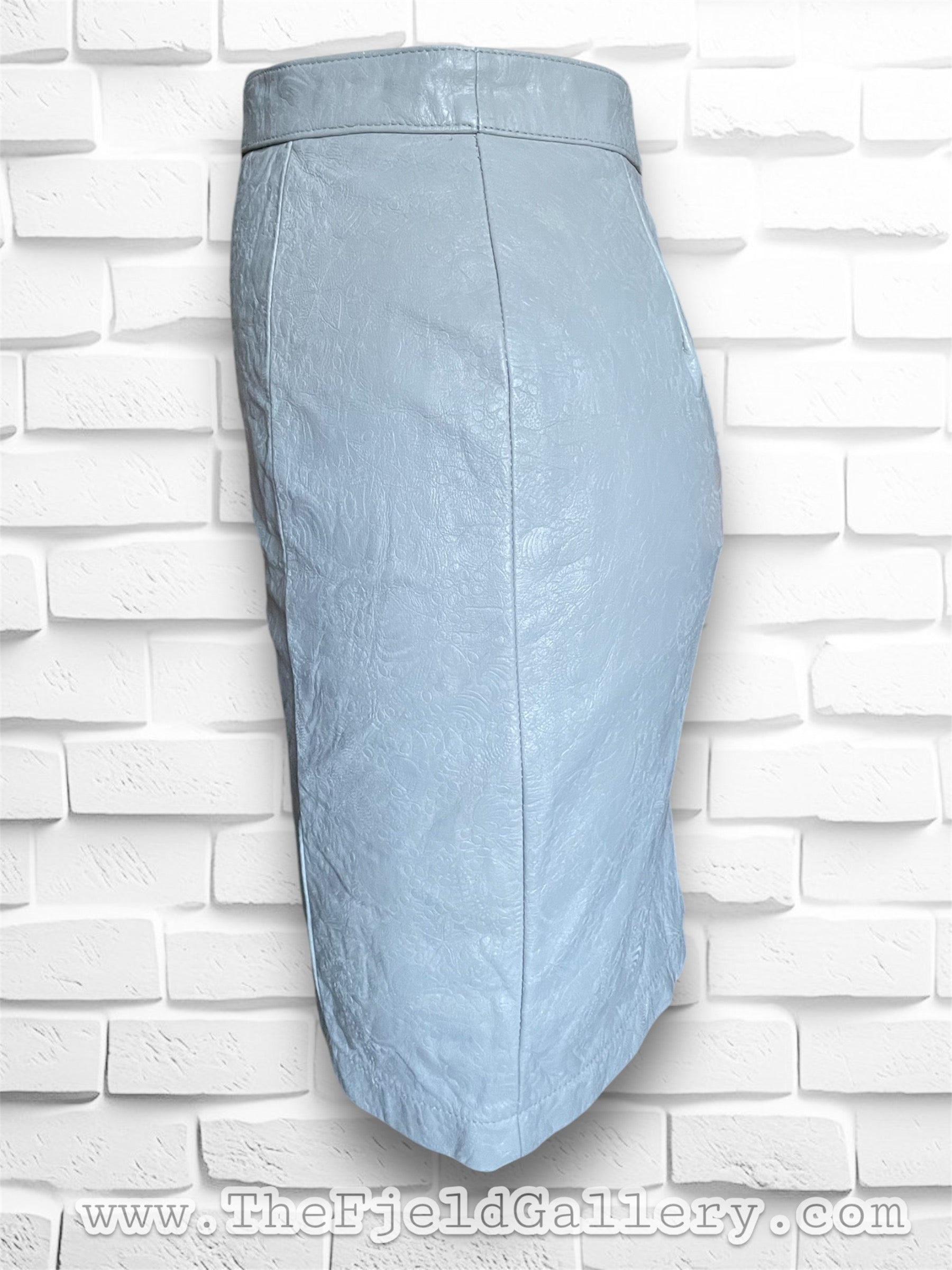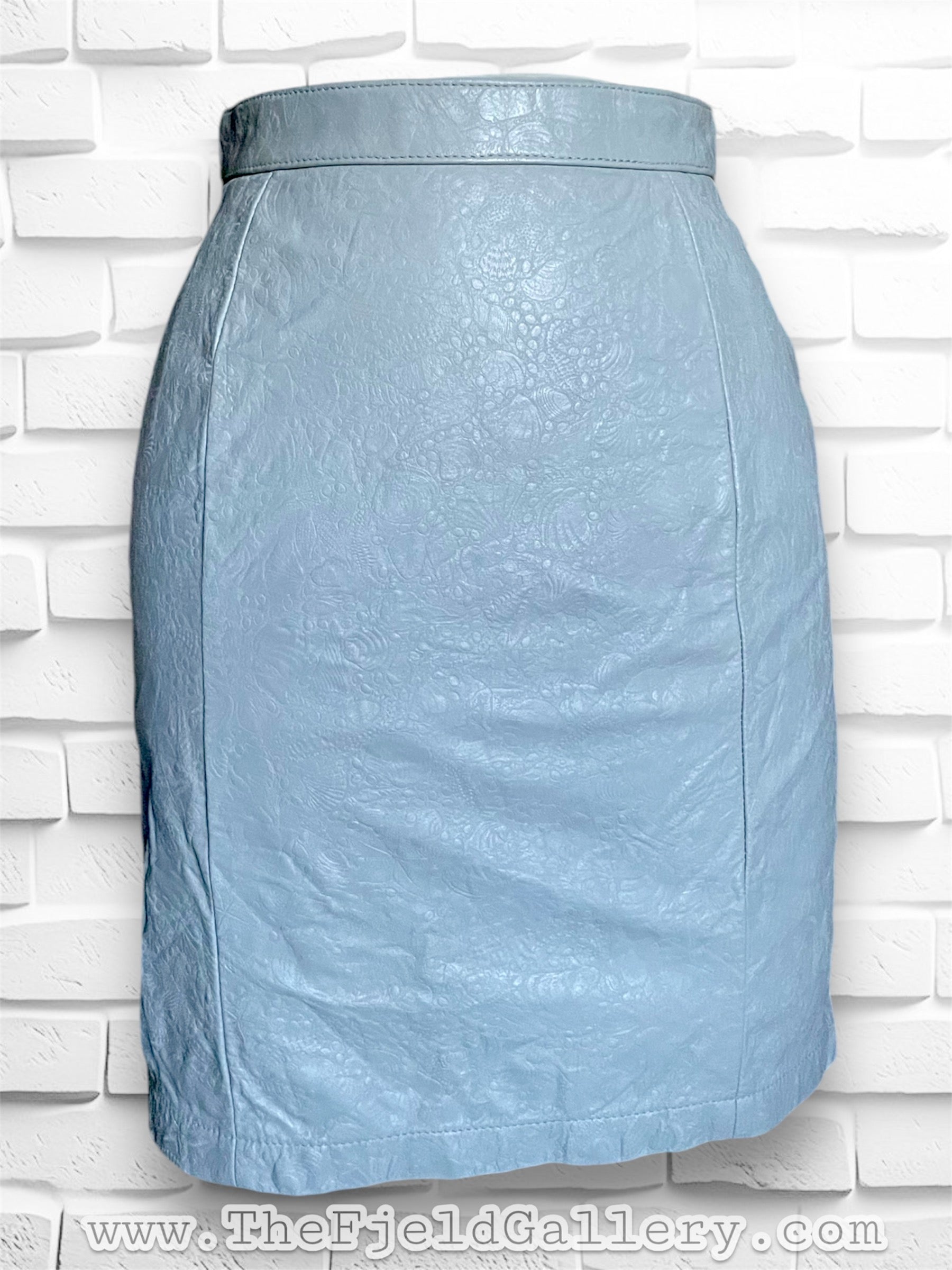 Gorgeous 1980’s Wilson’s Leather grey embossed leather mini pencil skirt. Leather is embossed with a twisty shell design. Tag reads: Wilson’s Suede & Leather / Size 8 / Shell 100% Leather / Lining: Nylon Taffeta