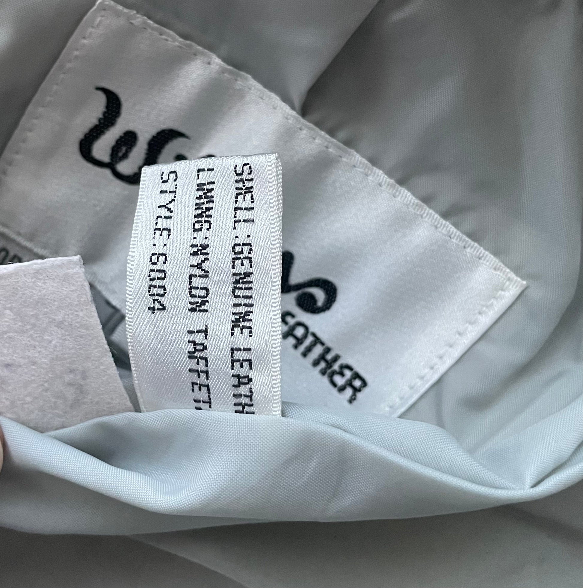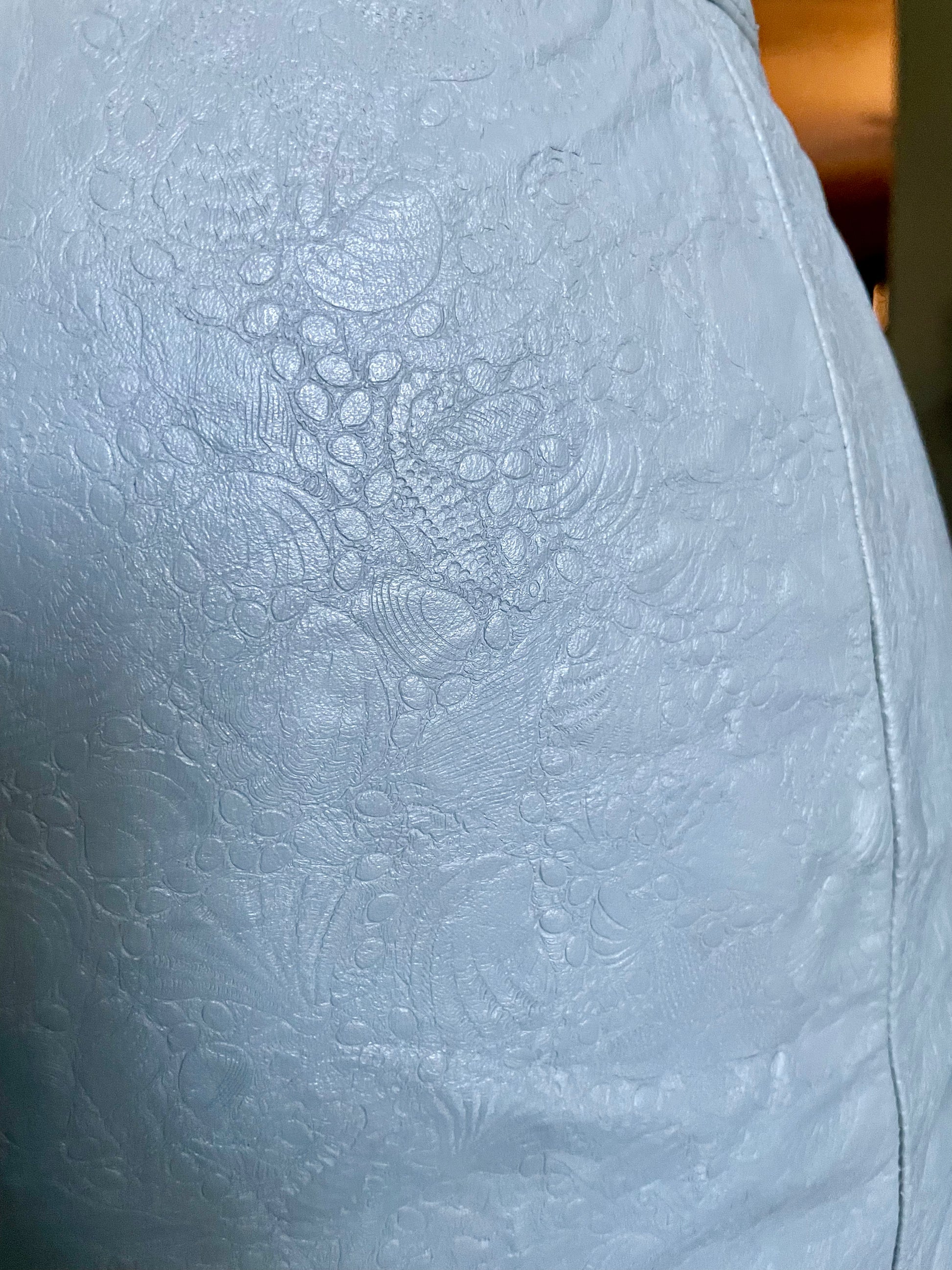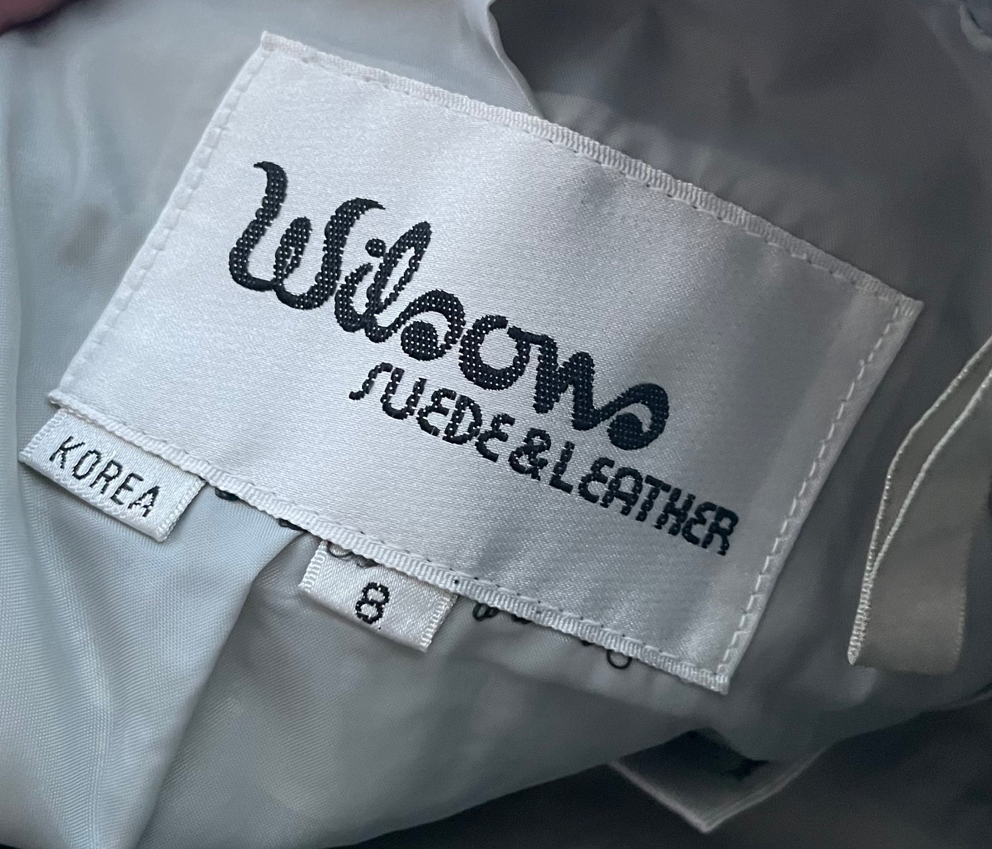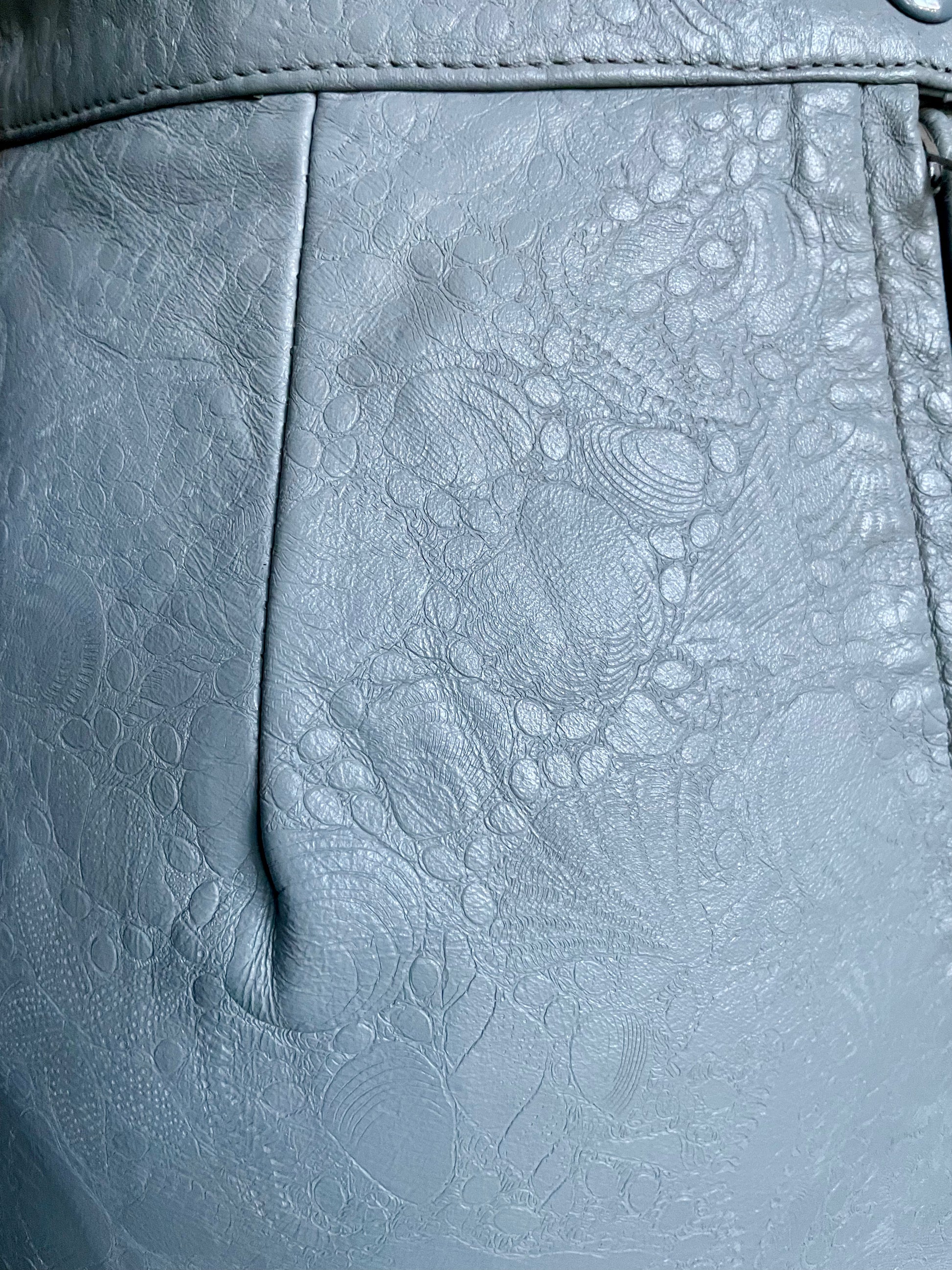 Gorgeous 1980’s Wilson’s Leather grey embossed leather mini pencil skirt. Leather is embossed with a twisty shell design. Tag reads: Wilson’s Suede & Leather / Size 8 / Shell 100% Leather / Lining: Nylon Taffeta