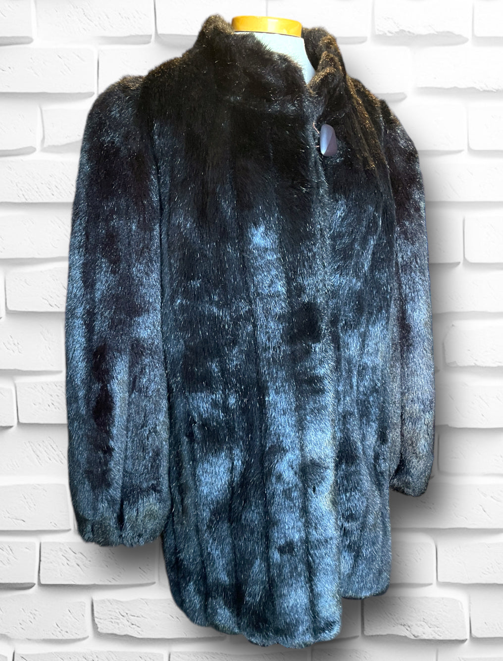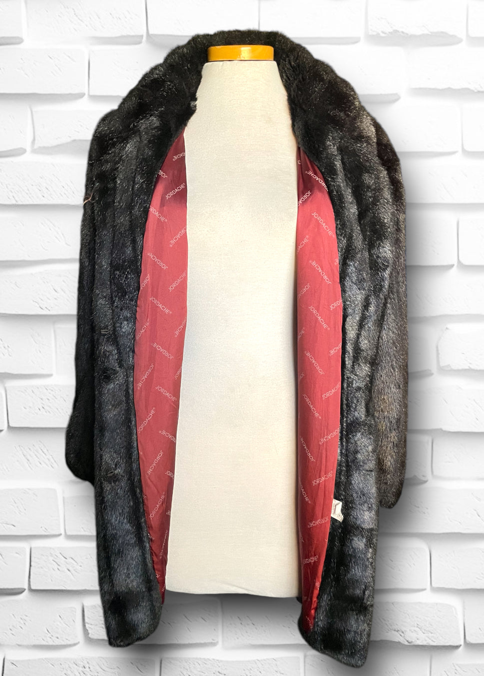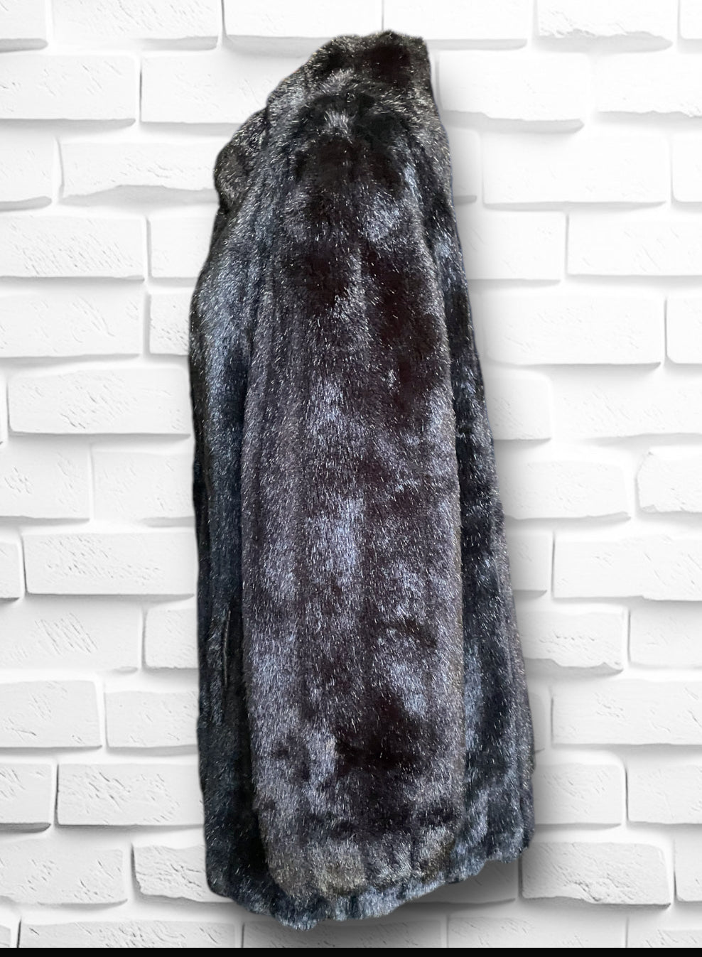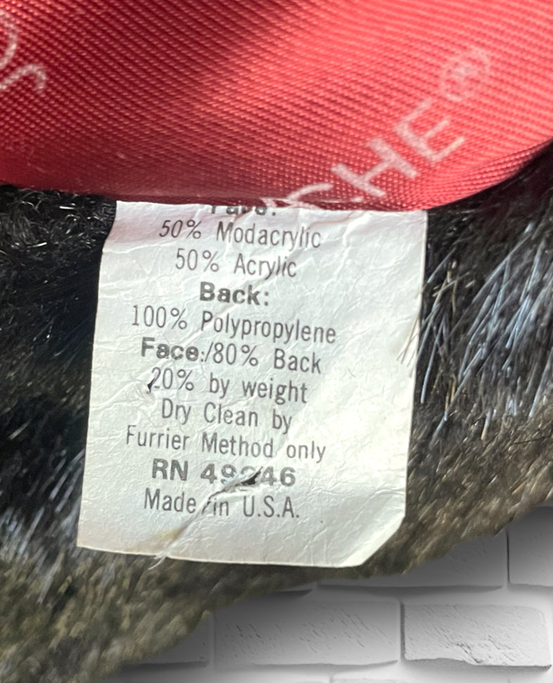 Amazing vintage 1980’s Jordache designer deep chocolate brown fuzzy faux fur 3/4 length overcoat jacket.  Has one large abstract polygon brown button at the neck and 3 crochet covered hook and eye closures. Vertical sewn “stripes” of the fur and two pockets on either side.  Inner lining is stamped Jordache repeating. Has a scalloped edge at the sleeve and hem.  Also has an inner tag stating “Made in USA” and 50% Modacrylic and 50% Acrylic. No damage or condition issues.