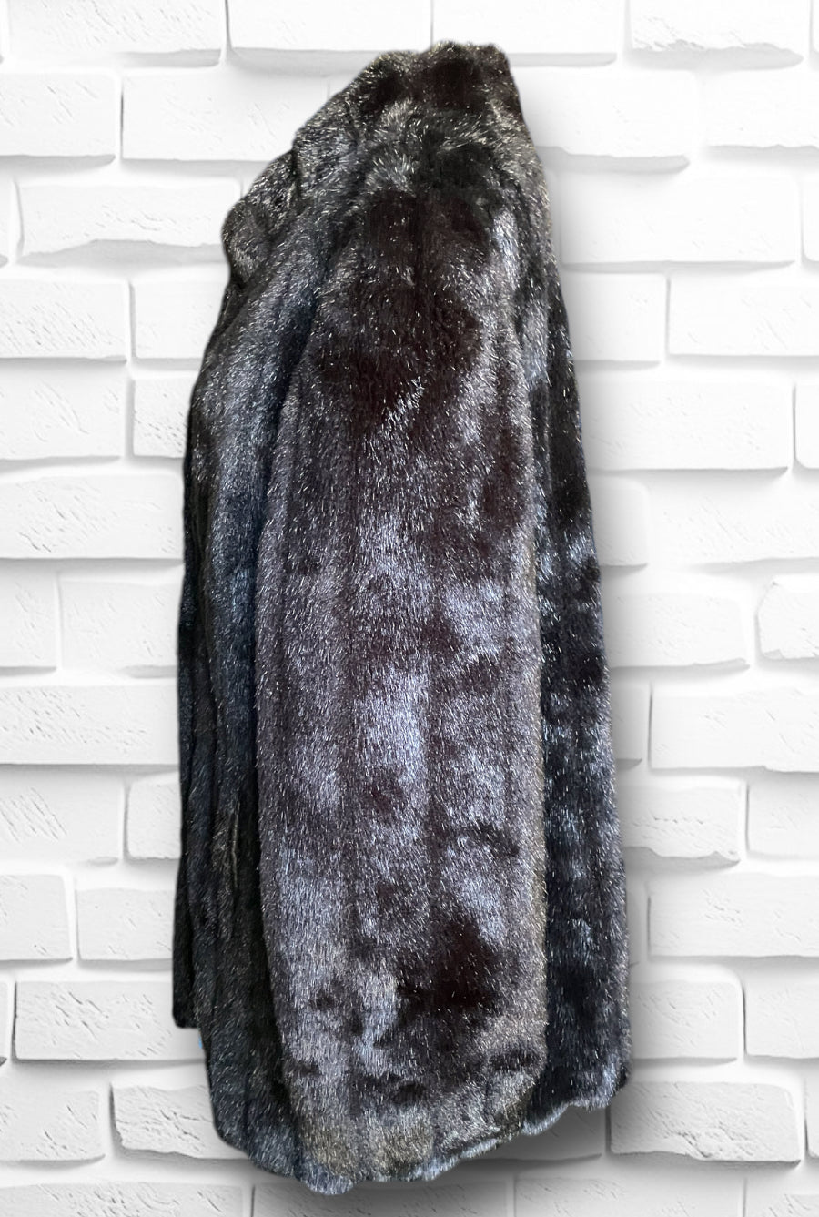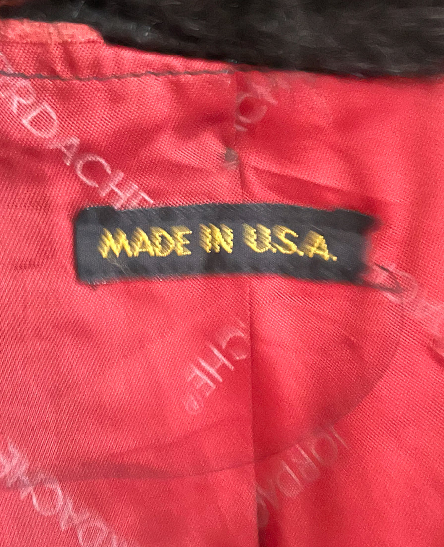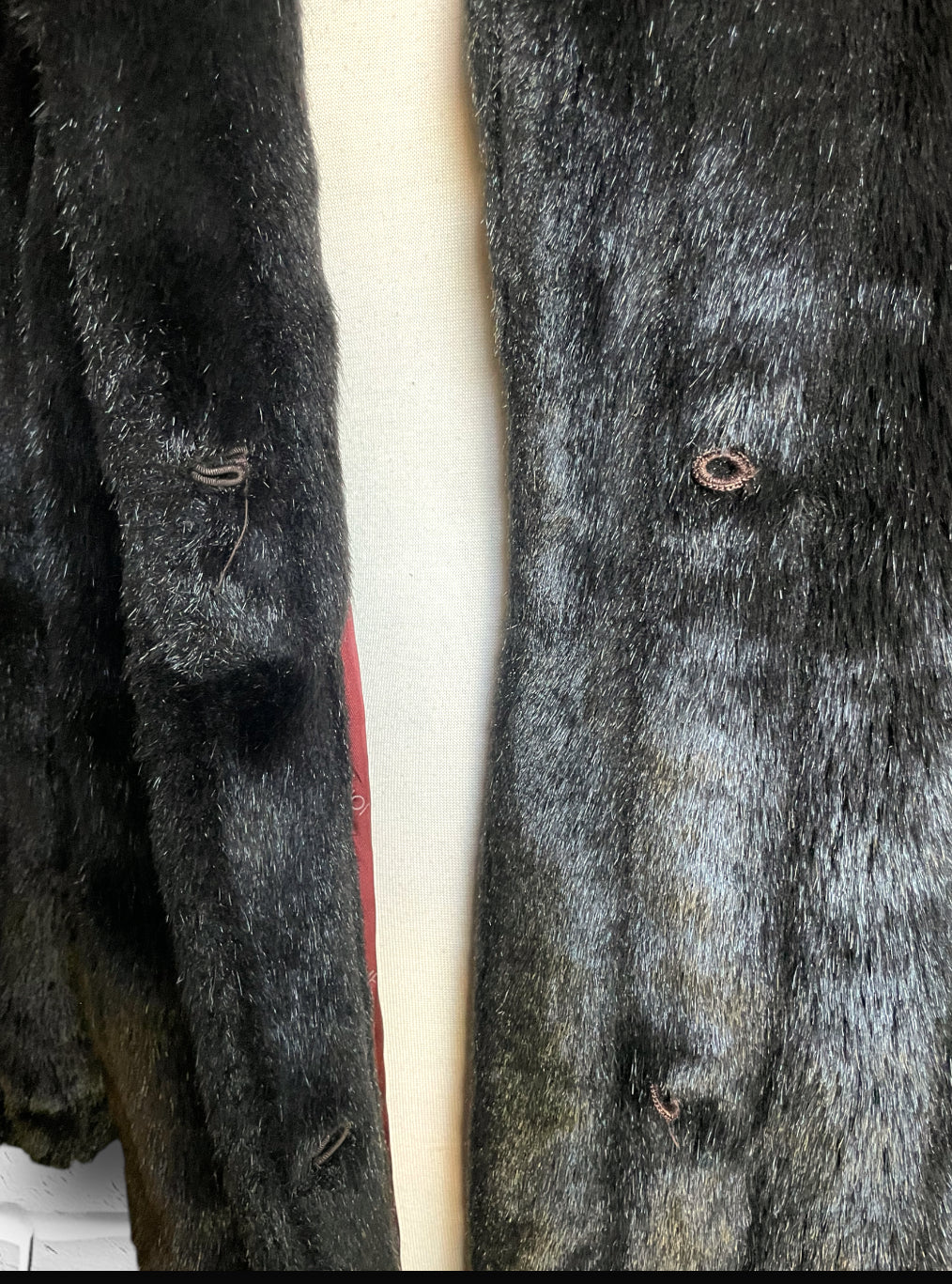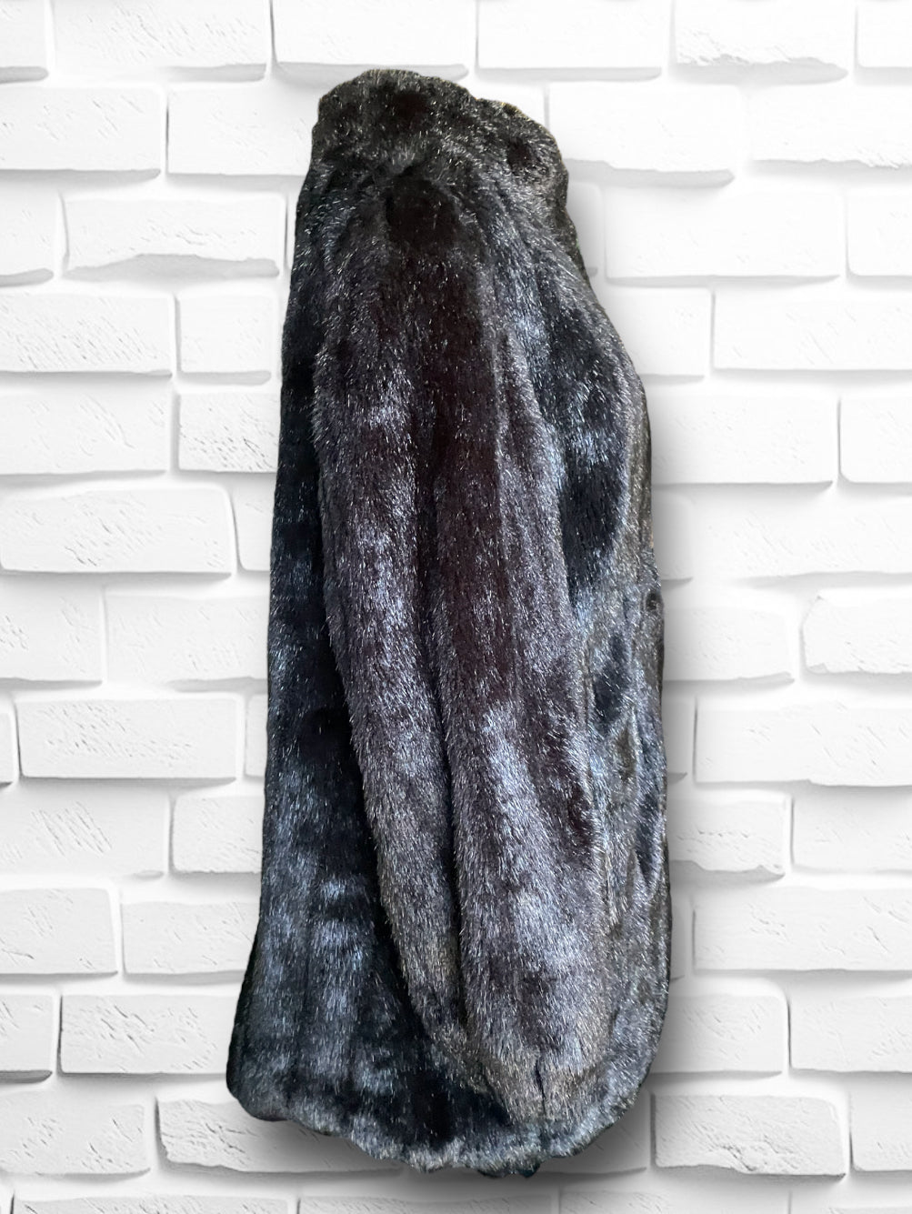 Amazing vintage 1980’s Jordache designer deep chocolate brown fuzzy faux fur 3/4 length overcoat jacket.  Has one large abstract polygon brown button at the neck and 3 crochet covered hook and eye closures. Vertical sewn “stripes” of the fur and two pockets on either side.  Inner lining is stamped Jordache repeating. Has a scalloped edge at the sleeve and hem.  Also has an inner tag stating “Made in USA” and 50% Modacrylic and 50% Acrylic. No damage or condition issues.