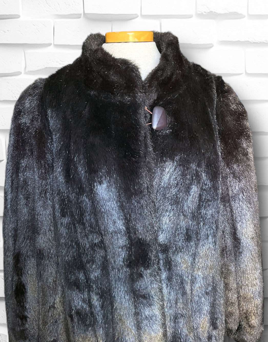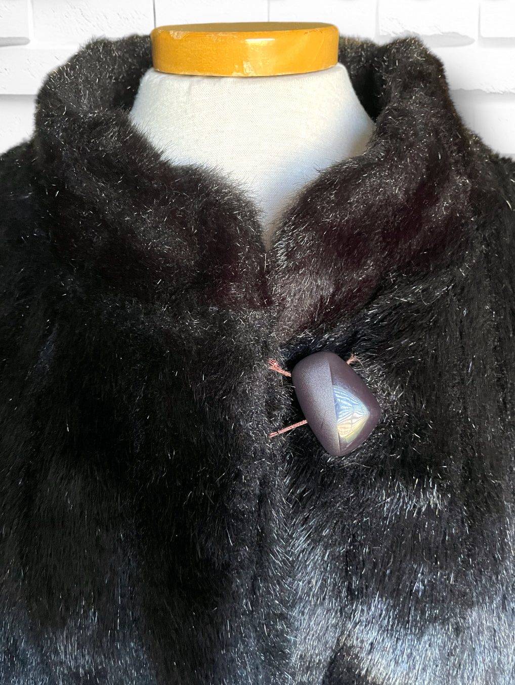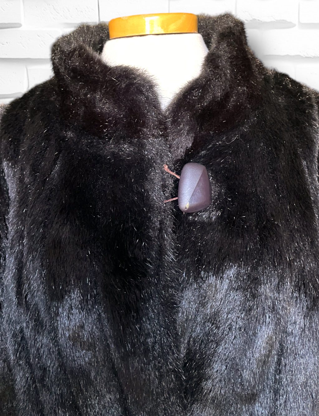 Amazing vintage 1980’s Jordache designer deep chocolate brown fuzzy faux fur 3/4 length overcoat jacket.  Has one large abstract polygon brown button at the neck and 3 crochet covered hook and eye closures. Vertical sewn “stripes” of the fur and two pockets on either side.  Inner lining is stamped Jordache repeating. Has a scalloped edge at the sleeve and hem.  Also has an inner tag stating “Made in USA” and 50% Modacrylic and 50% Acrylic. No damage or condition issues.