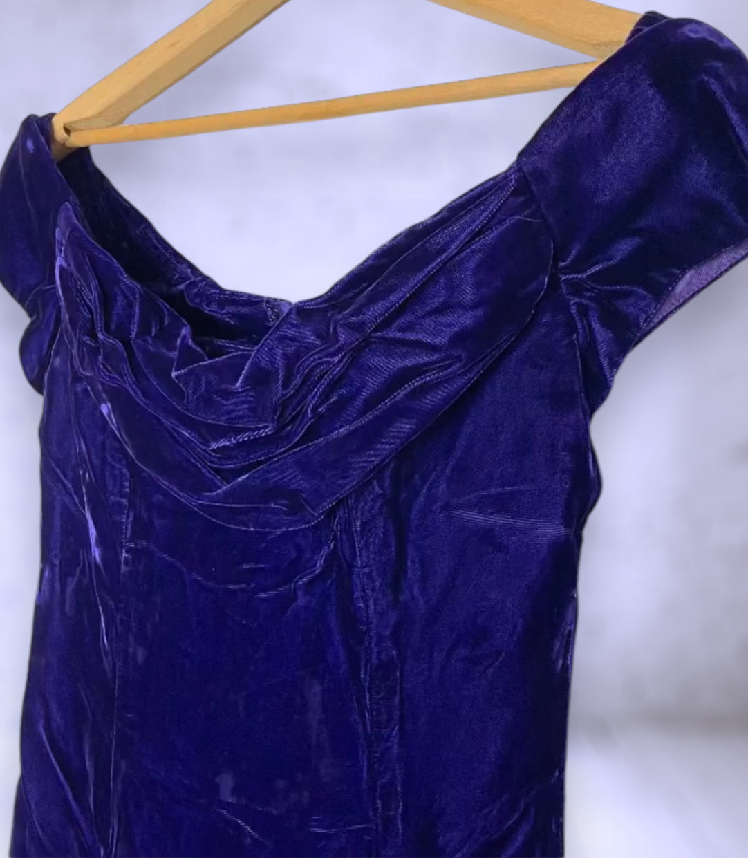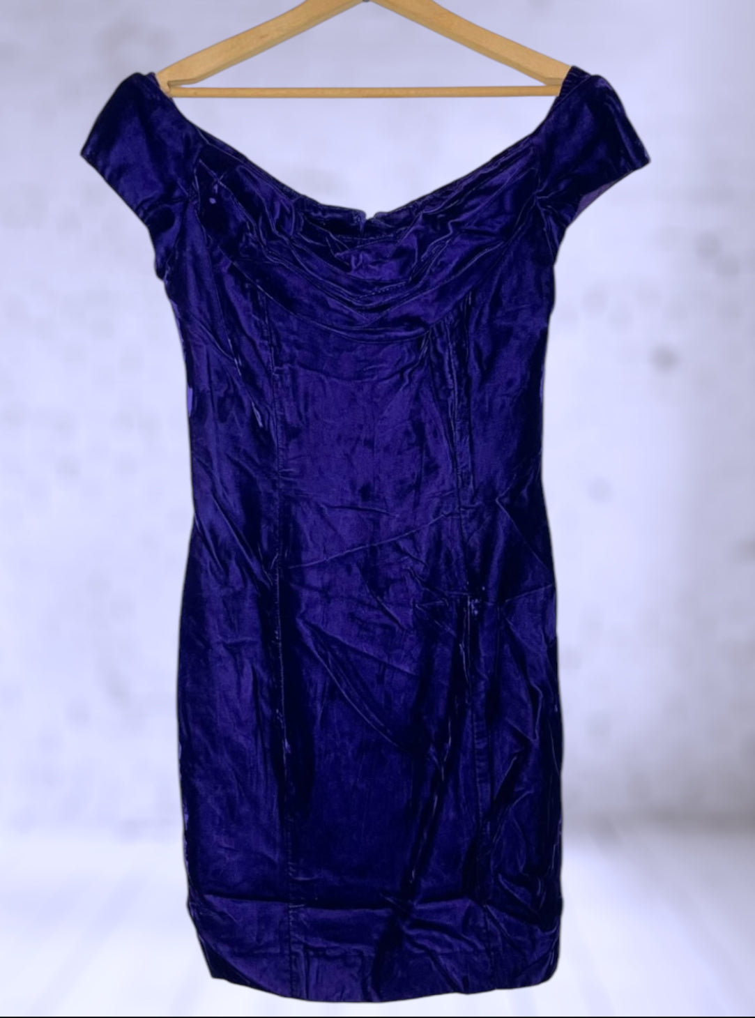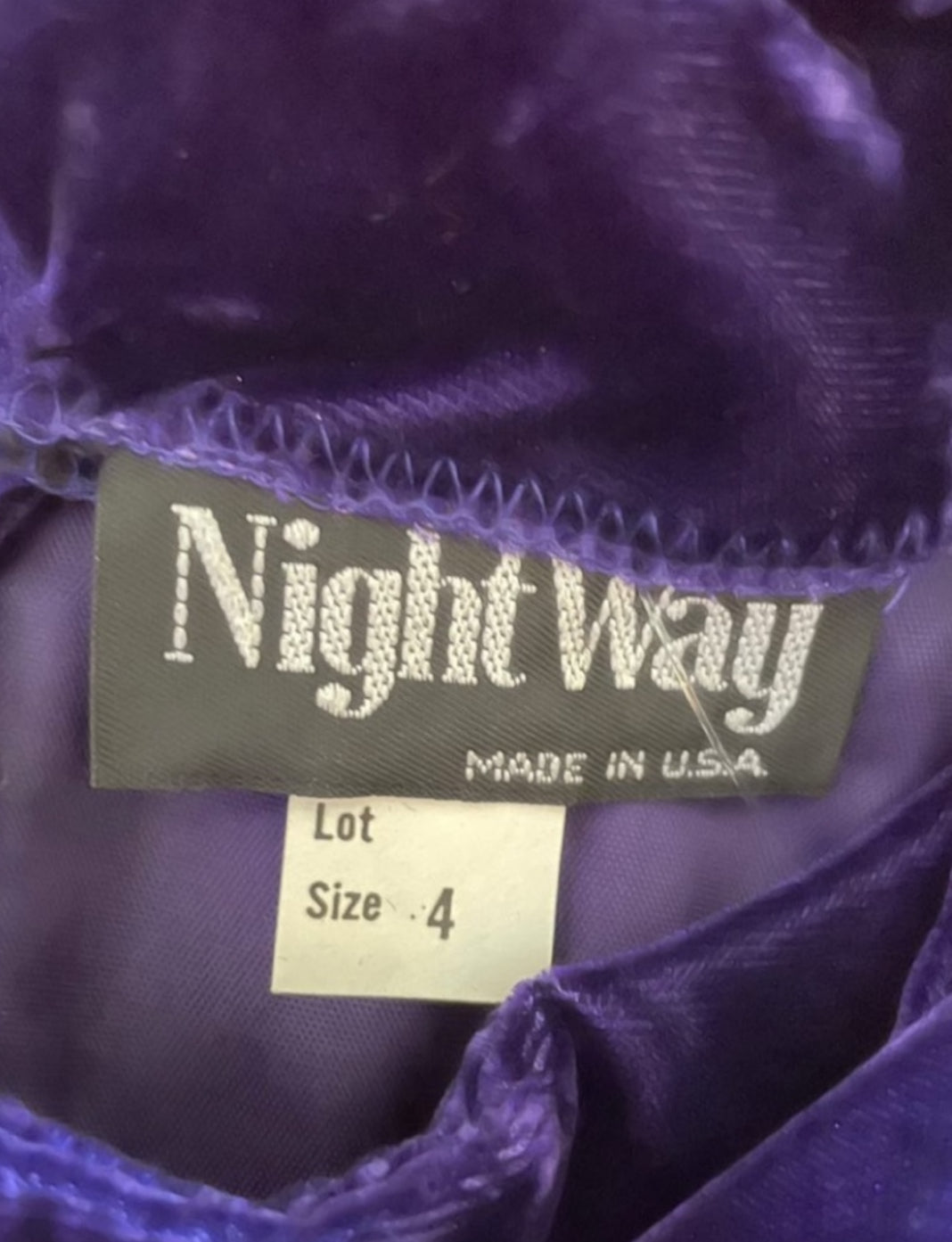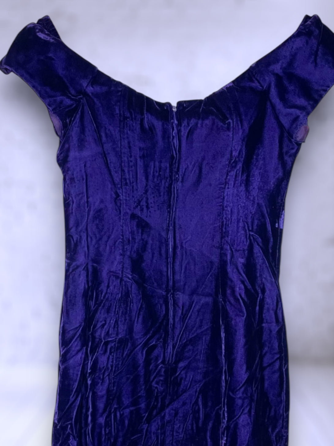 Beautiful indigo purple blue velvet short mini dress. Short sleeve off the shoulder with a faux boat style neckline and boning in the sleeve and bust. Back has a zipper closure that is hidden. Has a small slit in the back center. Fully lined on the inside. Label is “Nightway” / “Made in USA” / Size 4.